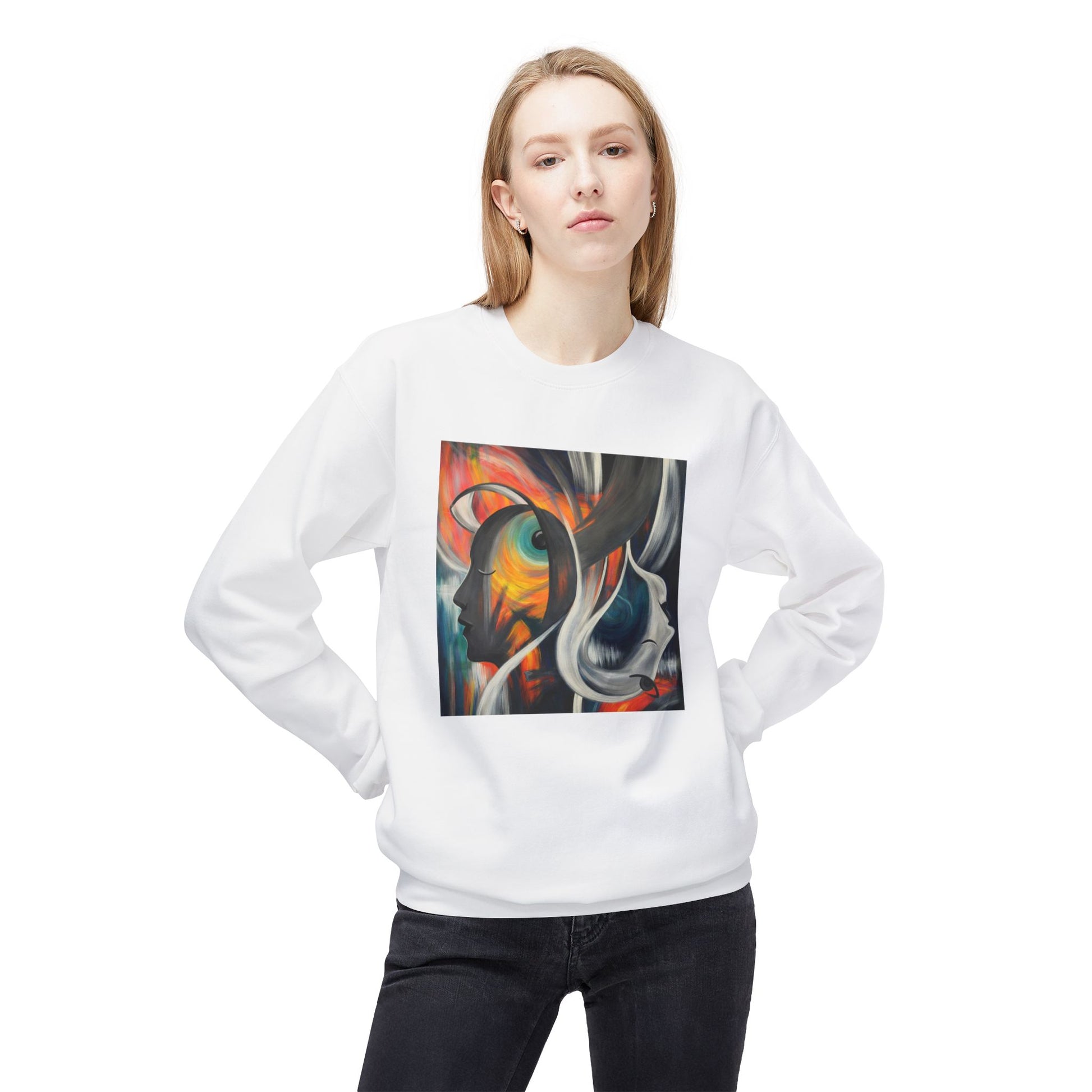 This sweatshirt showcases an abstract expression portrait on the front, capturing motion, emotion, and depth through layered color and form. The artwork stands out as a centerpiece while the relaxed silhouette keeps the overall look wearable and refined. Finished with a blank back, it delivers a clean, modern balance between comfort and artistic expression.