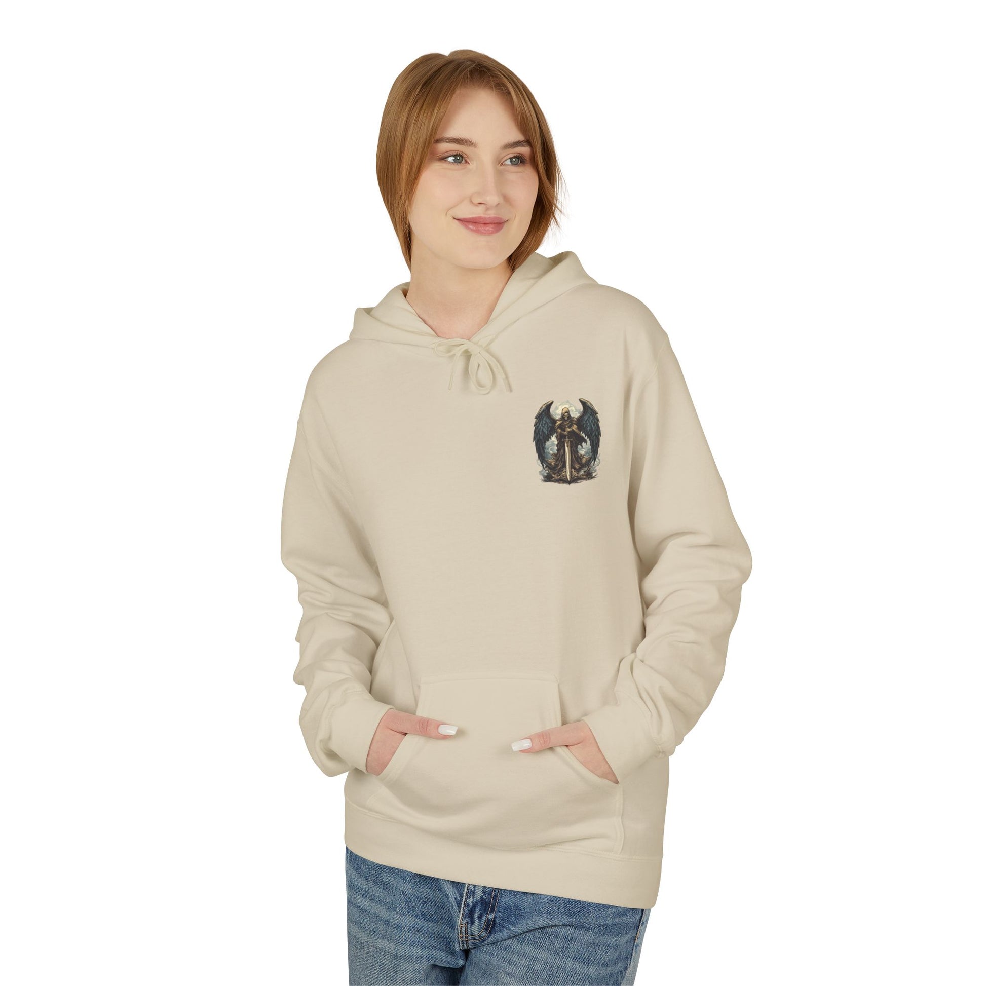 This hoodie features a detailed guardian angel illustration printed only on the front chest area.