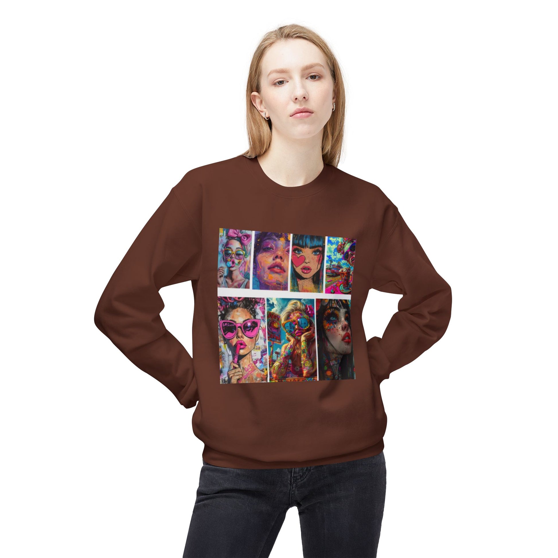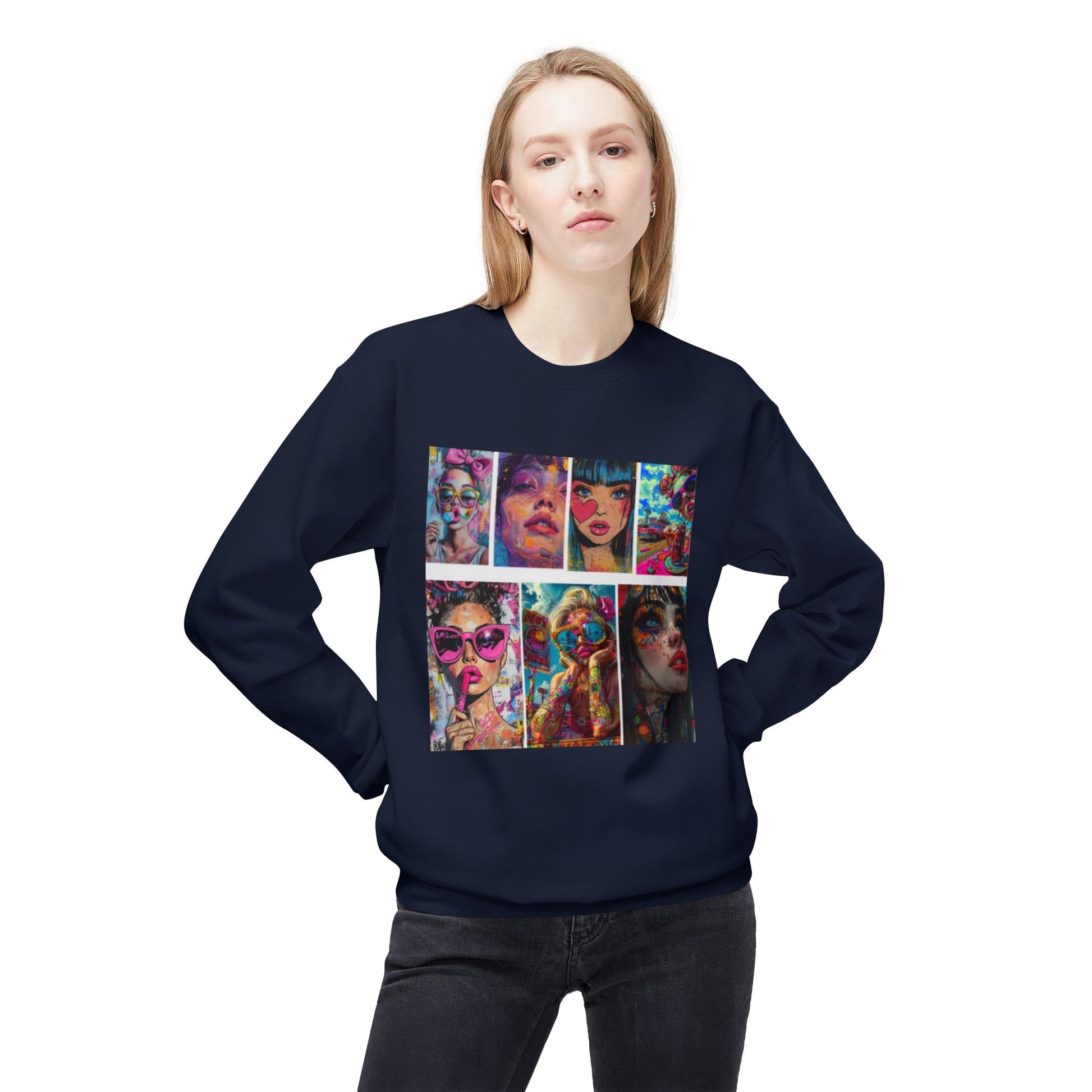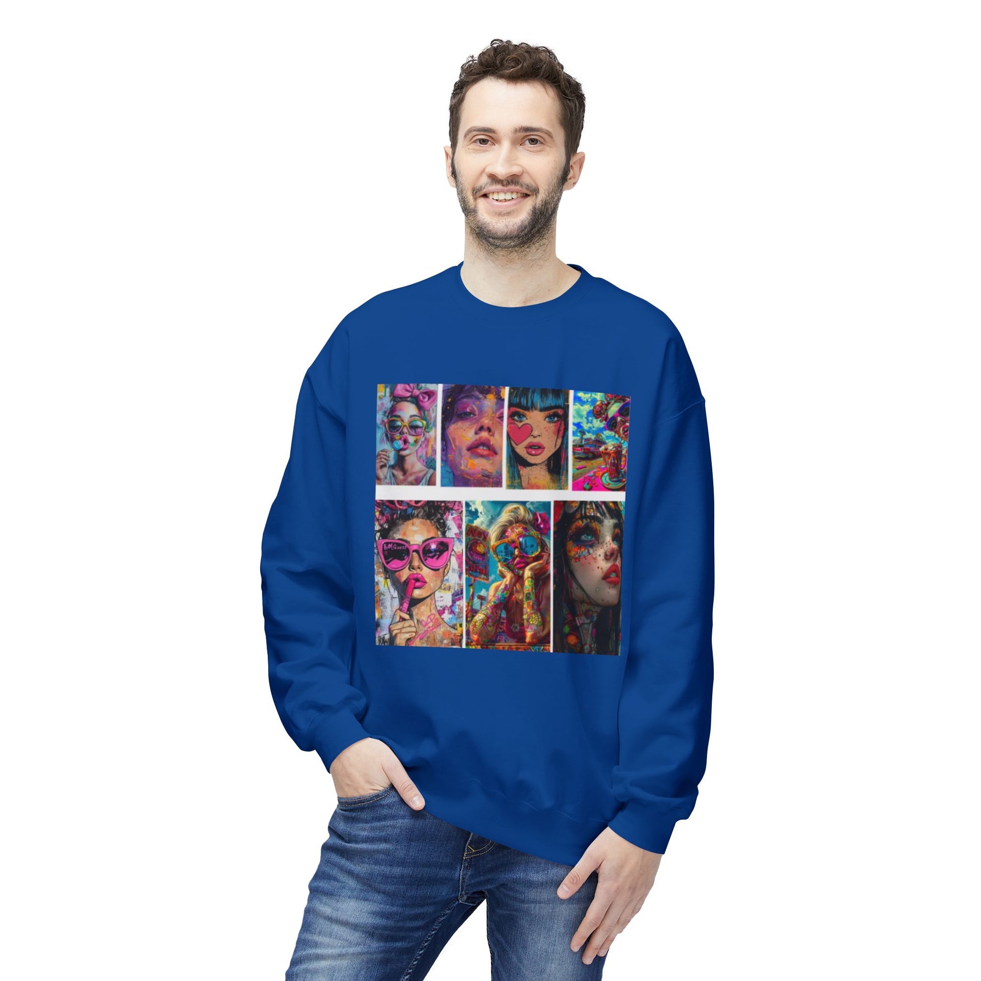 A statement crewneck designed with a colorful pop-art fashion graphic.