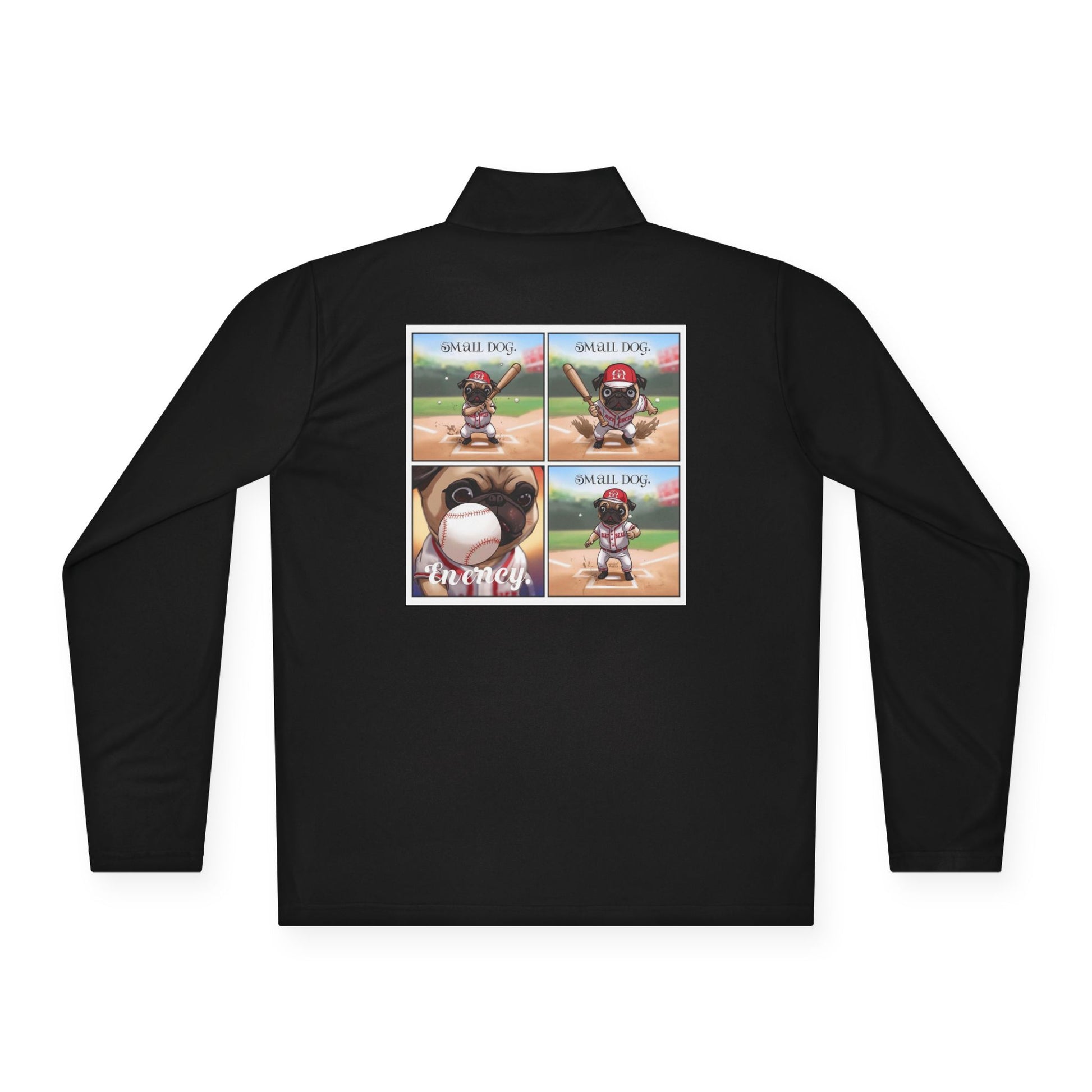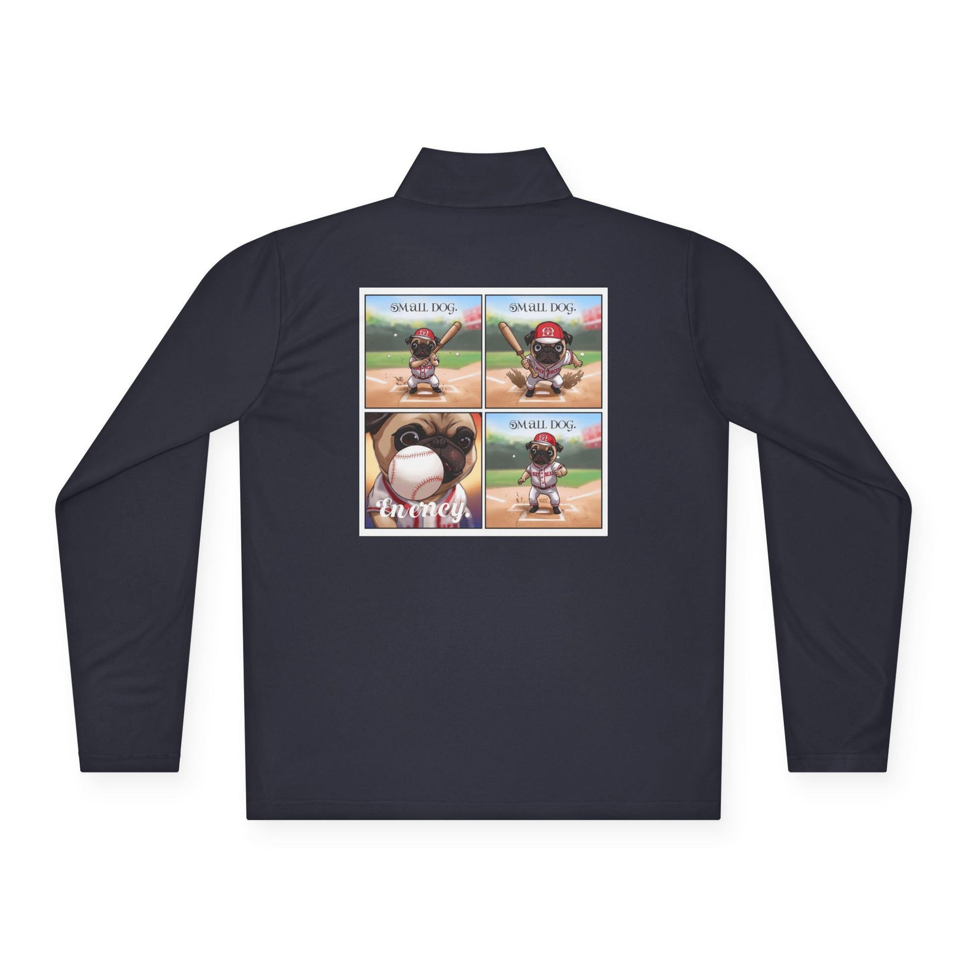 This quarter zip features a small embroidered-style pug baseball emblem on the left chest and a large centered four-panel graphic on the back