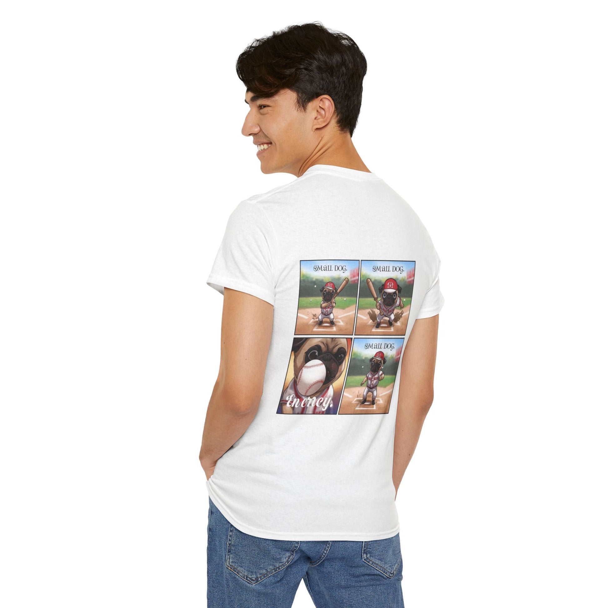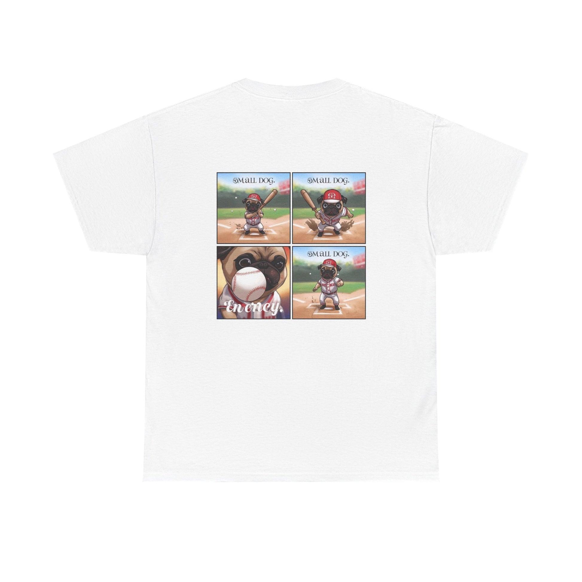 The back design showcases playful baseball scenes with a bold “Small Dog” theme and the word “Energy” creating a fun high-impact statement
