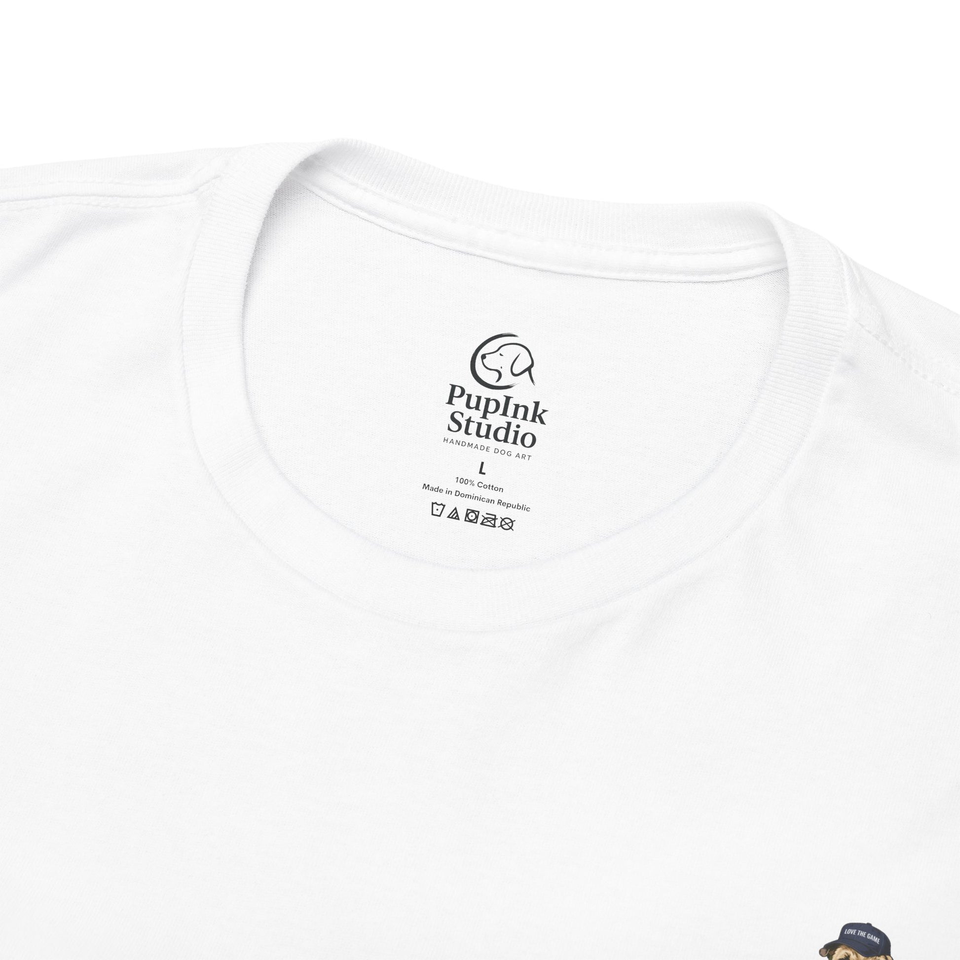 This T-shirt features a small embroidered-style dog emblem on the left chest and a large four-panel illustrated graphic on the back