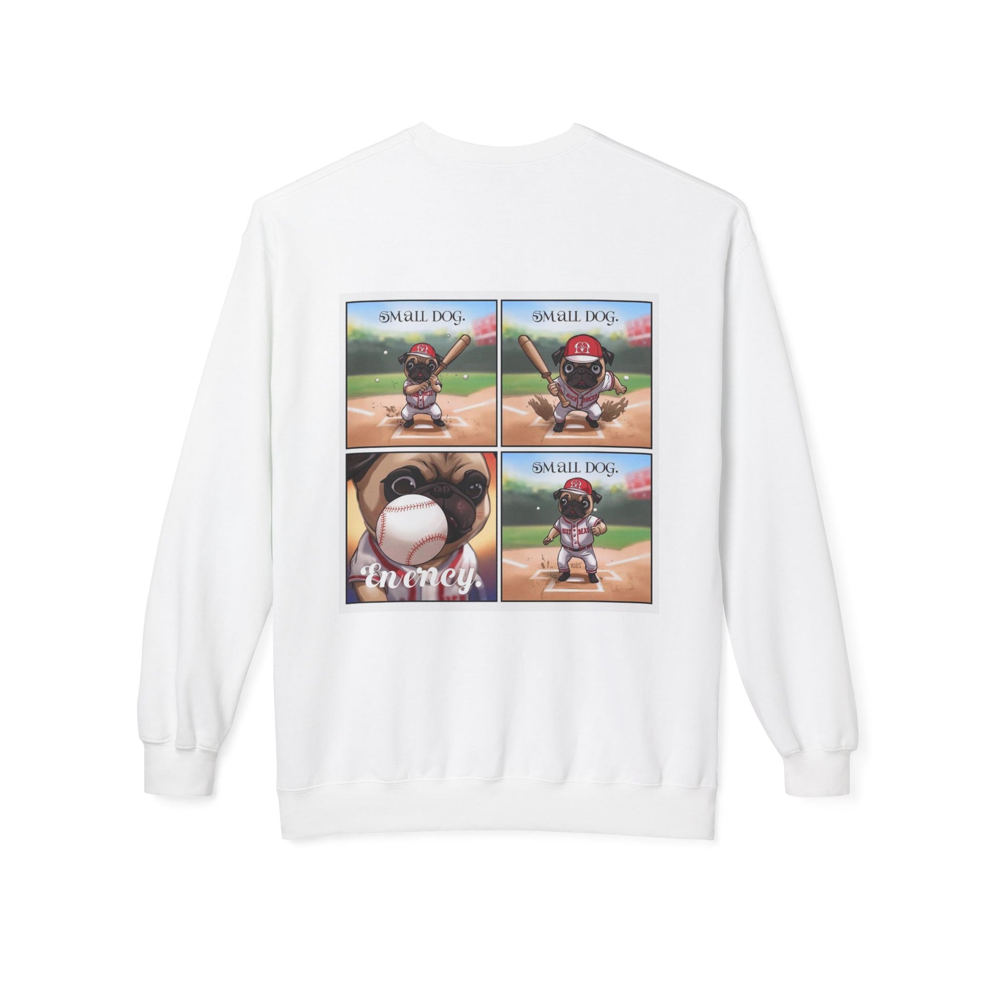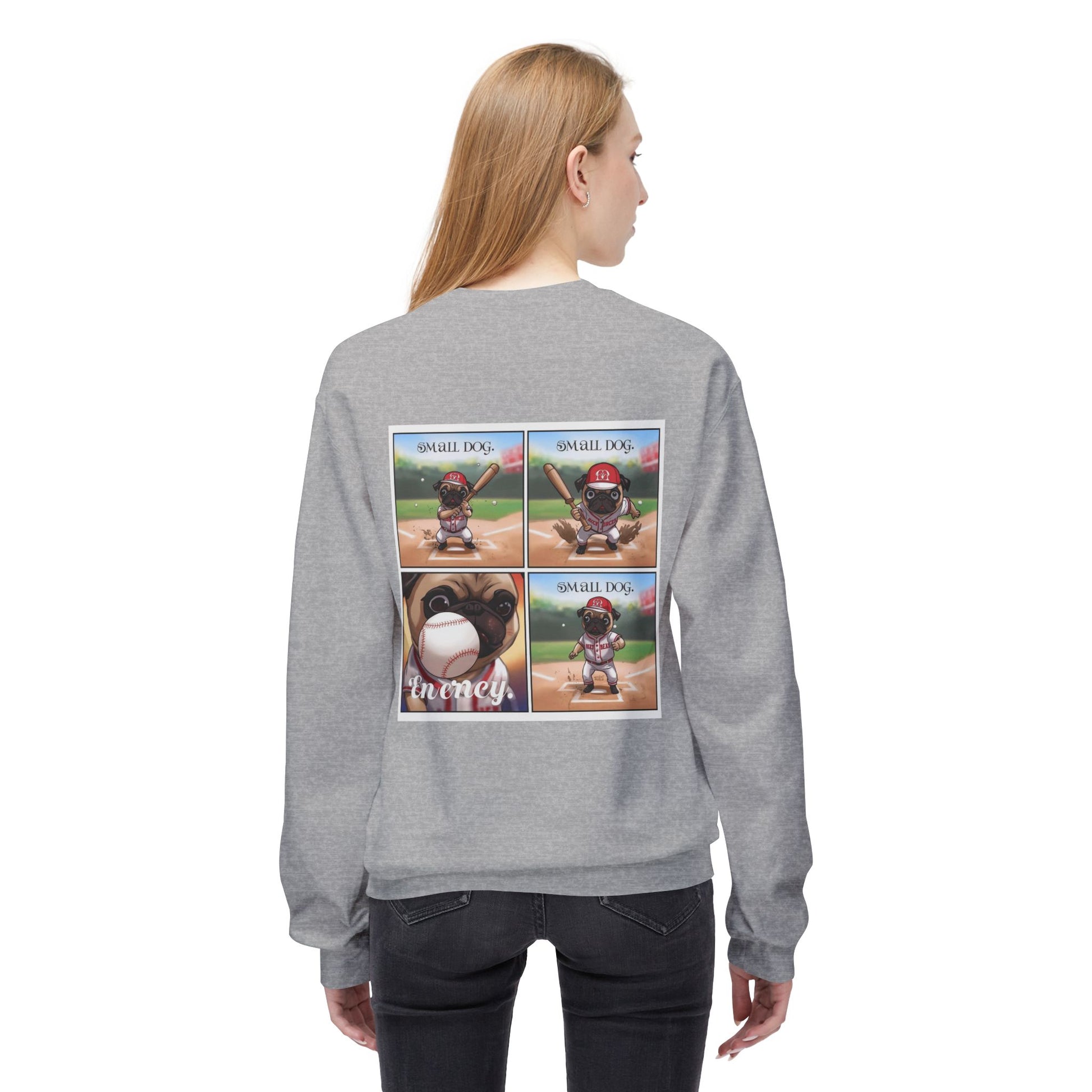 This crewneck sweatshirt features a small embroidered-style dog emblem on the left chest and a large multi-panel comic-style graphic on the back