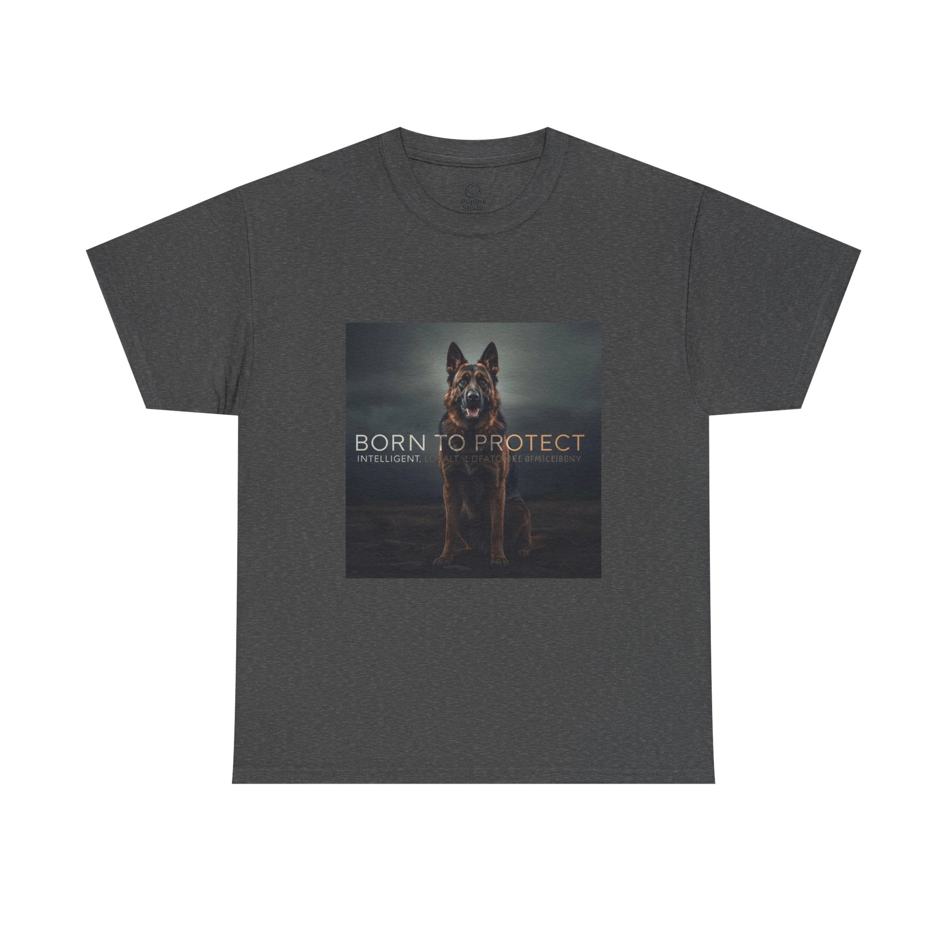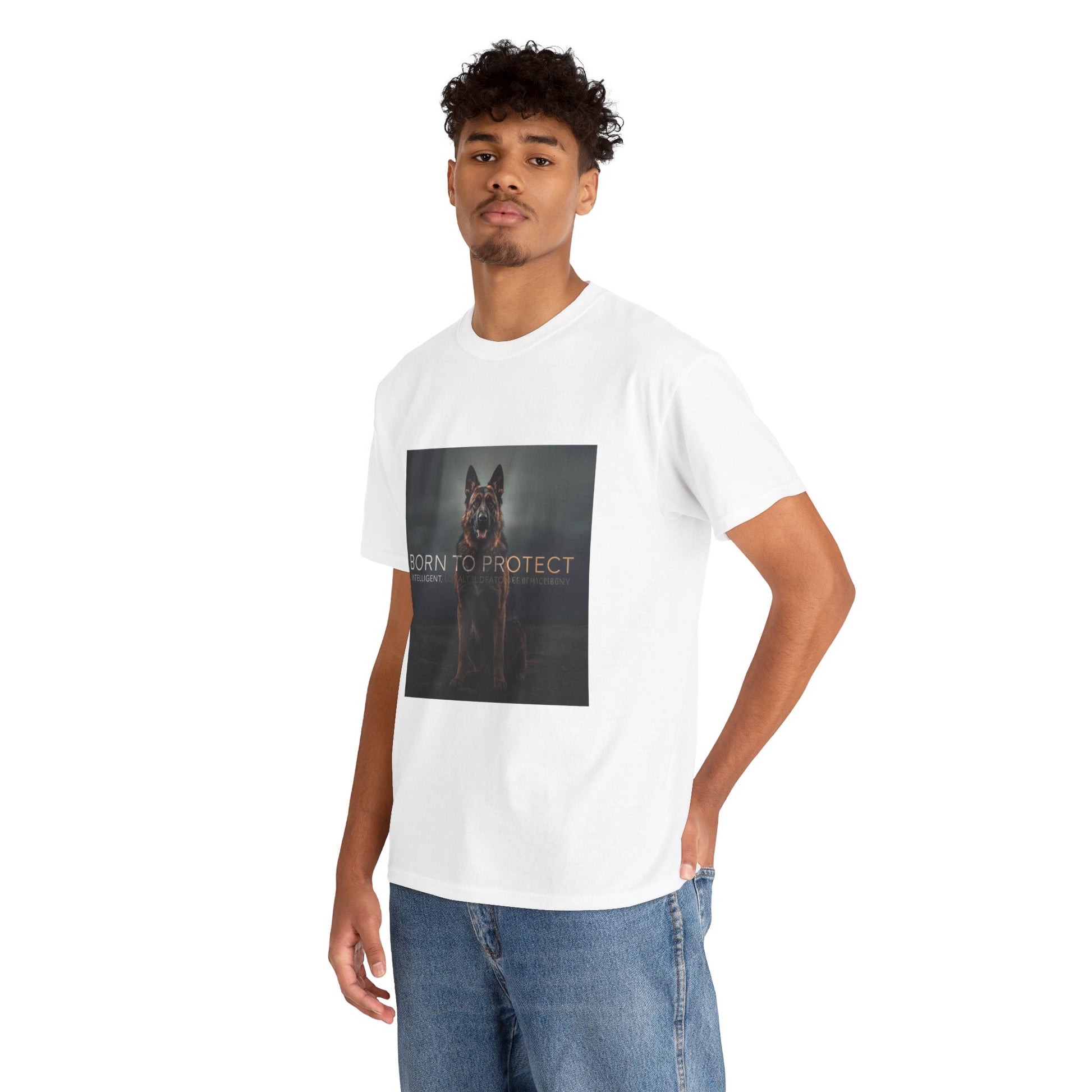This T-shirt features a large centered front graphic showcasing a German Shepherd with the statement “BORN TO PROTECT”.