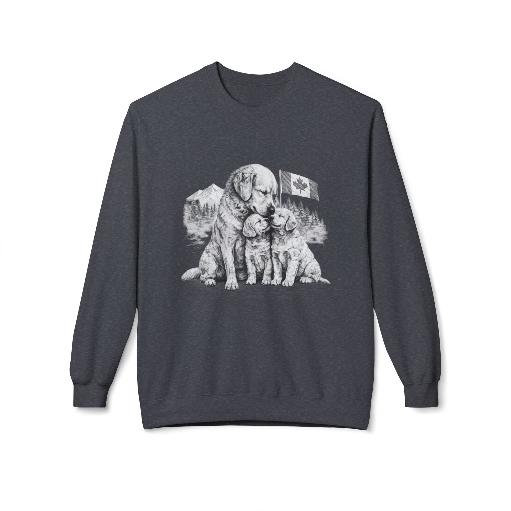 This sweatshirt features a front-only illustrated dog family graphic that symbolizes loyalty, warmth, and protection.
