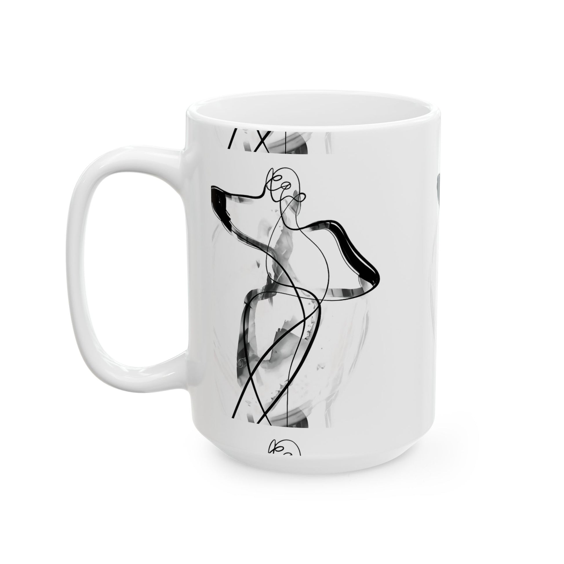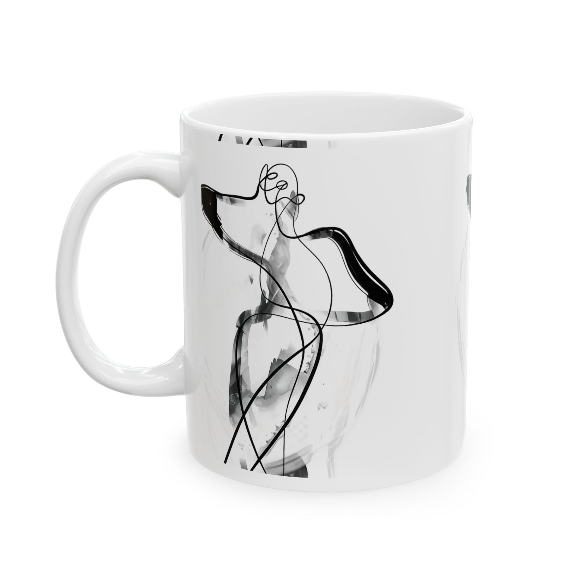 This mug features a monochrome ink figure artwork wrapped around the surface, showcasing fluid motion and expressive line work. The abstract human form feels organic and balanced, creating a calm yet emotionally resonant visual. Printed cleanly on a white ceramic base, the design maintains a refined, gallery-inspired presence that enhances daily coffee or tea moments without visual noise.