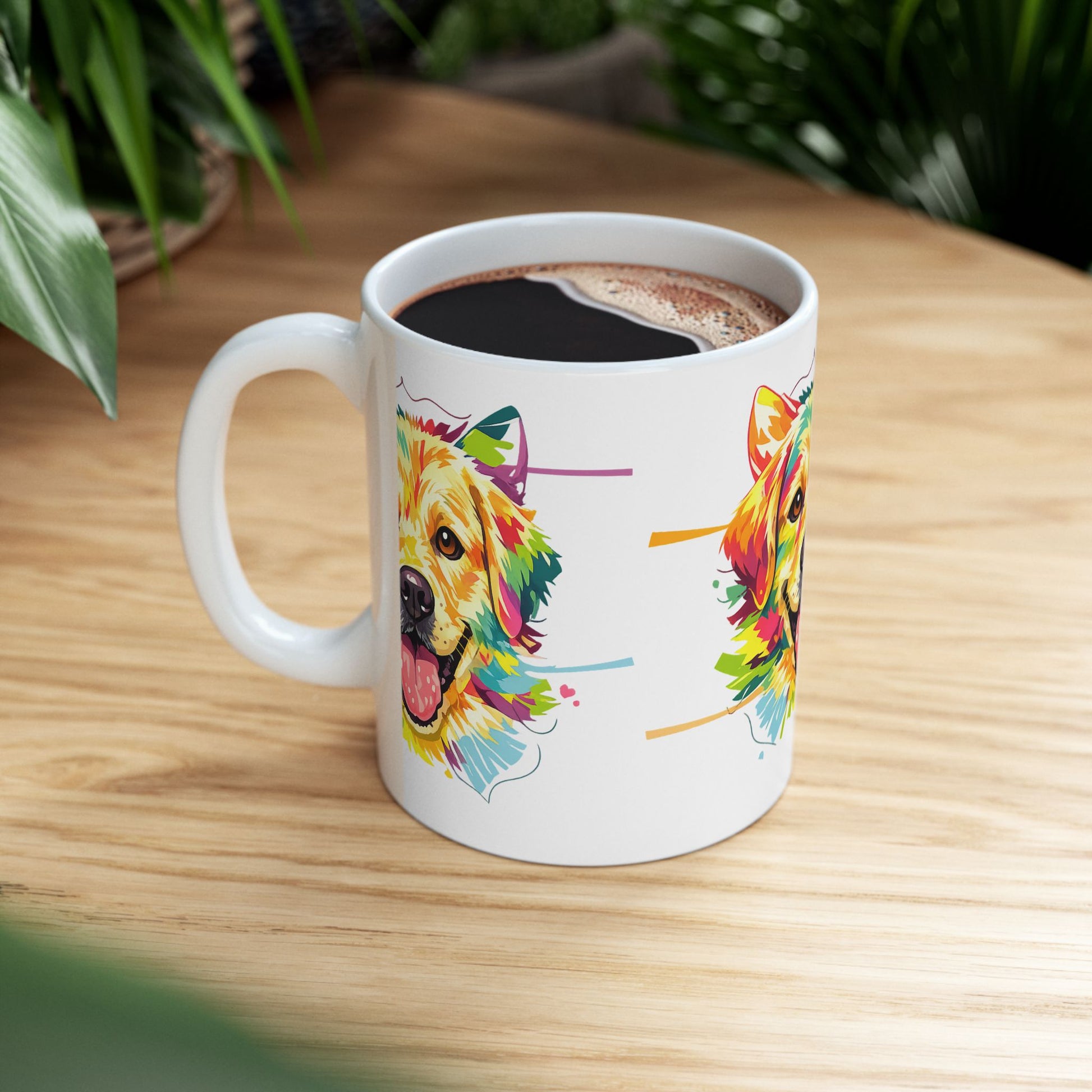 A joyful golden retriever portrait that brings warmth and color to every sip