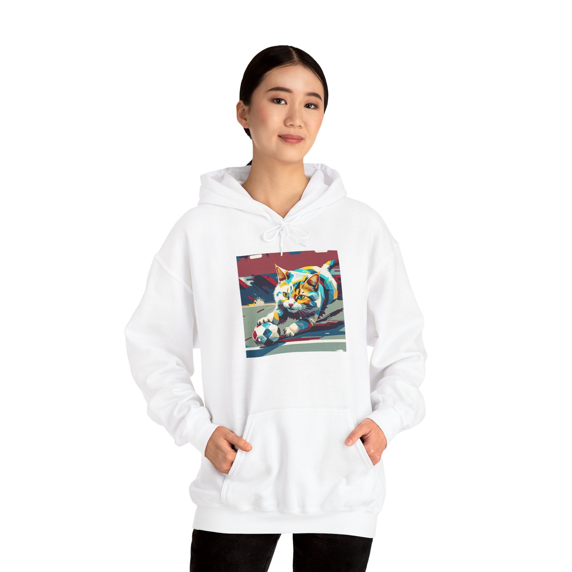 This hoodie features a vibrant, pop-art style cat illustration bursting with color and personality.
