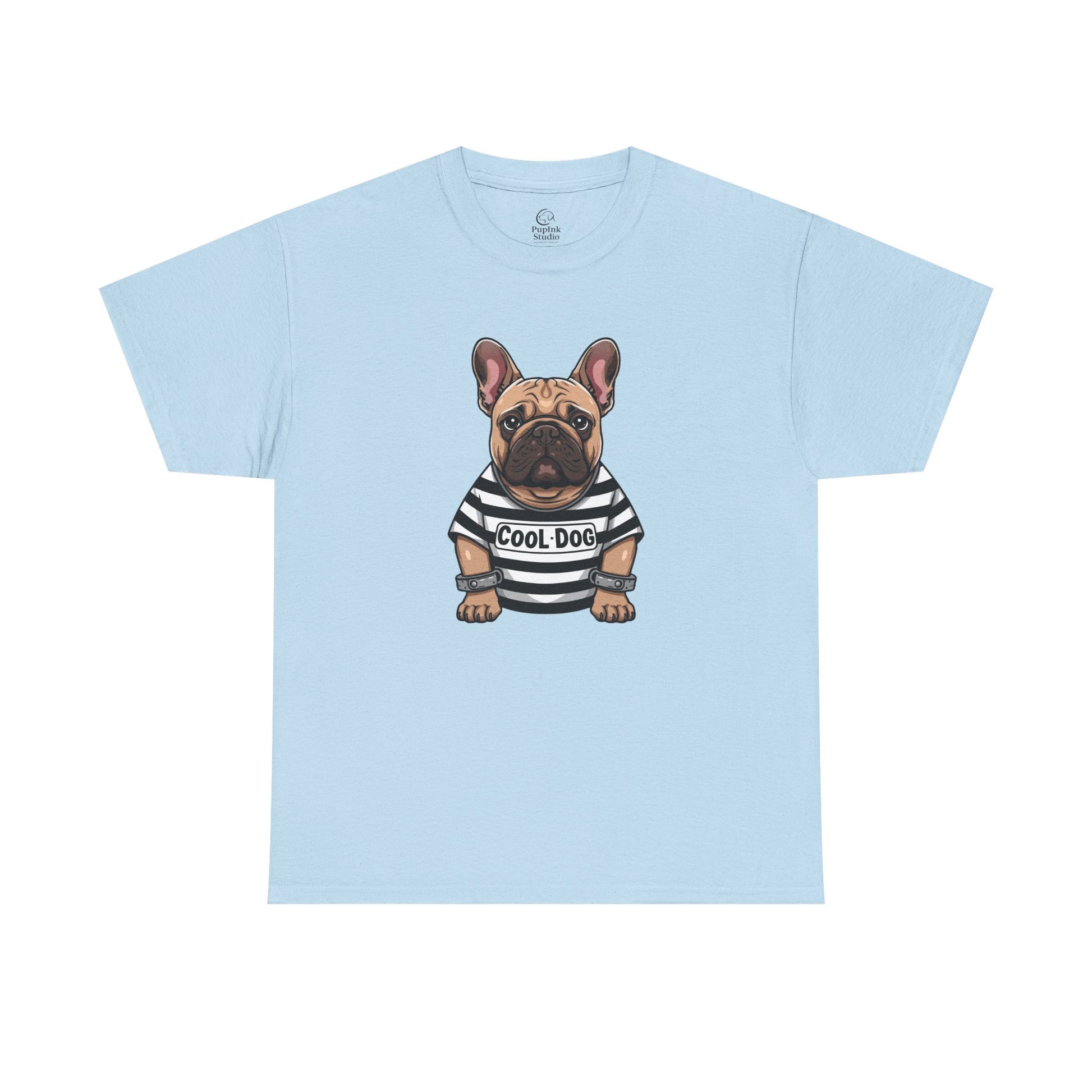 This graphic T-shirt features a confident French bulldog wearing a striped “COOL DOG” tee—a design that instantly communicates personality without saying a word.