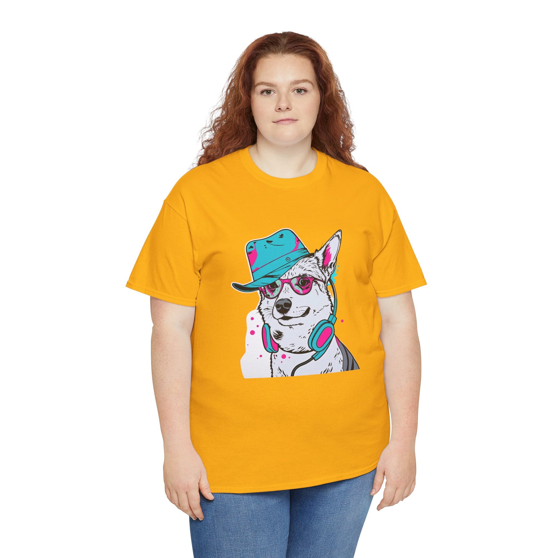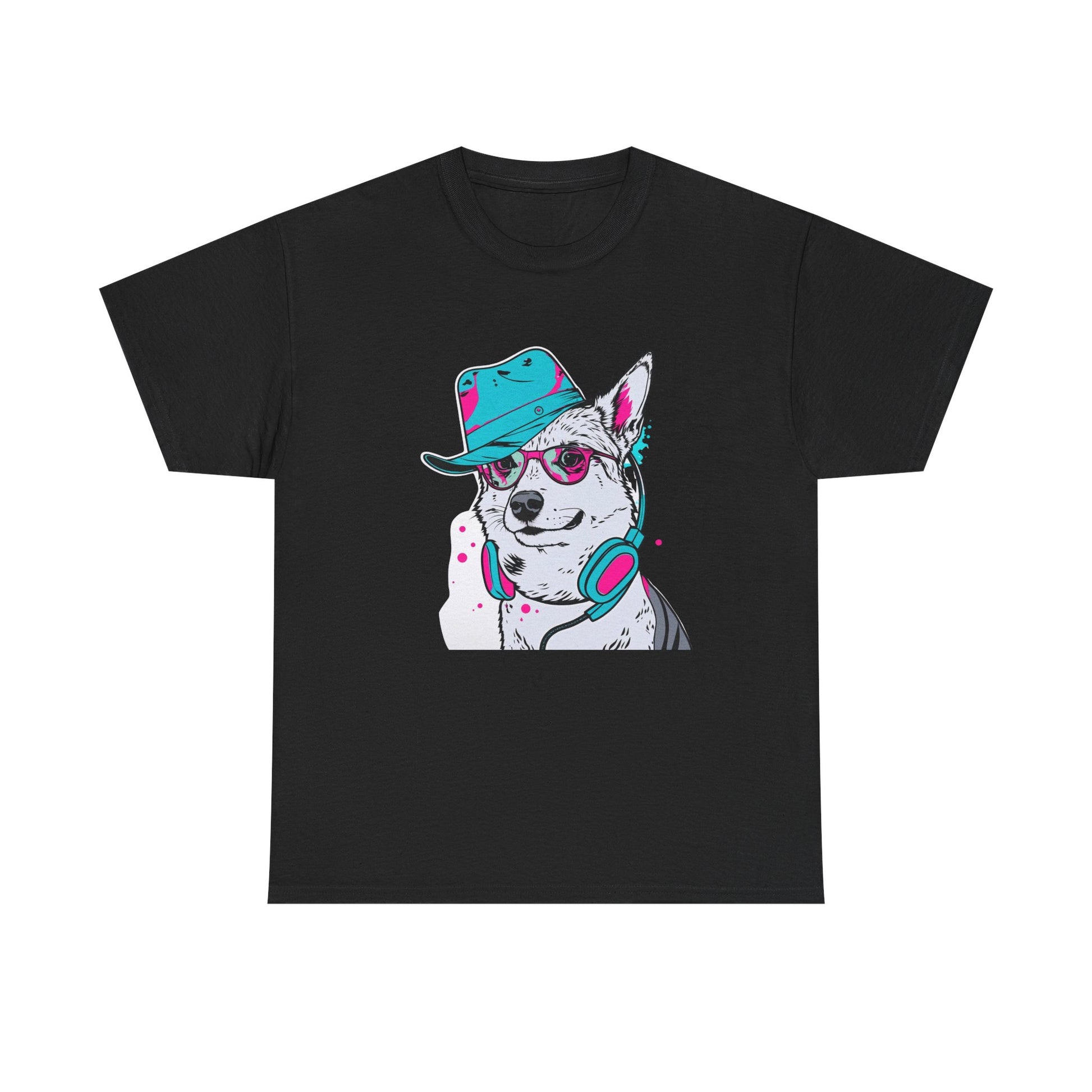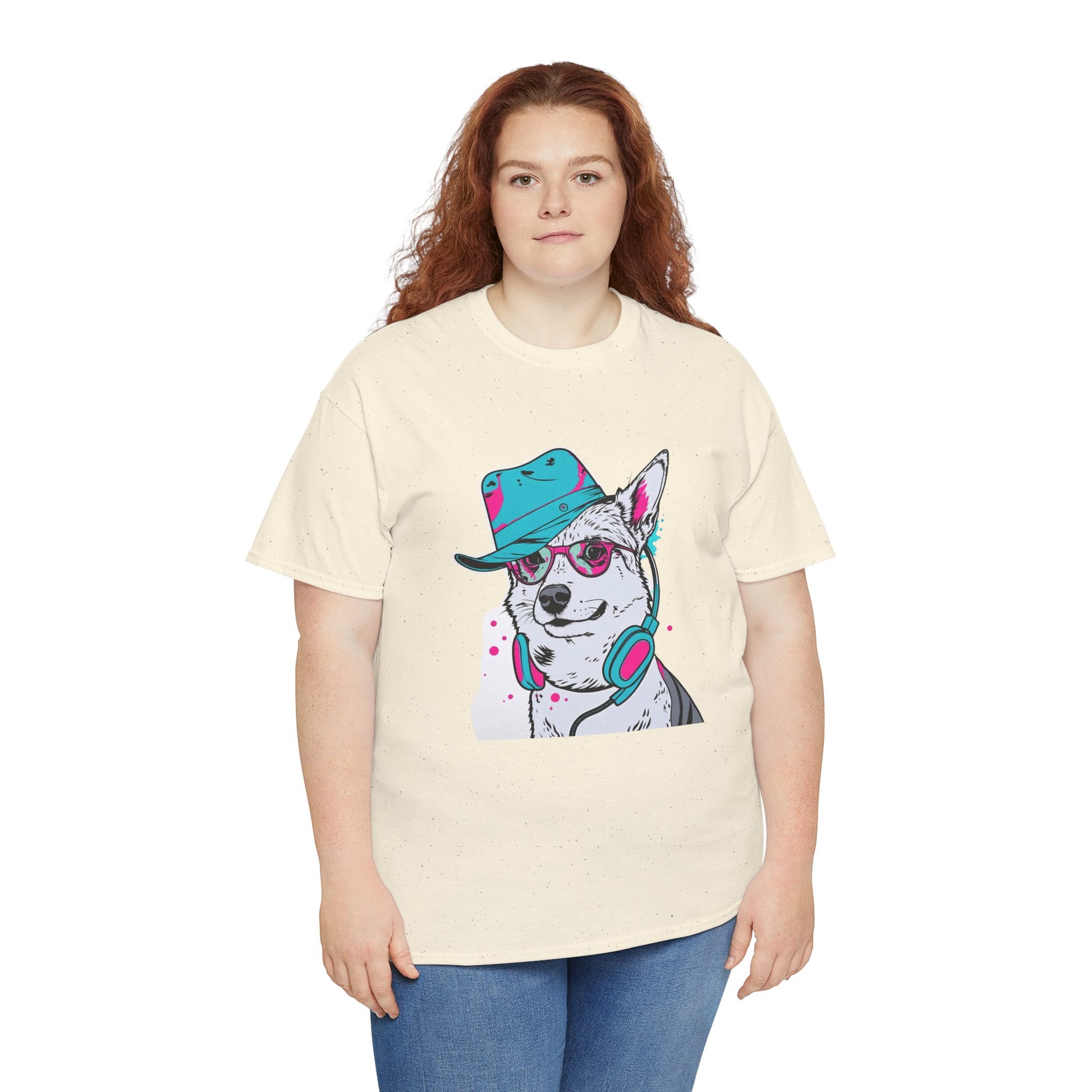 This cotton T-shirt features a bold husky illustration styled with a hat, sunglasses, and headphones, creating a fun and modern streetwear vibe.