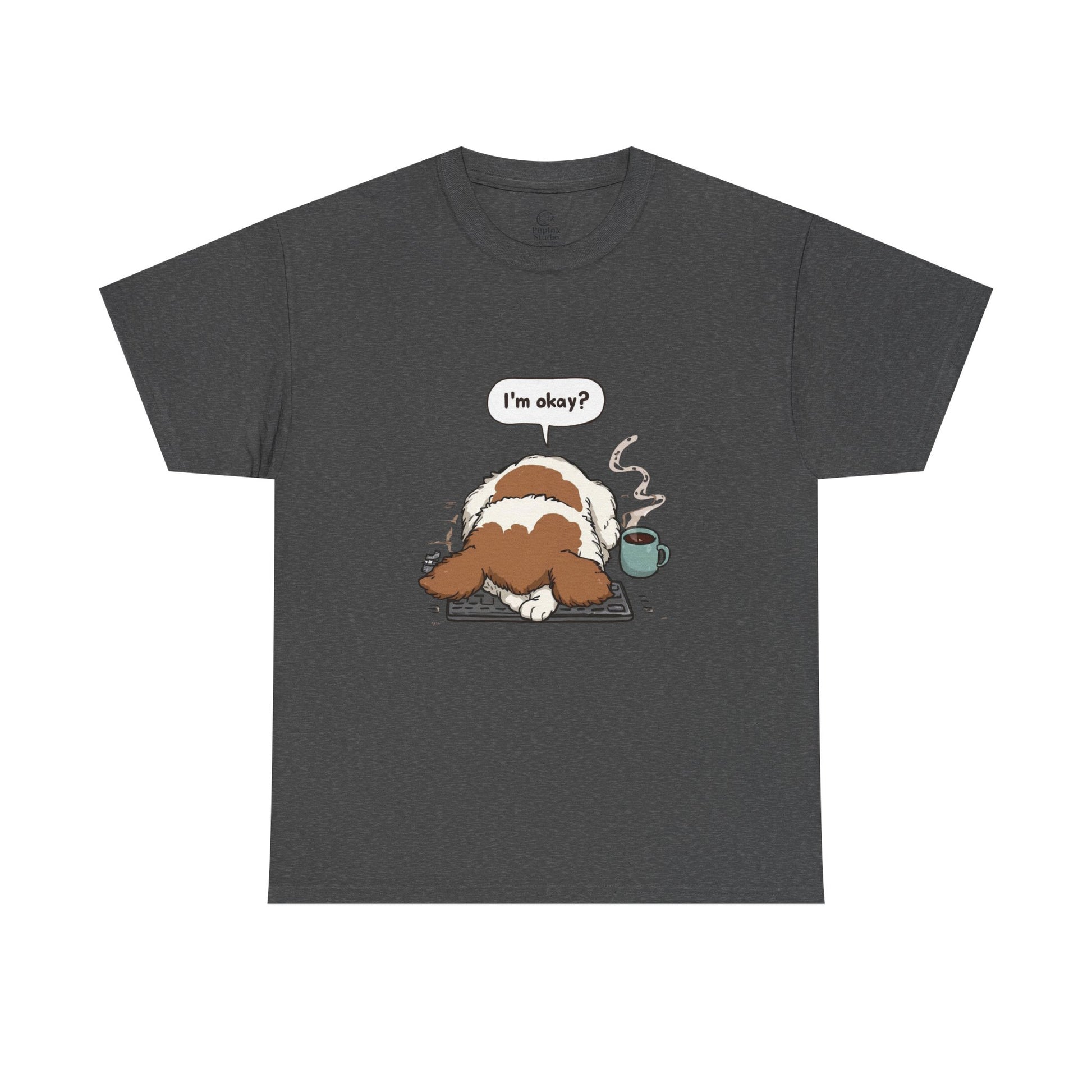 This t-shirt features the same playful dog illustration printed only on the front, capturing a familiar “I’m okay?” moment with humor and warmth.