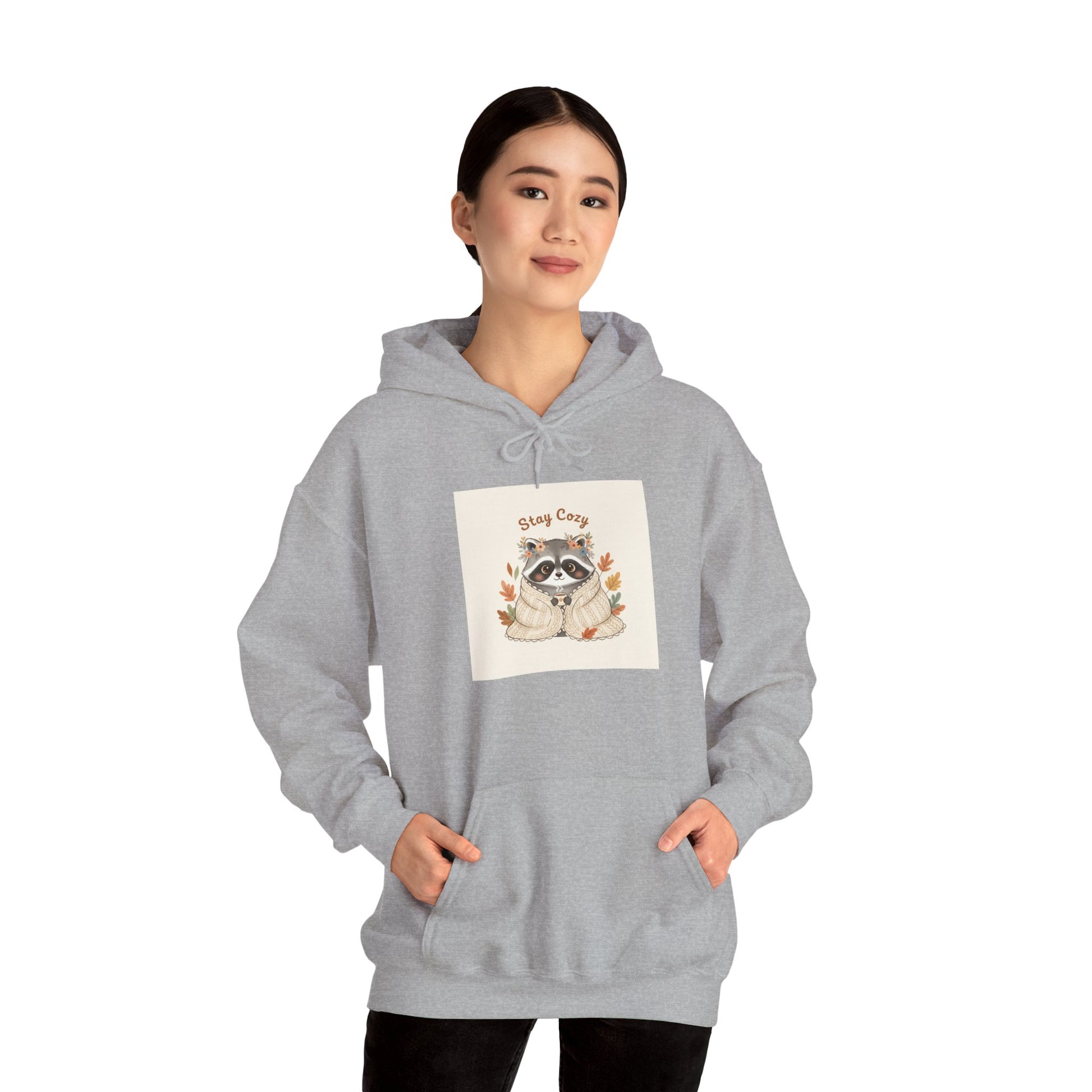This hoodie features a centered square graphic of an adorable raccoon wrapped in a cozy sweater, paired with the gentle message “Stay Cozy.”