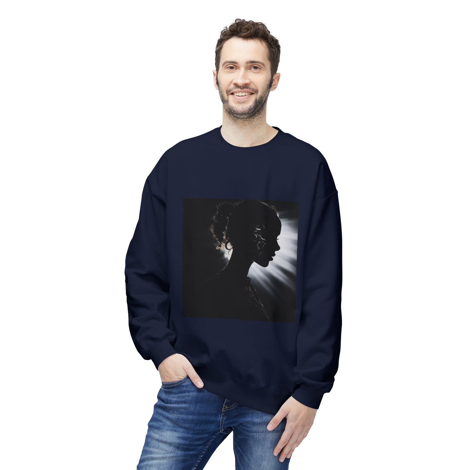 This sweatshirt showcases the same centered portrait artwork on the front only