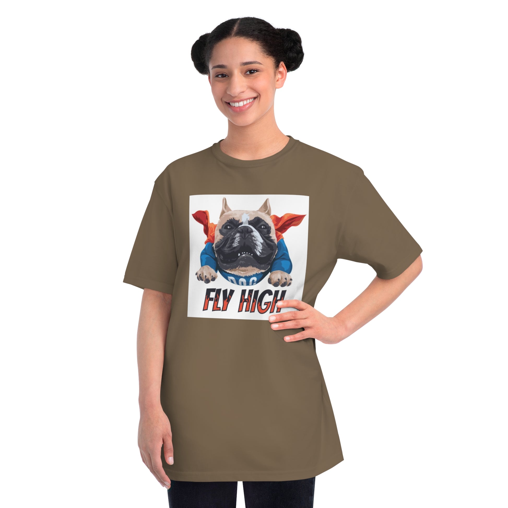 This organic T-shirt features a bold front graphic of a bulldog in a superhero-inspired pose, paired with the message “FLY HIGH” for a confident, motivating look.