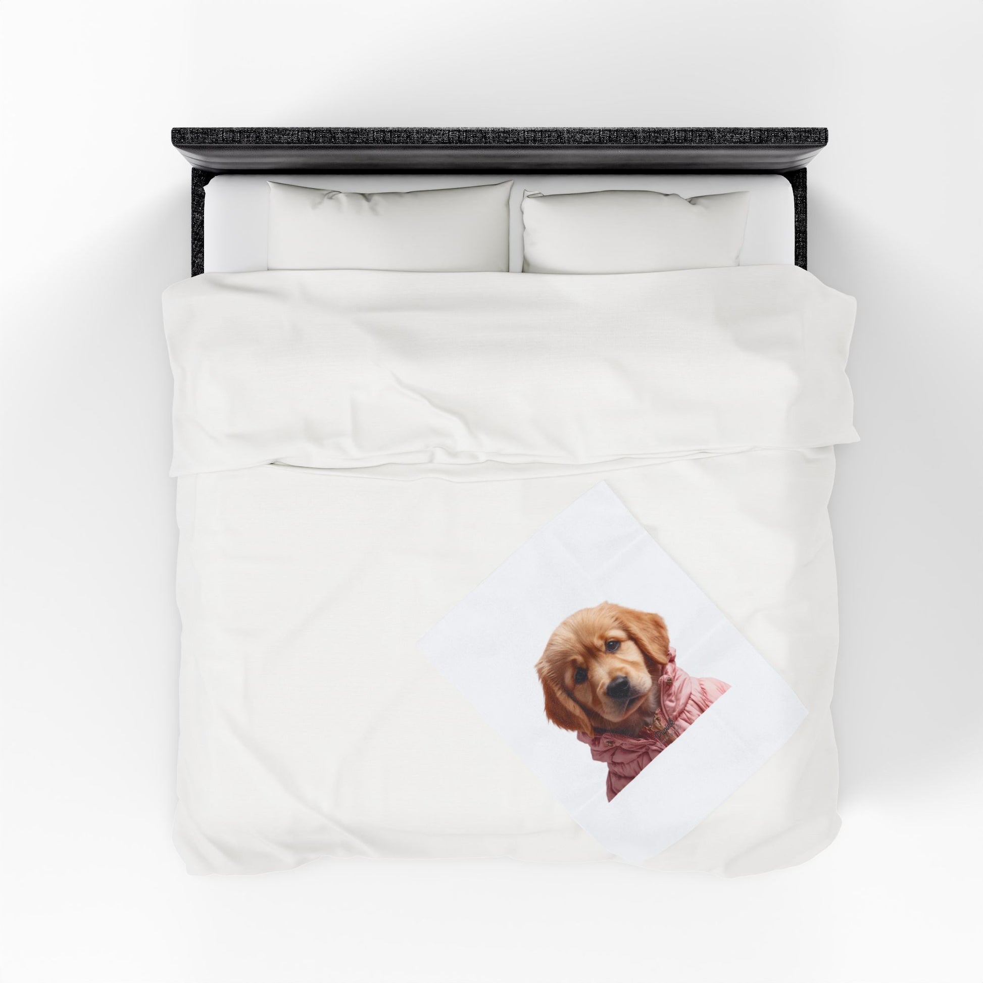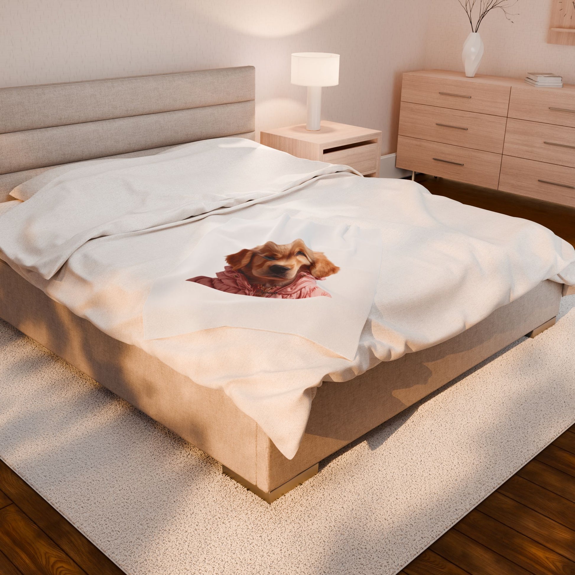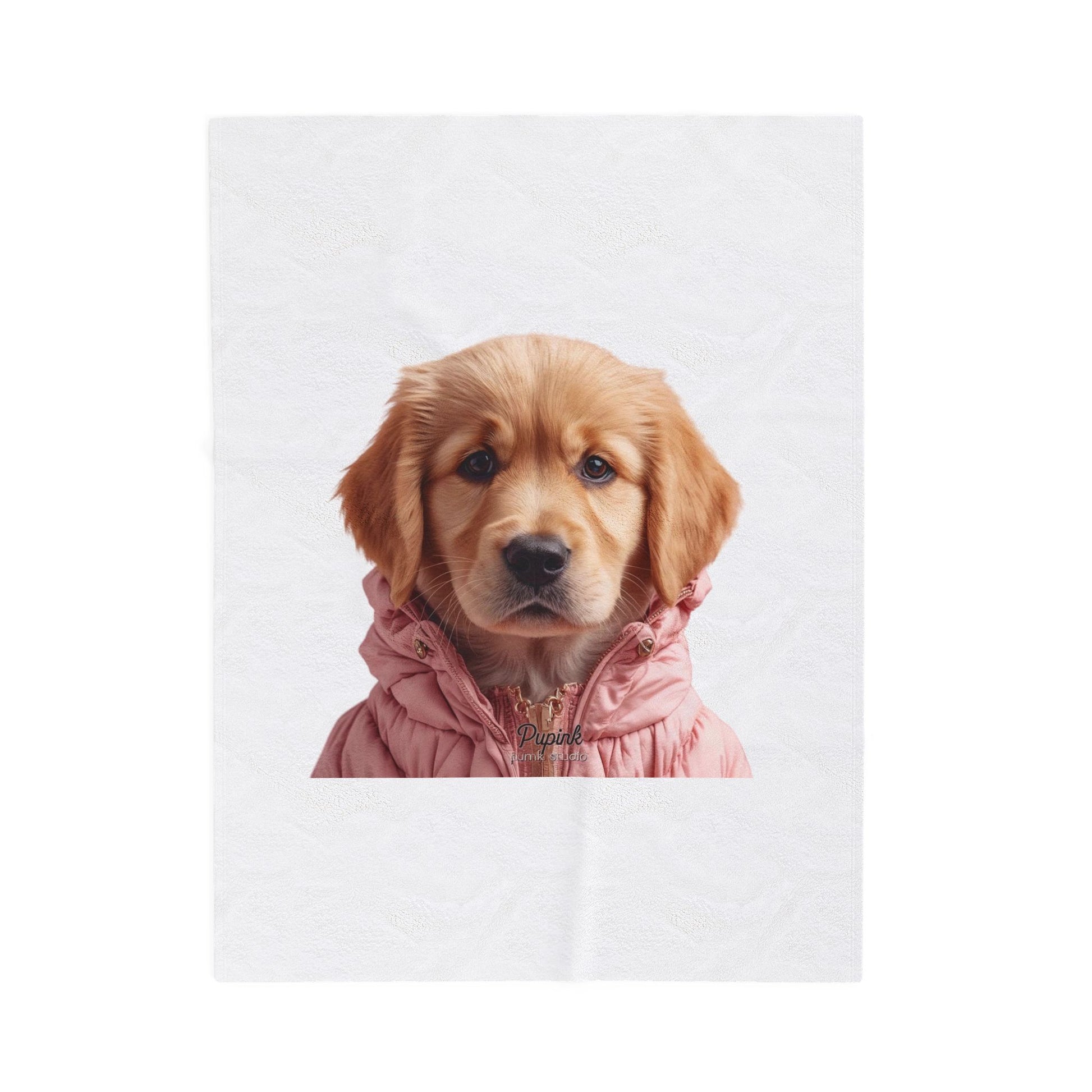 Wrap yourself in a gentle hug with this velveteen plush blanket, featuring a sweet golden retriever puppy printed in high detail on one side. The fabric is sumptuously soft with a medium-heavy weight that holds warmth without feeling bulky — perfect for curling up on the couch during an evening read or layering at the foot of the bed. The puppy’s warm eyes and cozy pink jacket give this blanket a playful, comforting presence that will brighten quiet mornings, slow weekends, or quiet moments with a cup of tea. Durable double-stitched edges keep the blanket looking neat through regular use, and the vibrant single-side print keeps the image crisp and expressive wash after wash. It’s designed for adult use and meets strict safety and chemical compliance standards, so you can enjoy the softness with peace of mind.