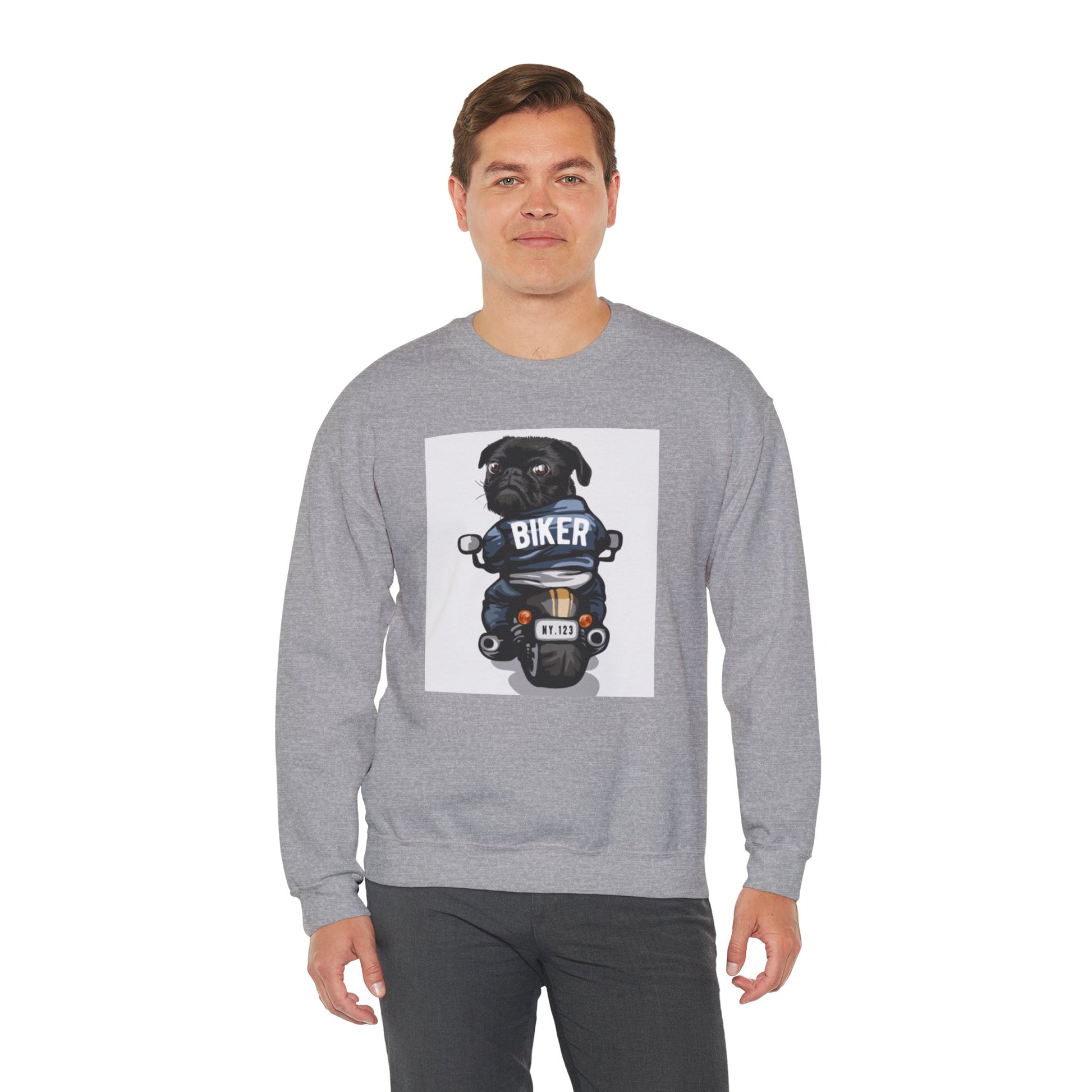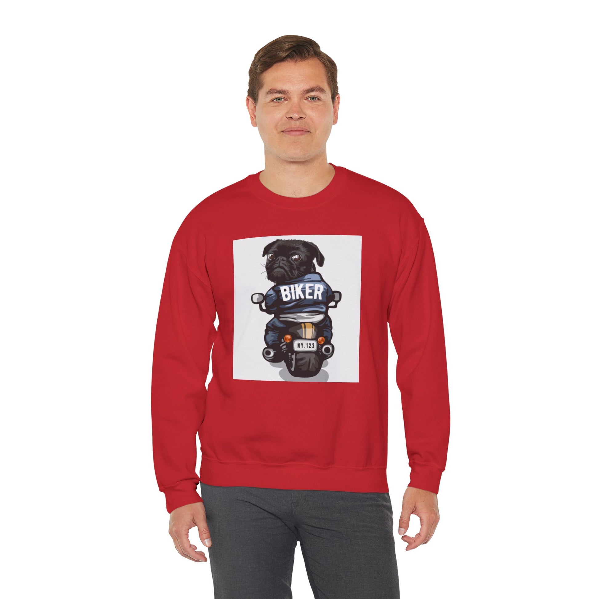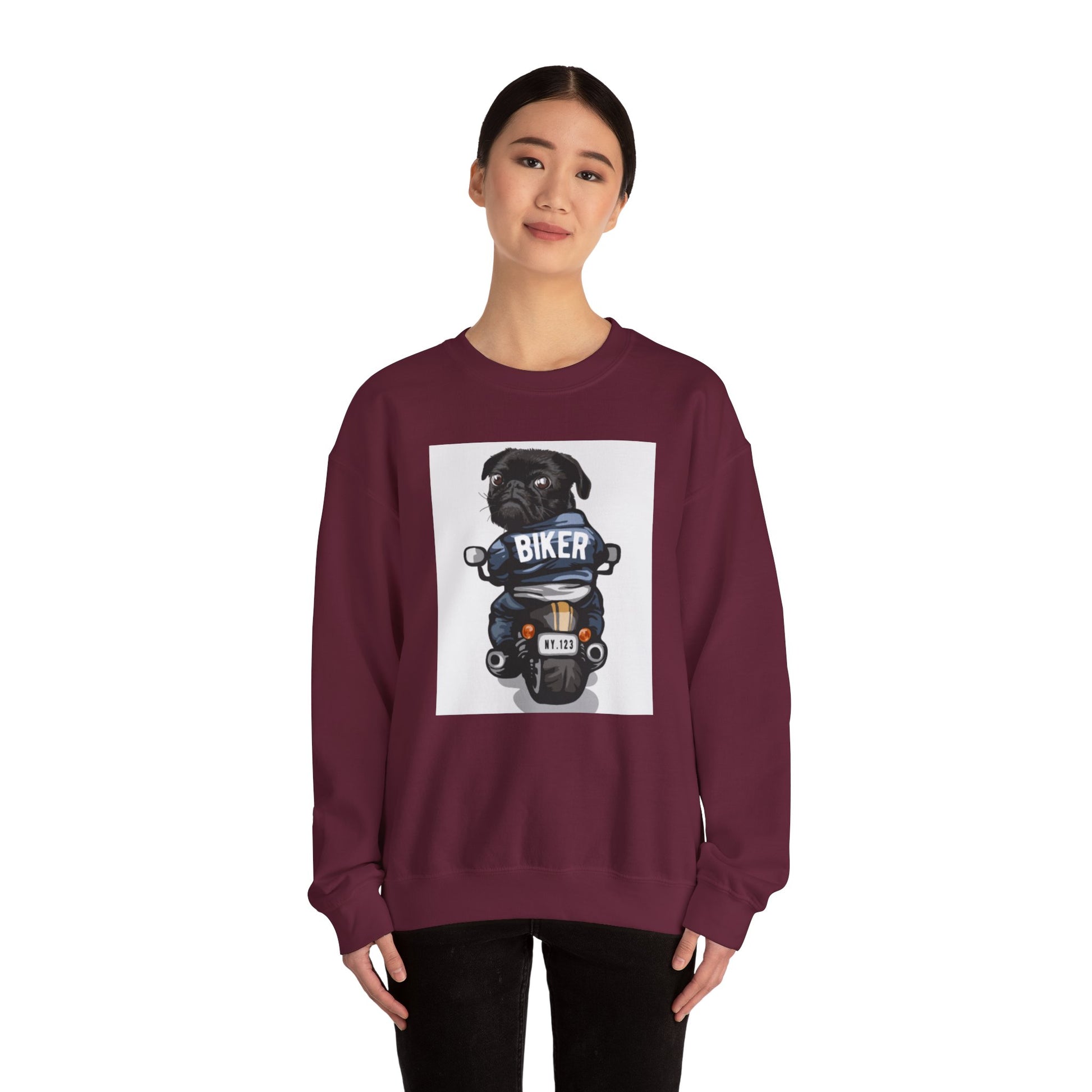 This classic sweater features a bold biker pug graphic riding a motorcycle, complete with a “BIKER” jacket for unmistakable street personality.
