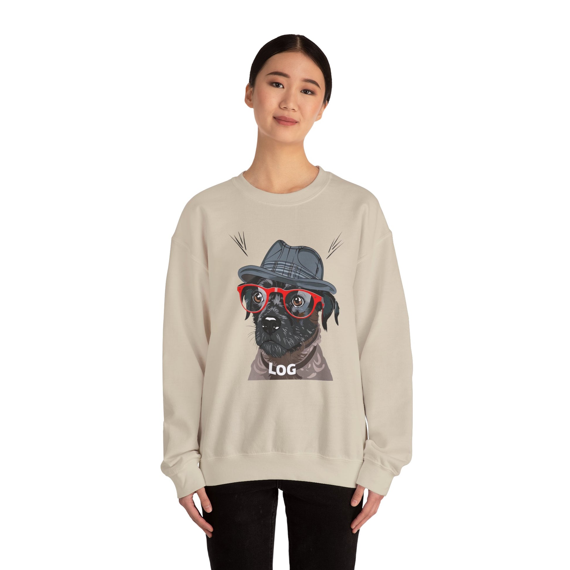 This sweatshirt features a clean, modern dog illustration with bold red glasses and a subtle street-style vibe.