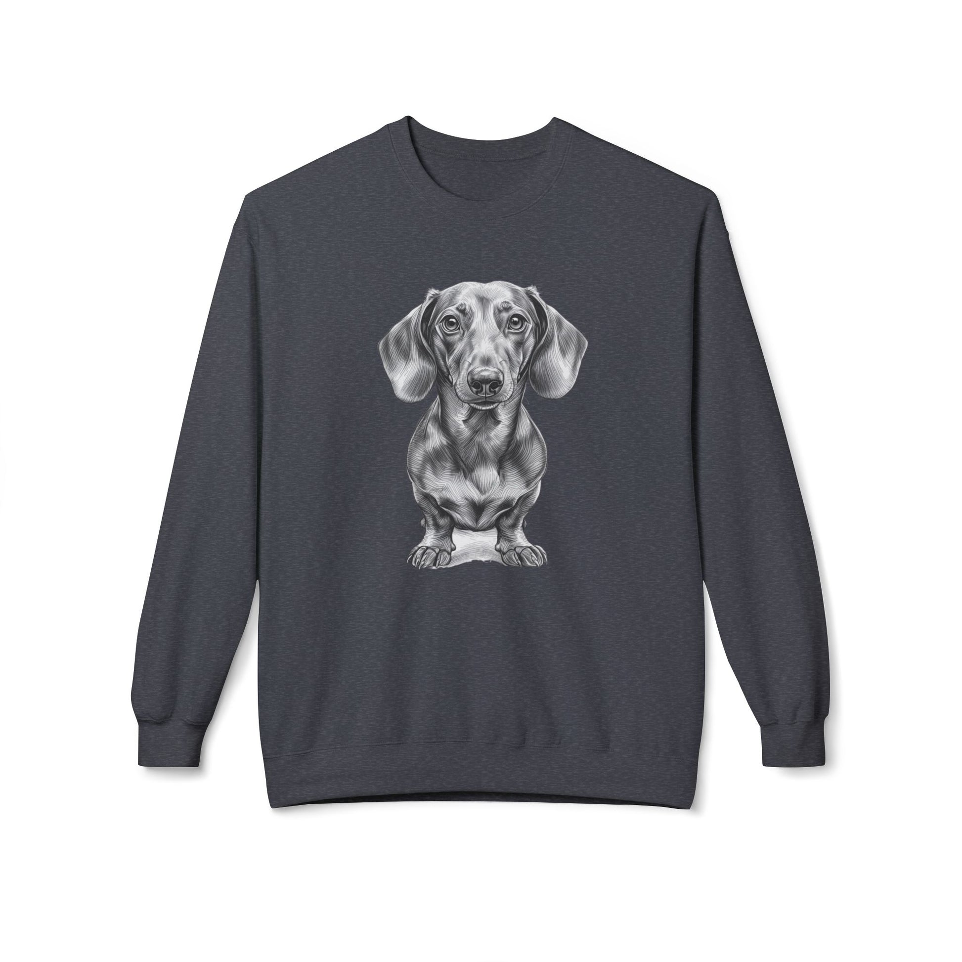 A cozy sweatshirt featuring a clean and expressive Dachshund sketch