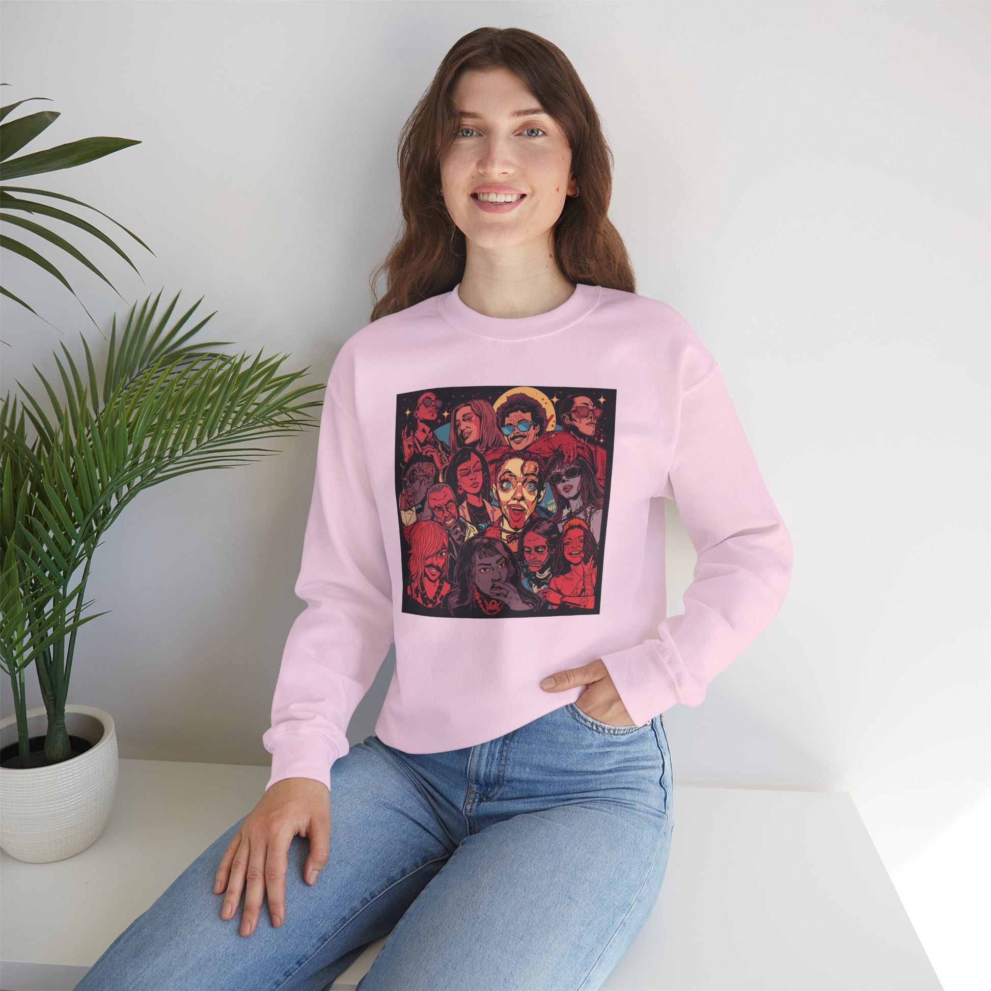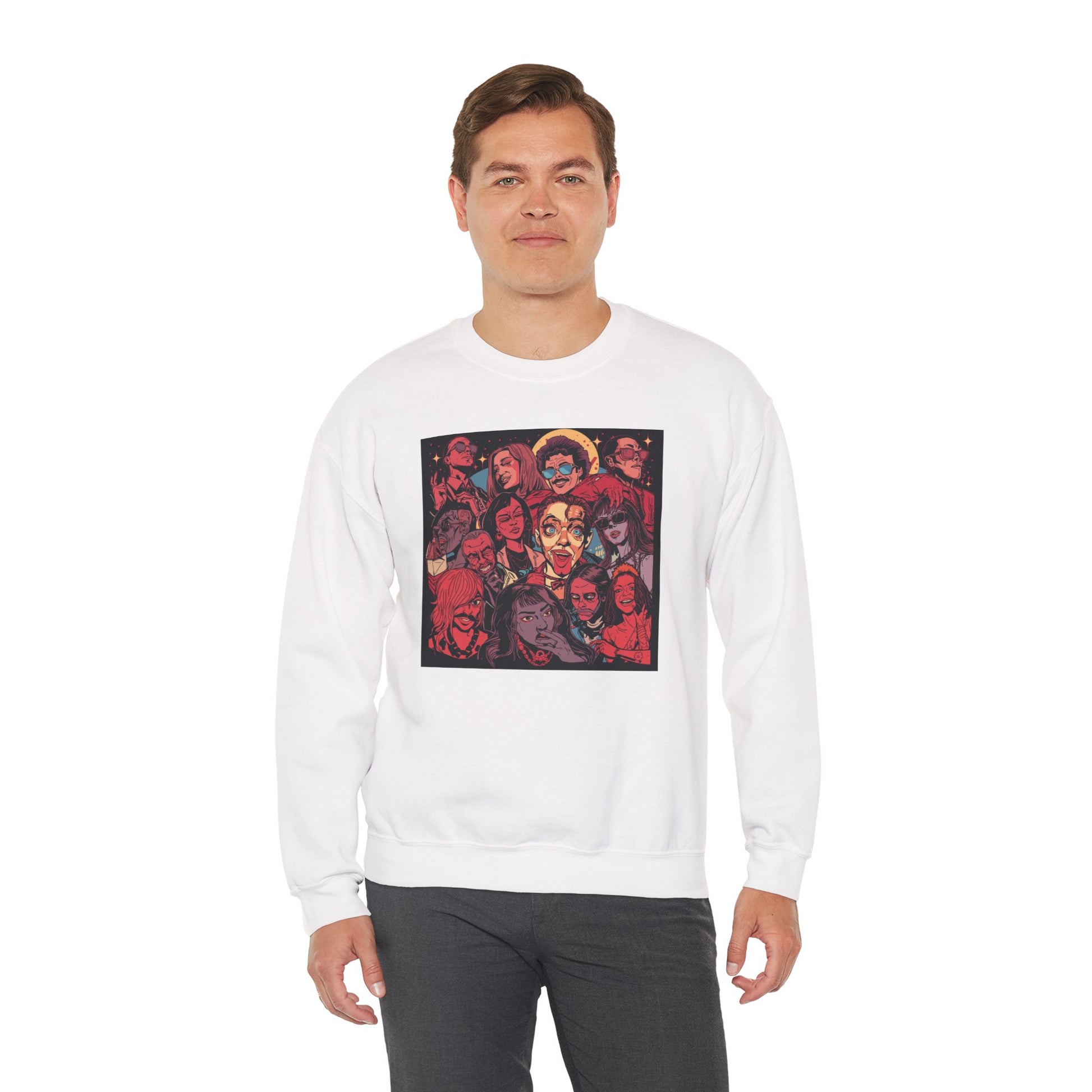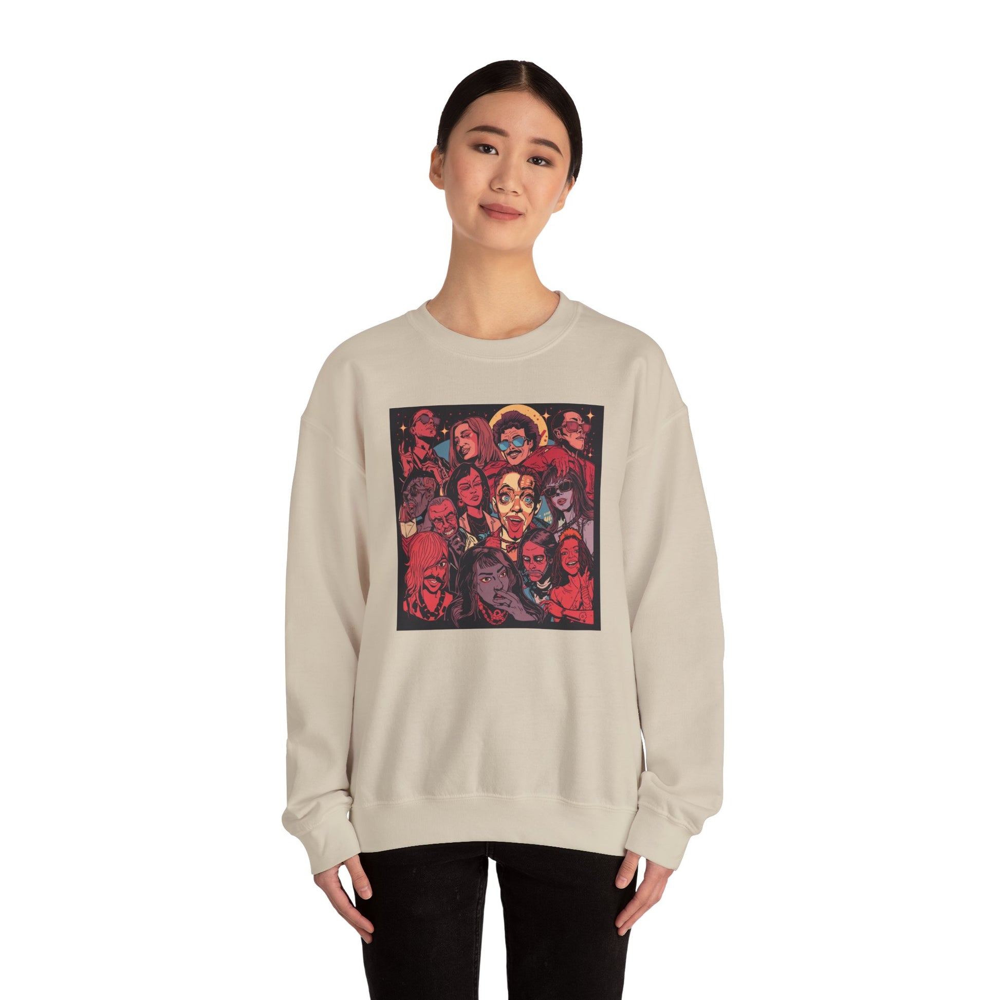 This sweater showcases a bold, illustrated collage of iconic rock-inspired faces, capturing the raw emotion and rebellious energy of live music culture.