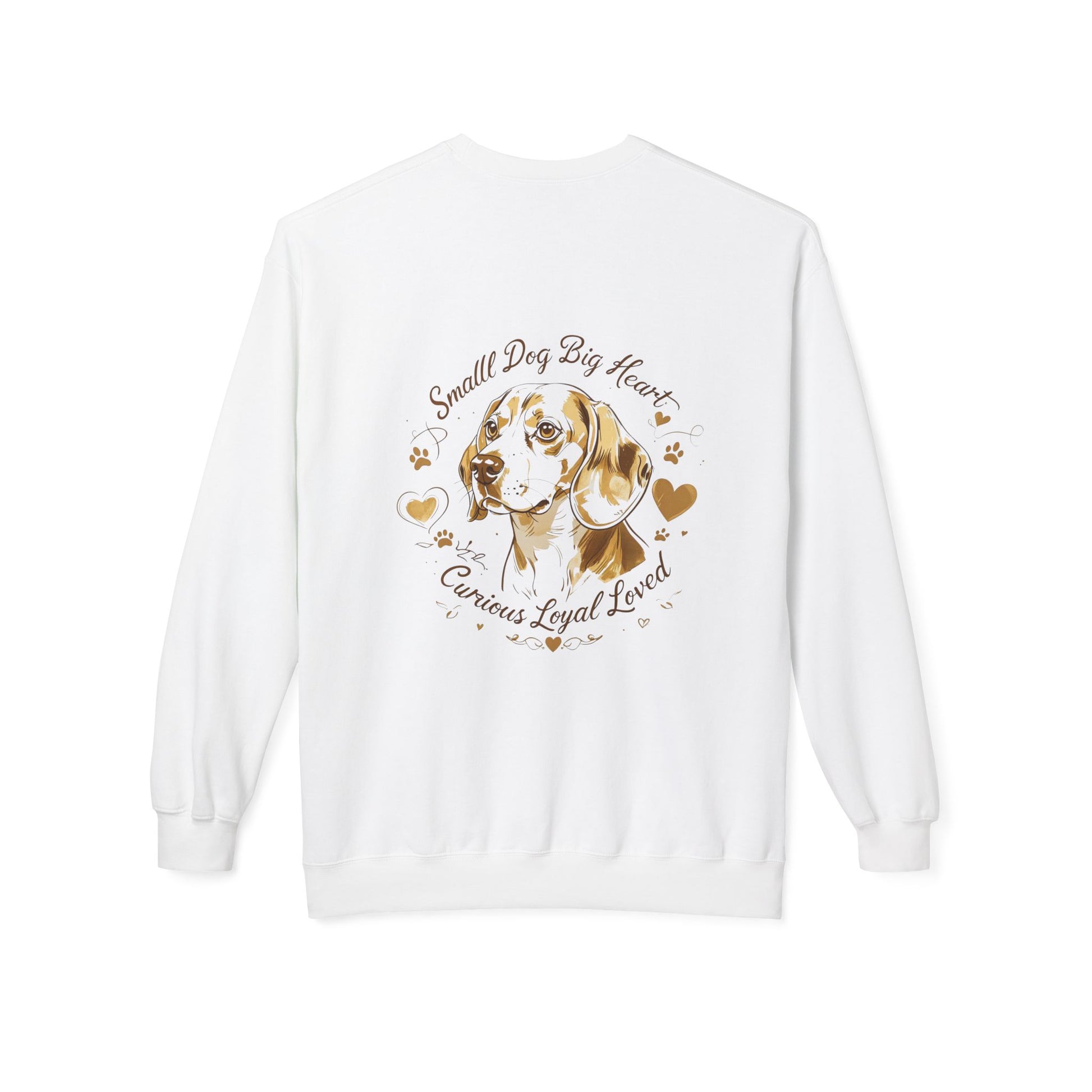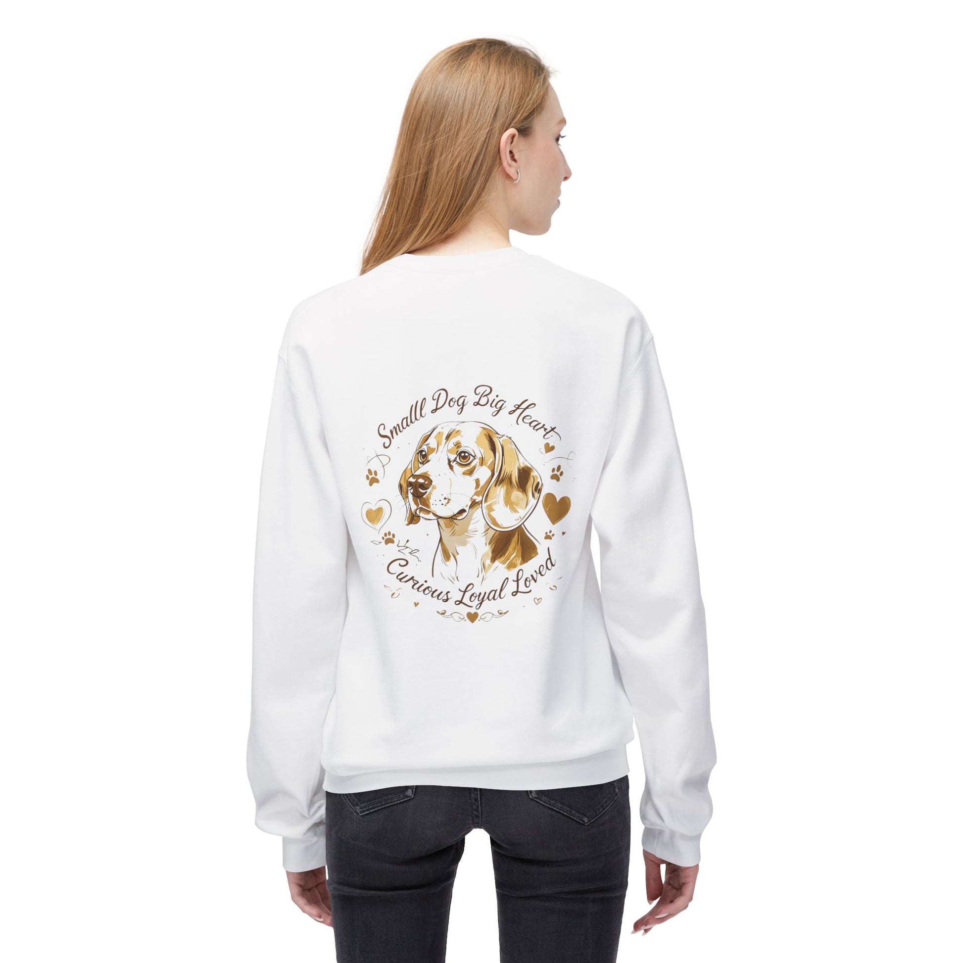 The back design highlights a soft Beagle portrait surrounded by the message “Small Dog Big Heart” with the trait line “Curious Loyal Loved”