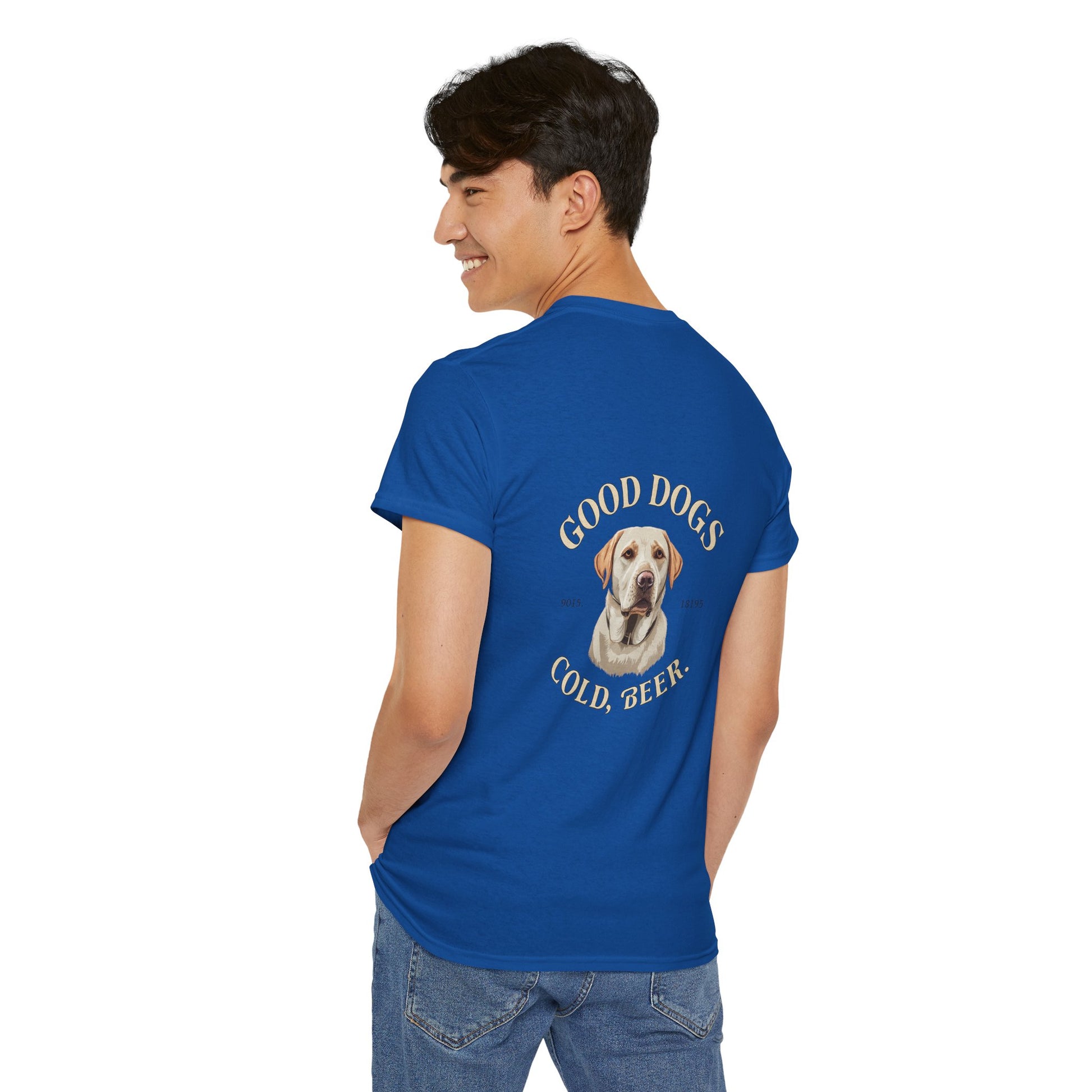 The back design highlights a cheerful Labrador holding a beer with the phrase “LET’S GET LABRADOR”