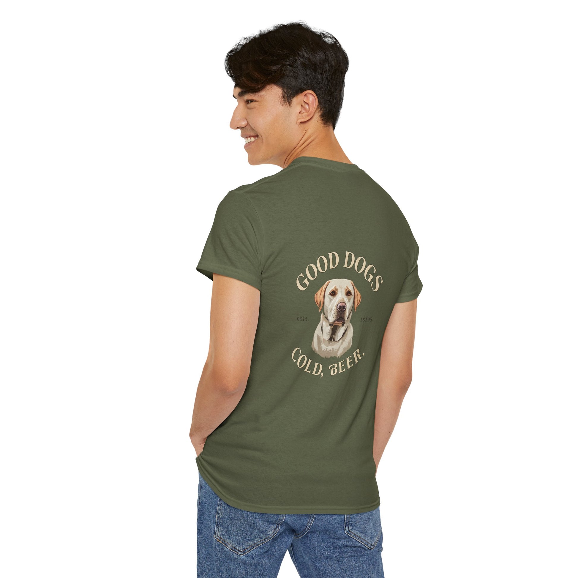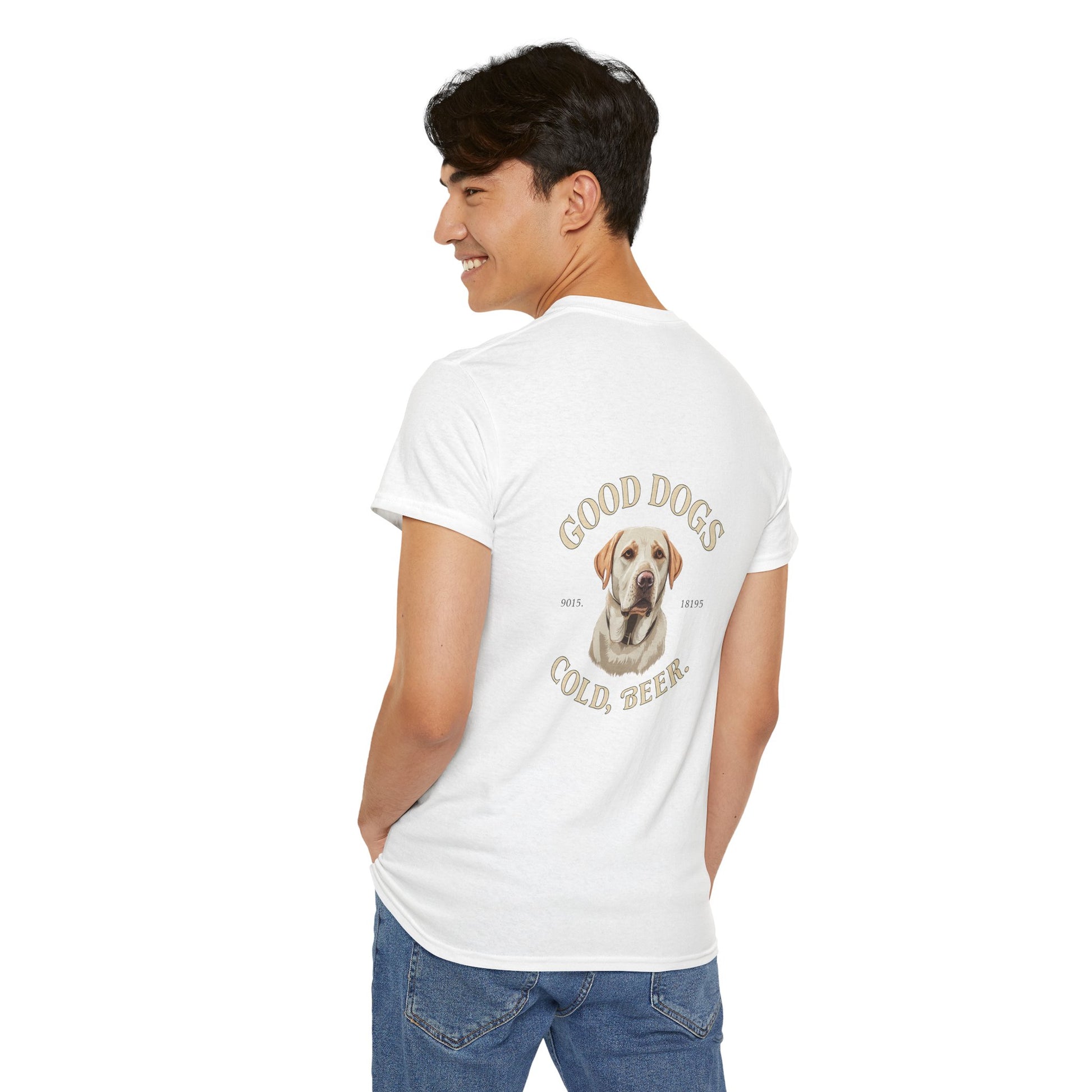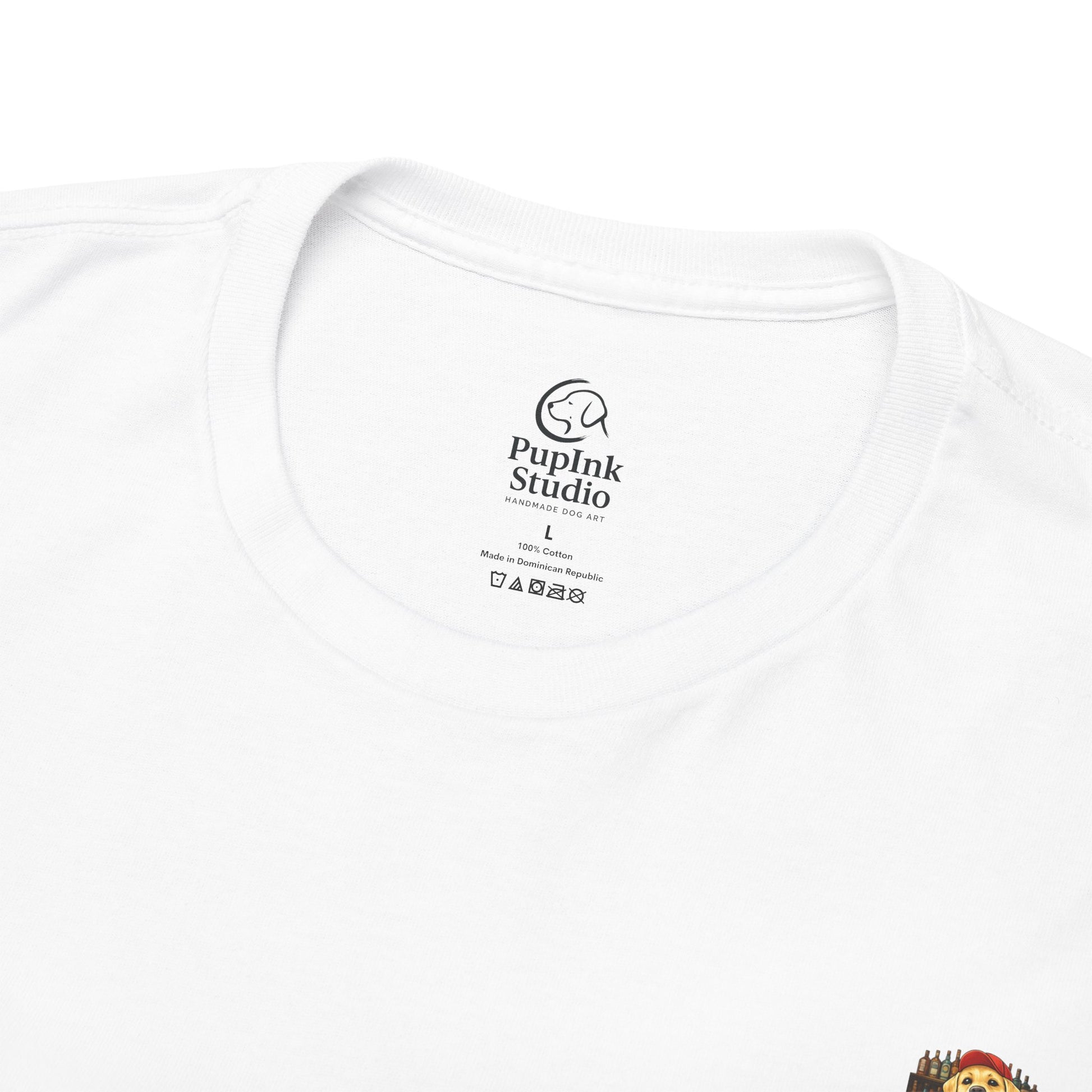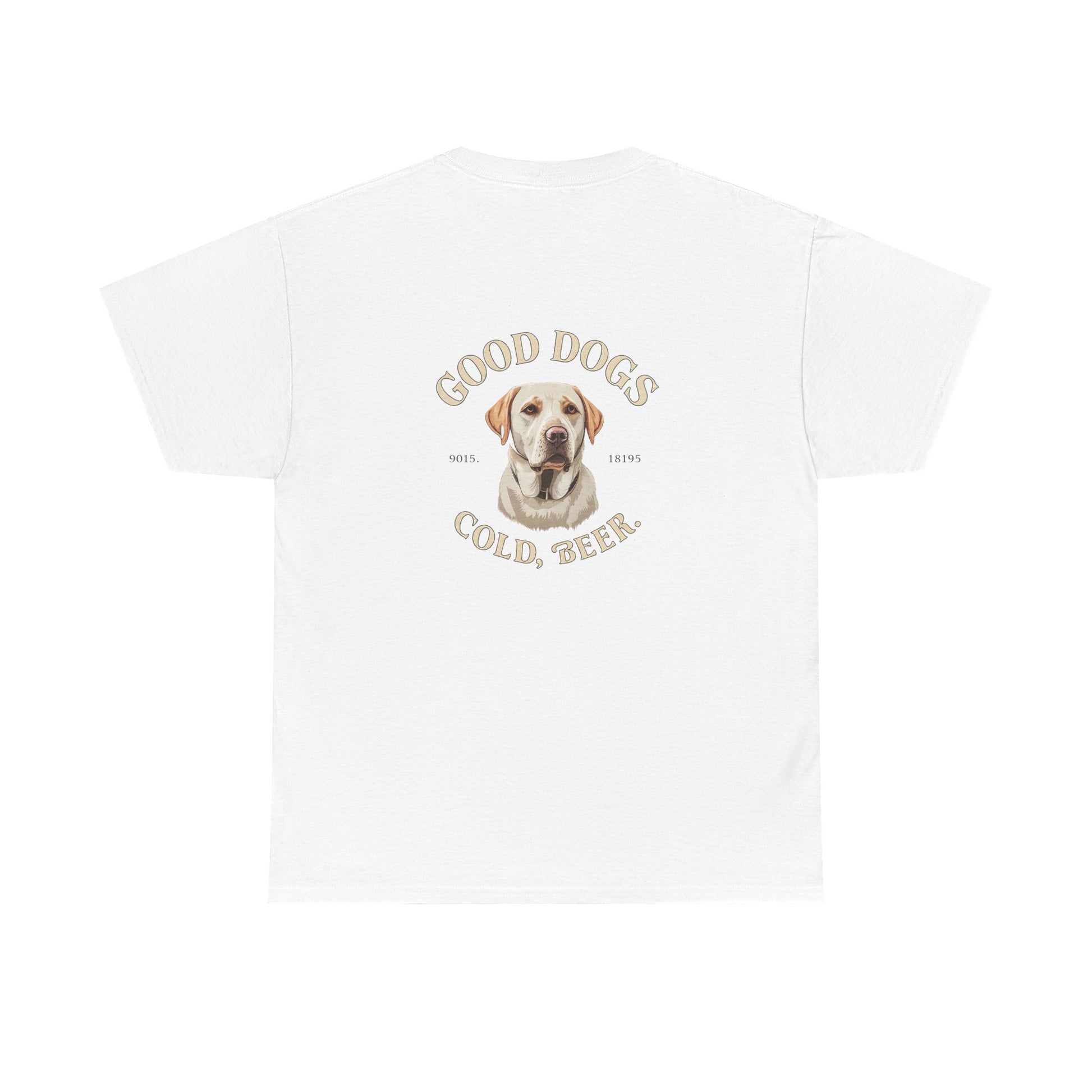 This T-shirt features a small embroidered-style Labrador emblem on the left chest with a bold full-back bar-scene graphic