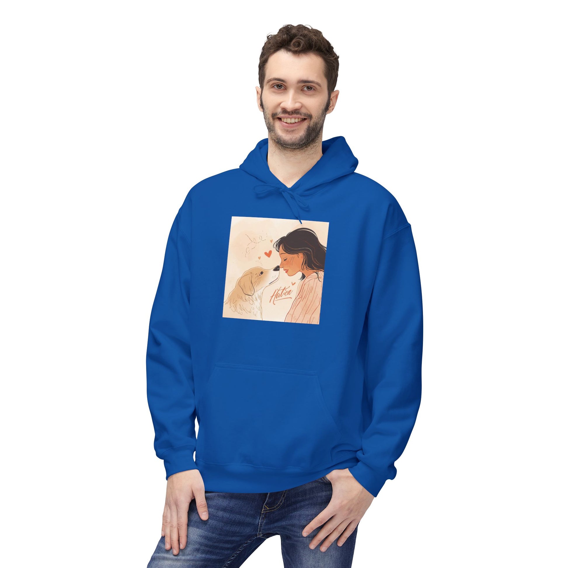 This hoodie captures the tender moment between a woman and her dog—nose to nose, heart to heart.