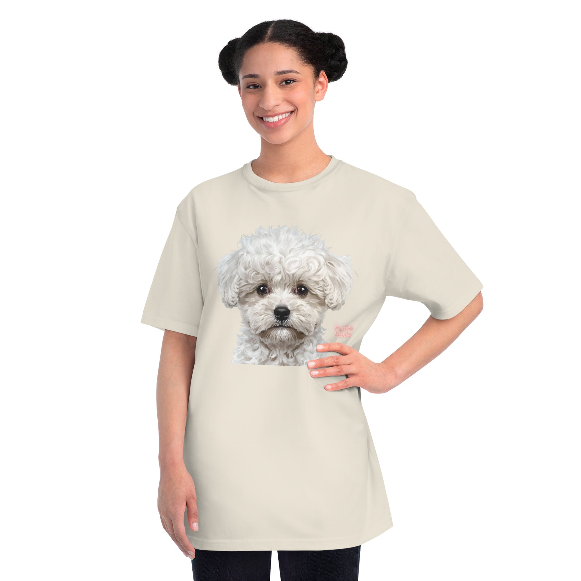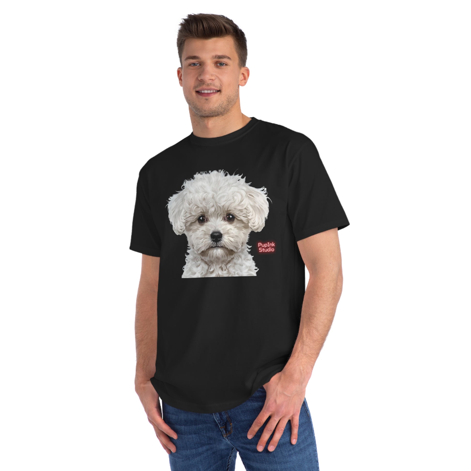 This organic T-shirt features a clean black base with a detailed white poodle portrait printed on the front, creating a calm, elegant, and approachable look.