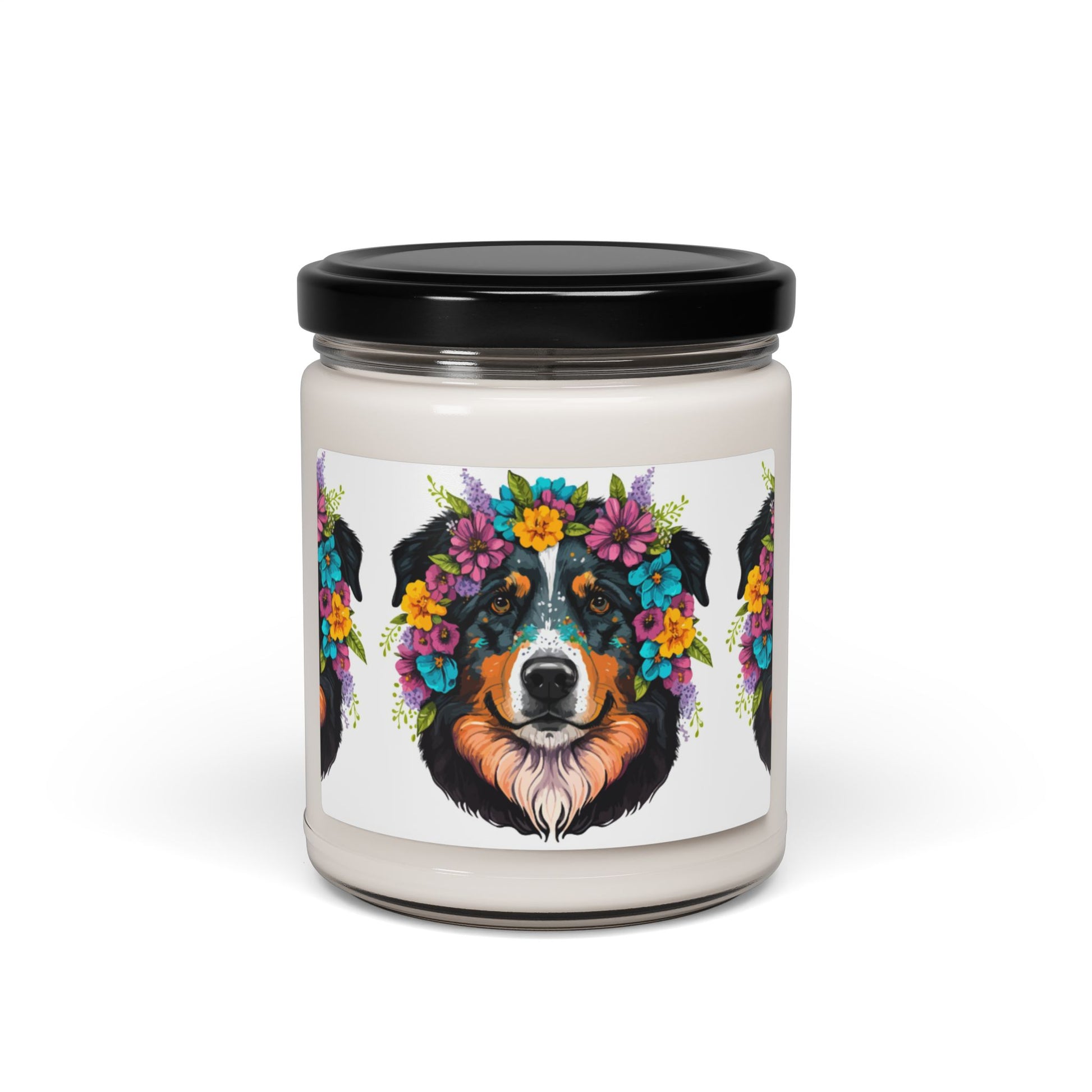 This candle features a vibrant artistic dog portrait surrounded by rich floral elements printed on the front only.