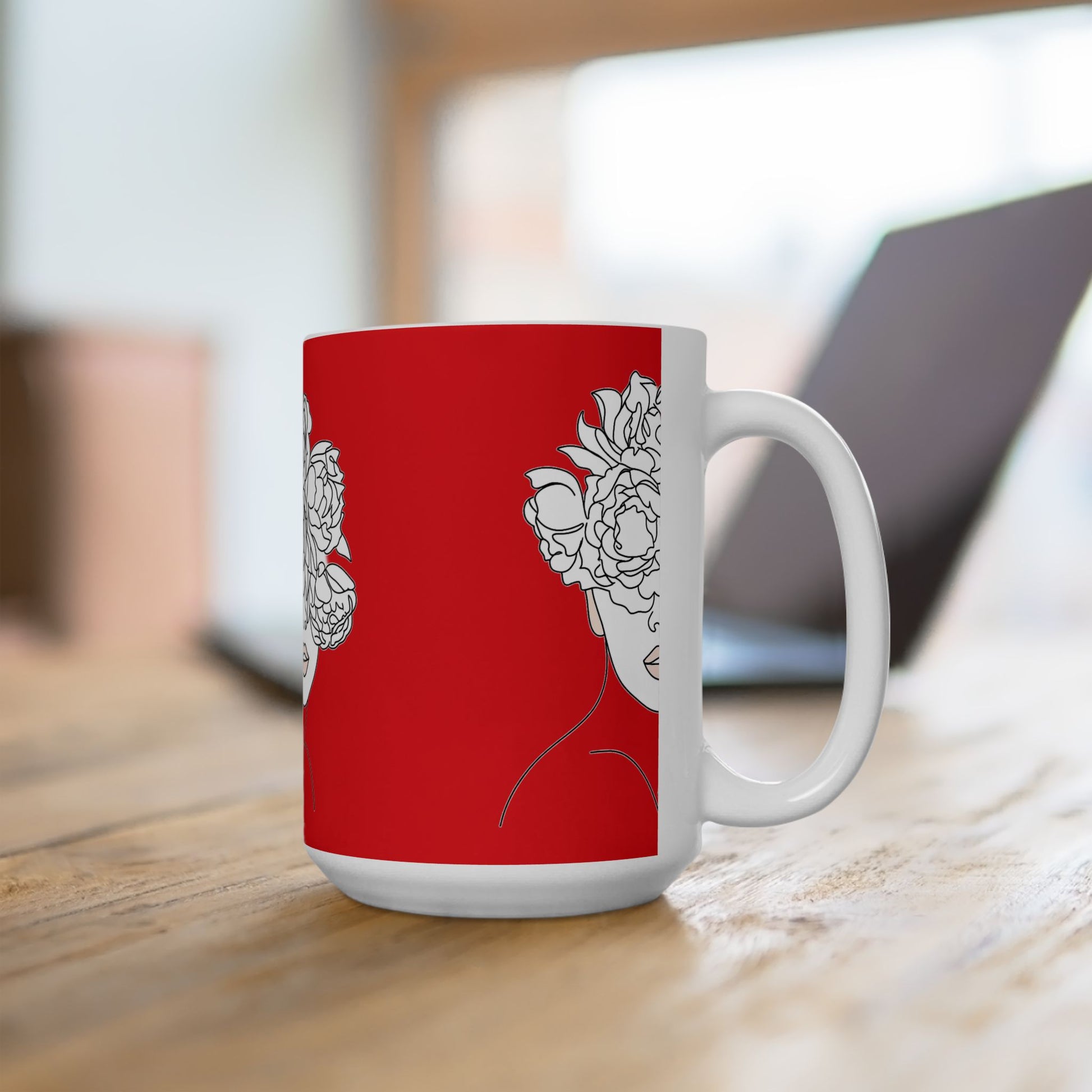 This mug features an elegant floral line portrait set against a rich red background, creating a striking contrast that feels both modern and expressive. The delicate line work and sculptural floral elements add artistic depth, while the bold color elevates the design into a statement piece. Balanced and visually confident, it brings gallery-inspired style to daily coffee or tea rituals.