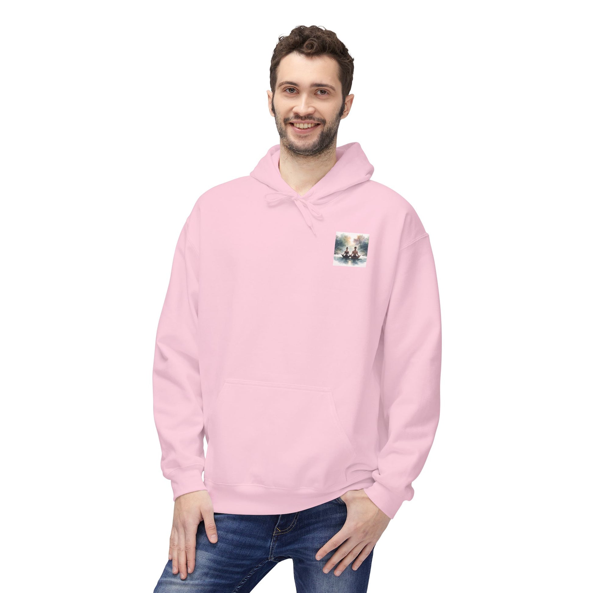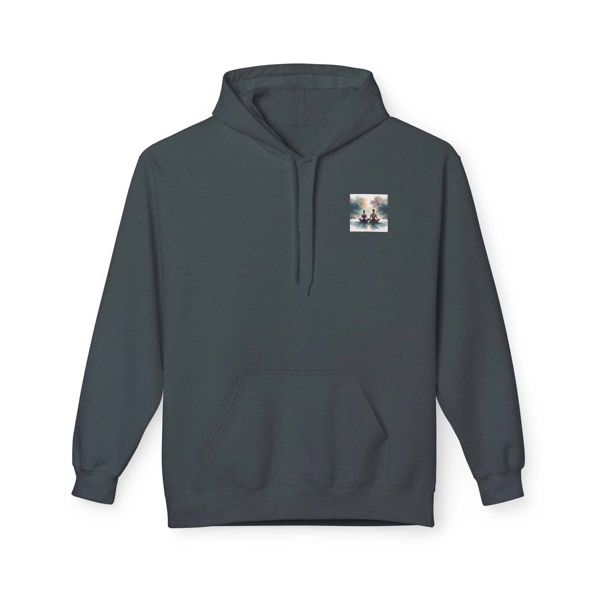 This hoodie features a small atmospheric artwork printed on the front chest depicting a peaceful moment of stillness and reflection