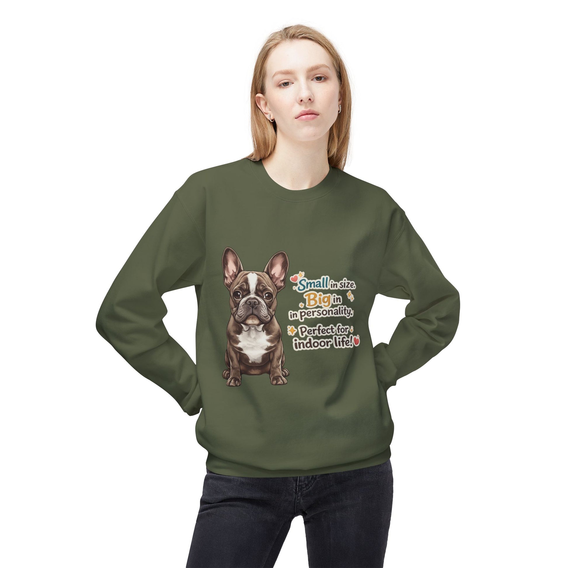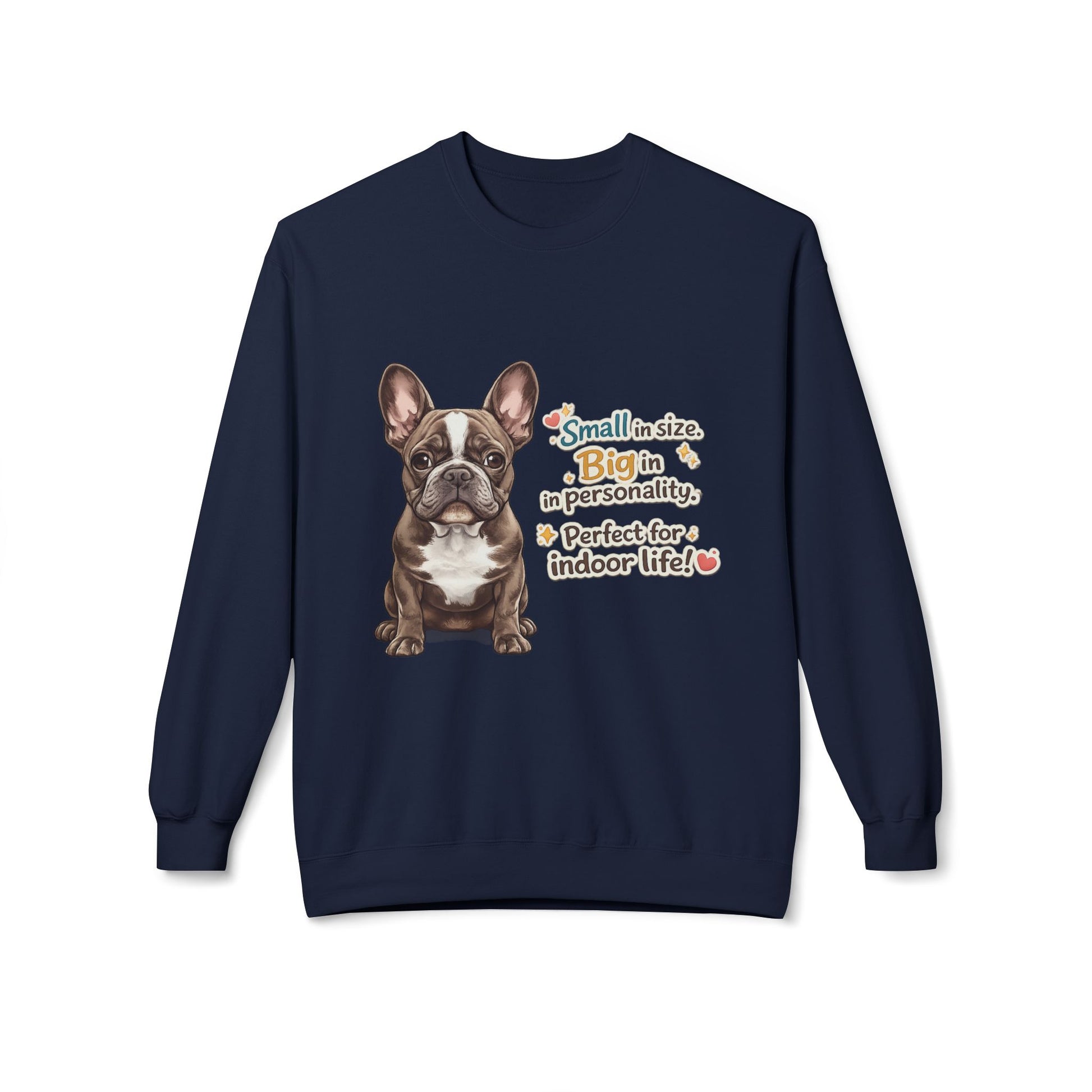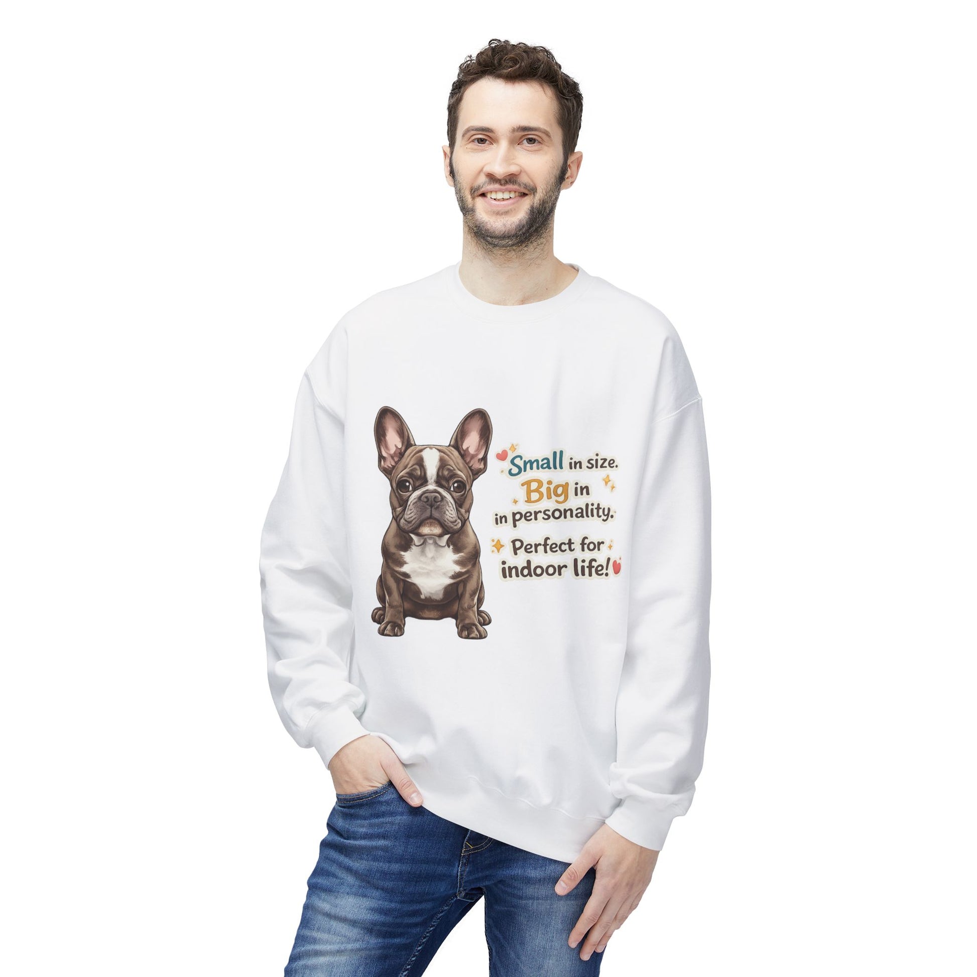 This sweatshirt highlights a joyful dog illustration that radiates kindness and approachability.