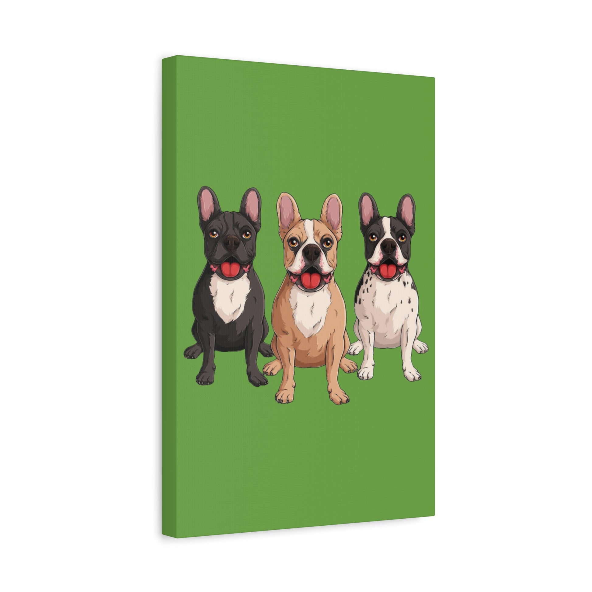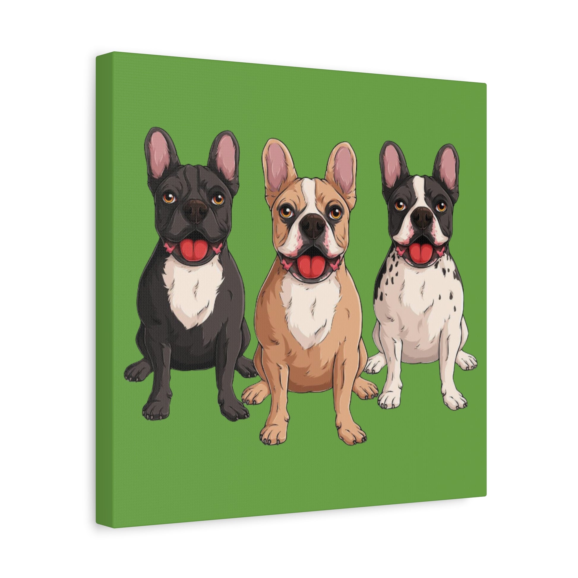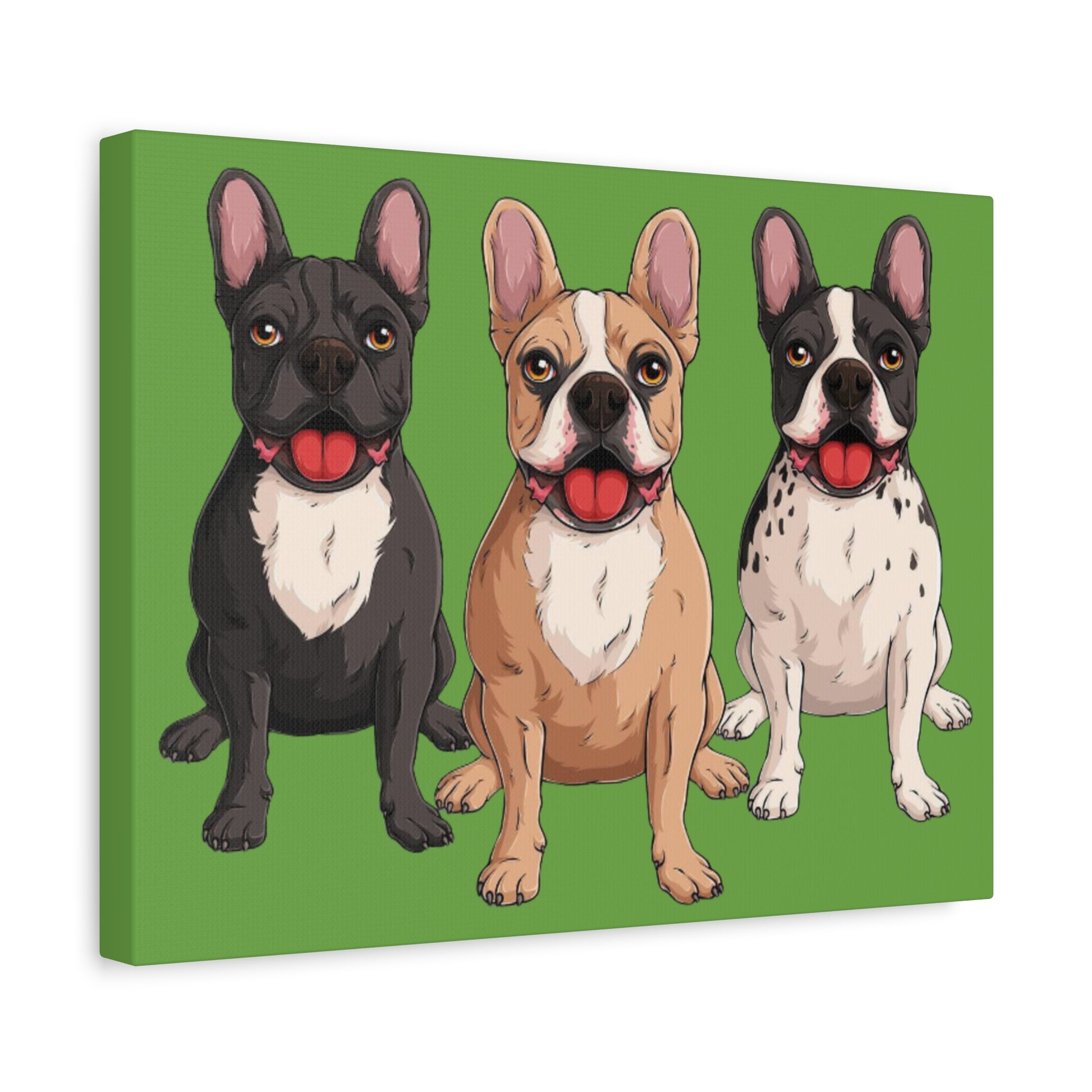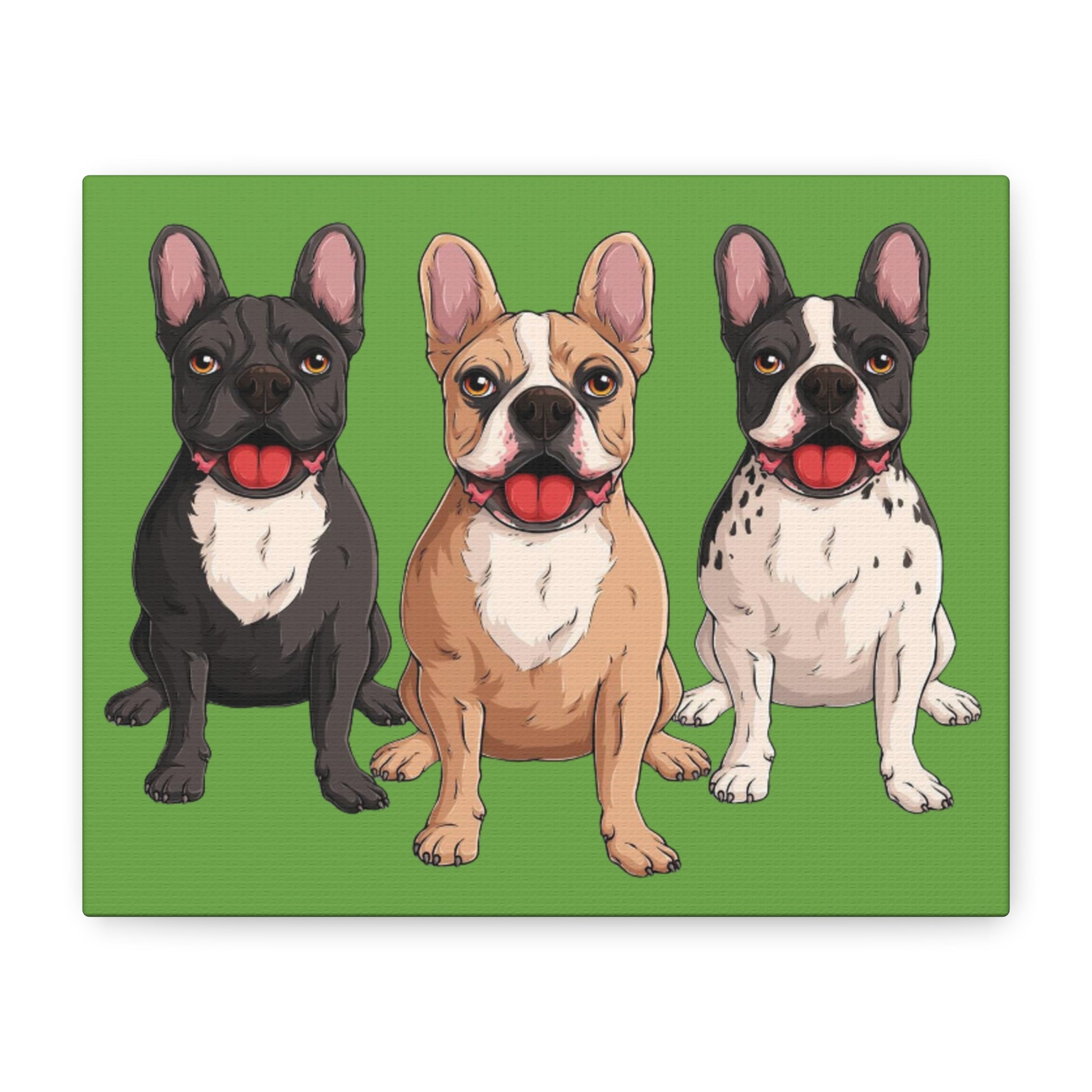 A bold canvas print featuring a charming trio of French bulldogs.