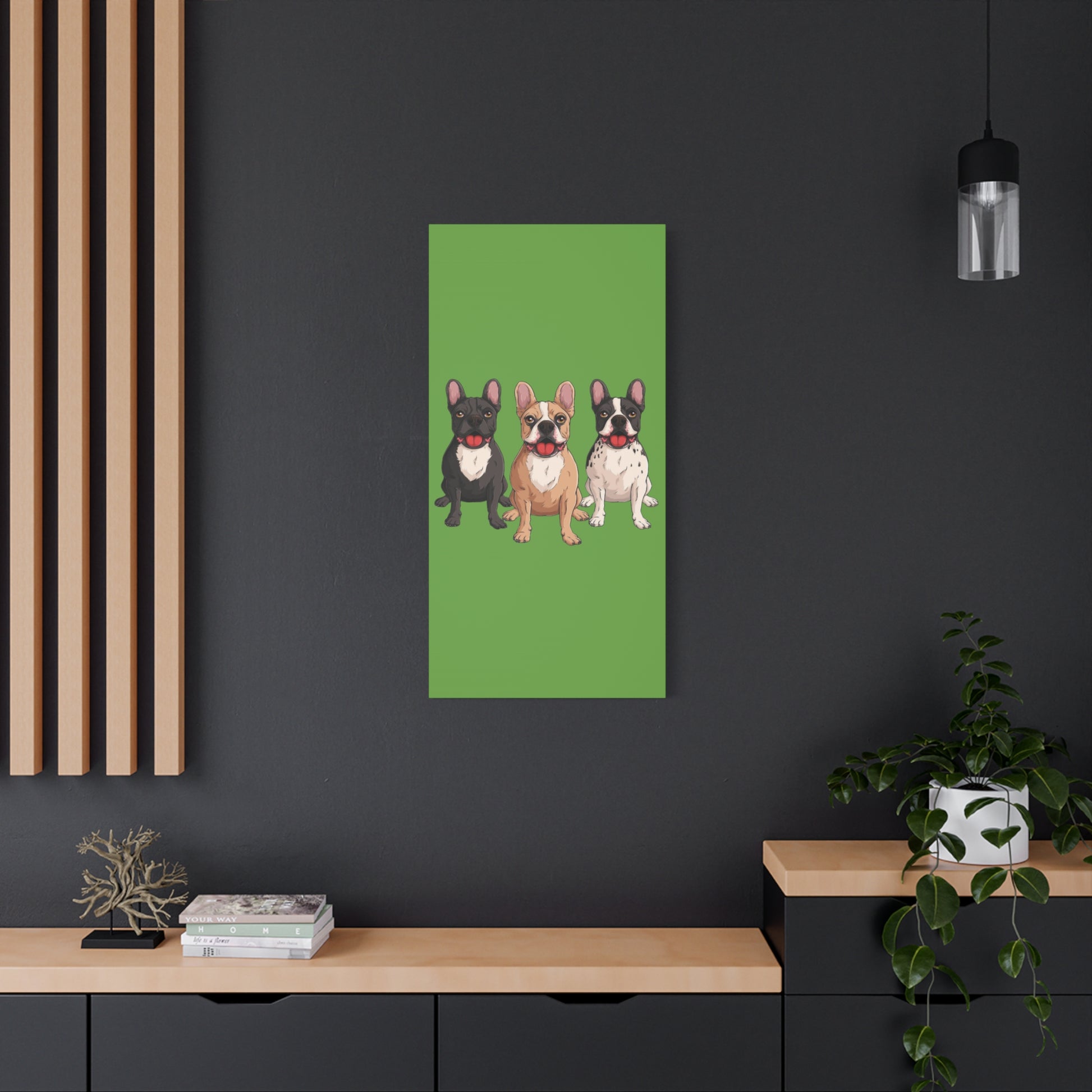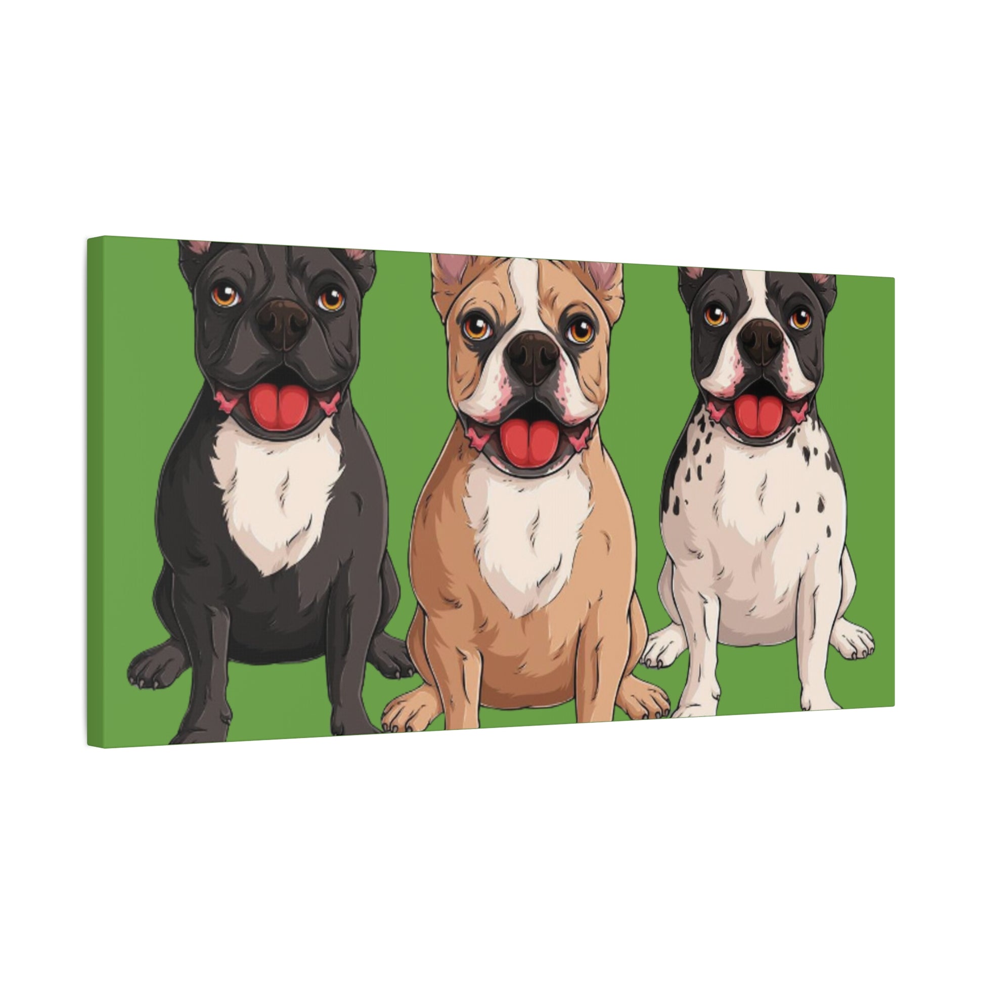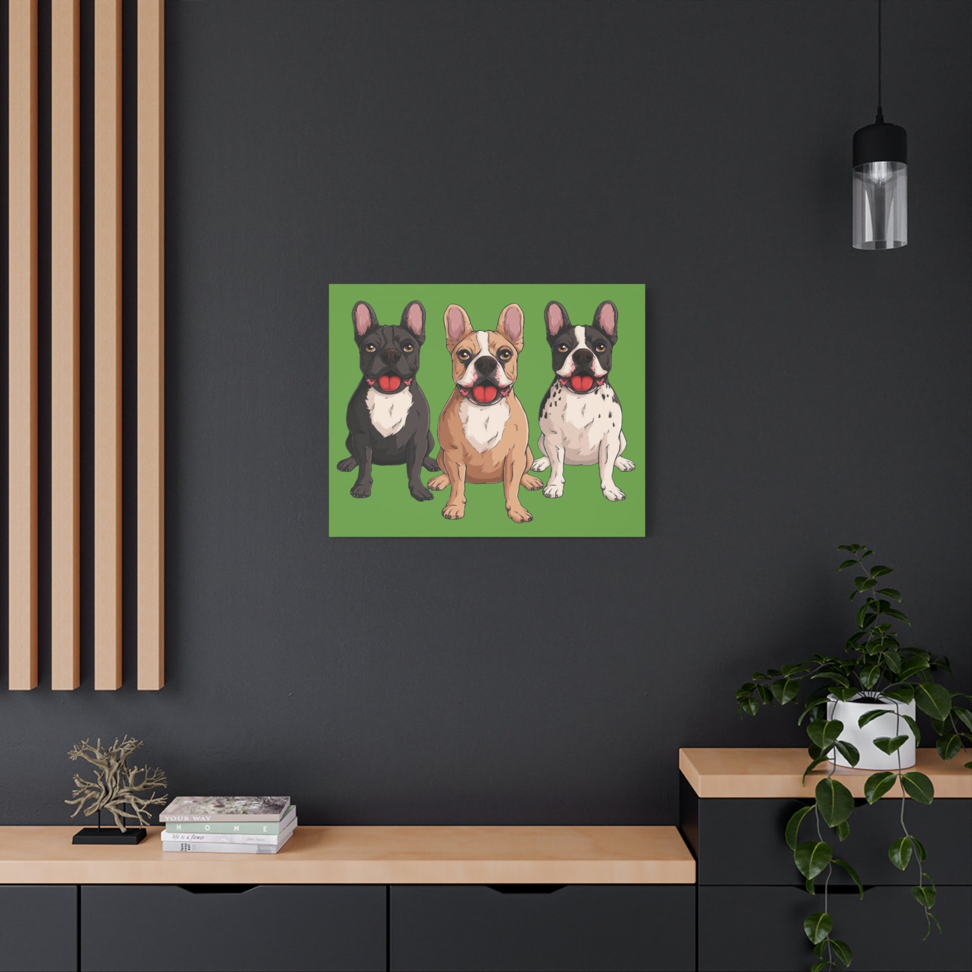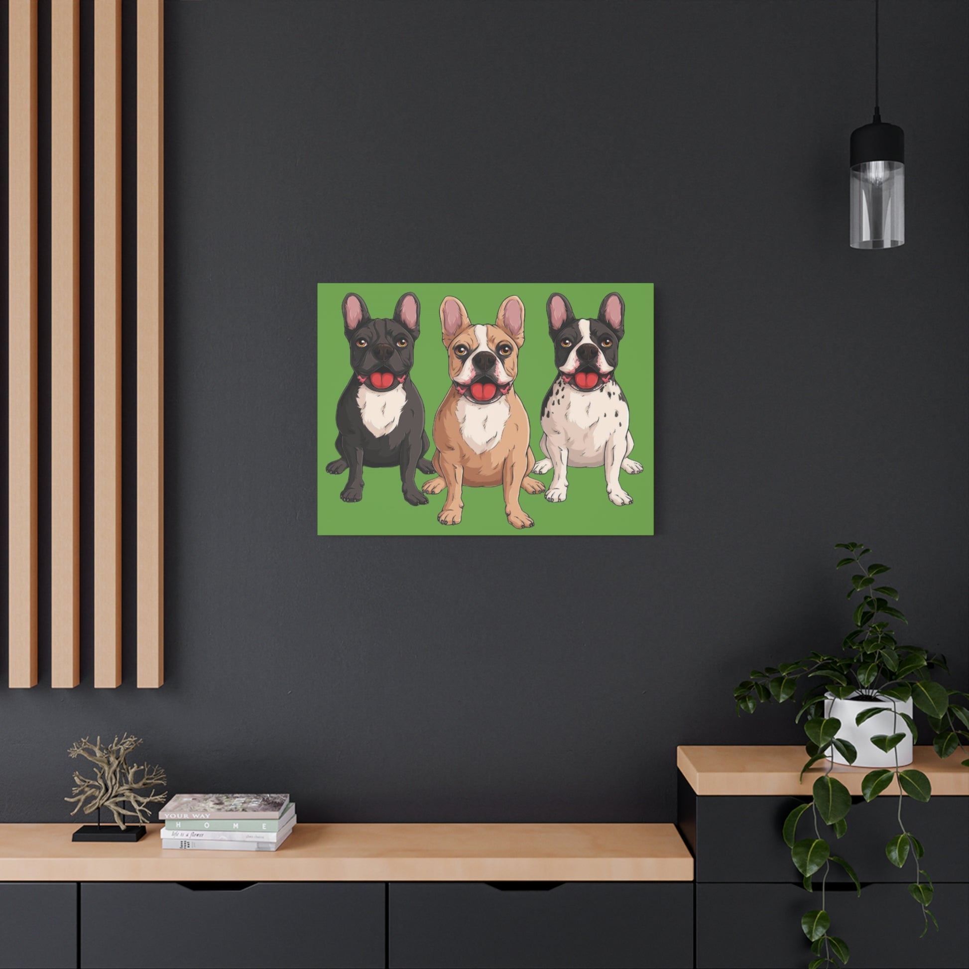 A bold canvas print featuring a charming trio of French bulldogs.