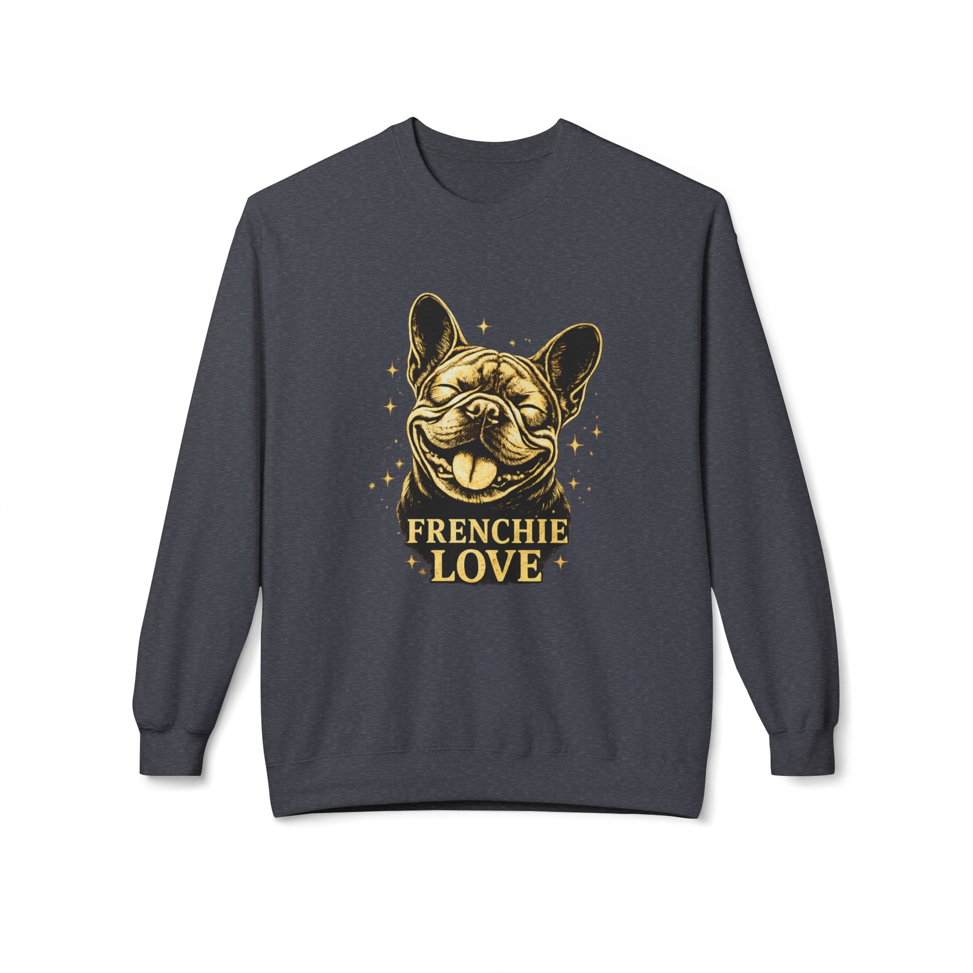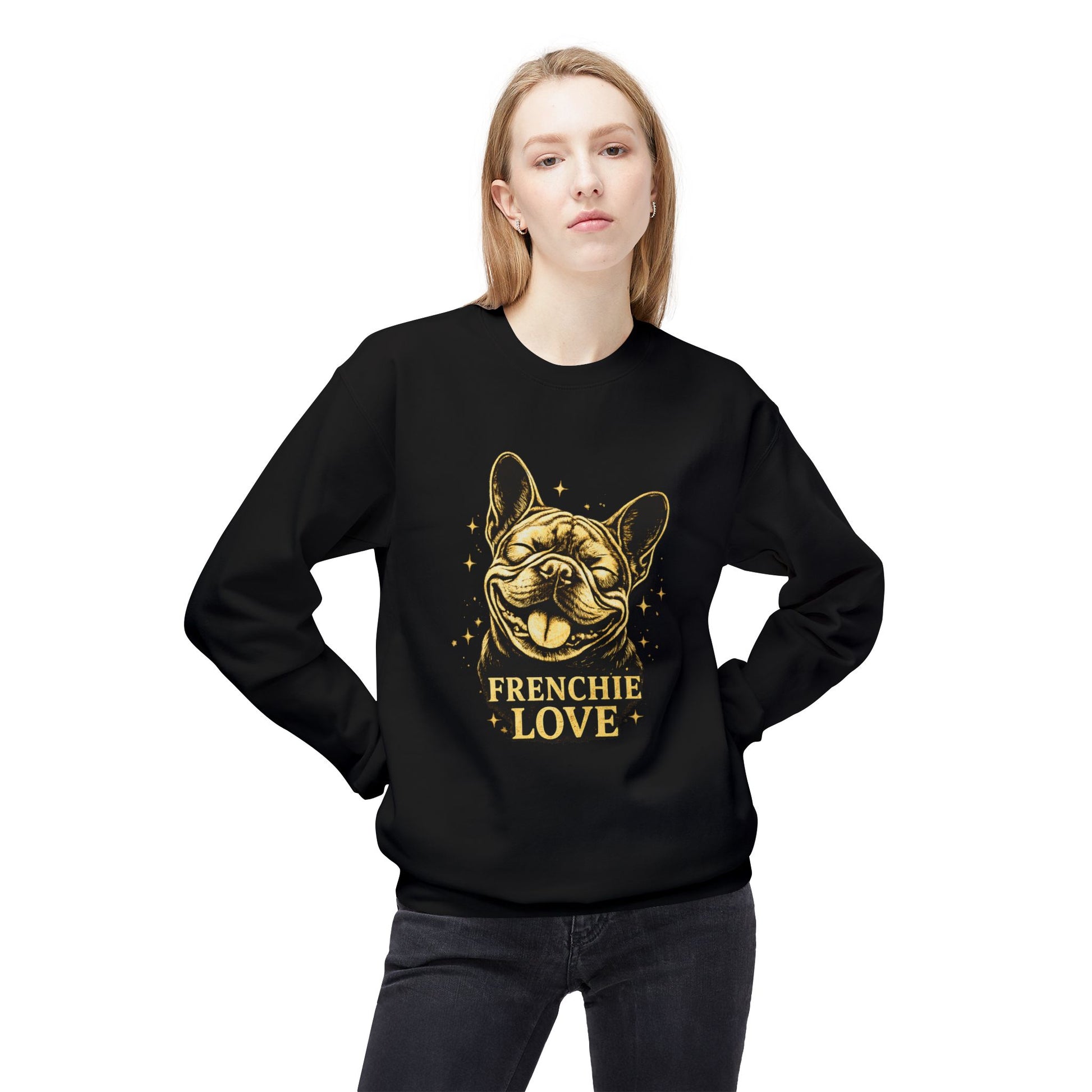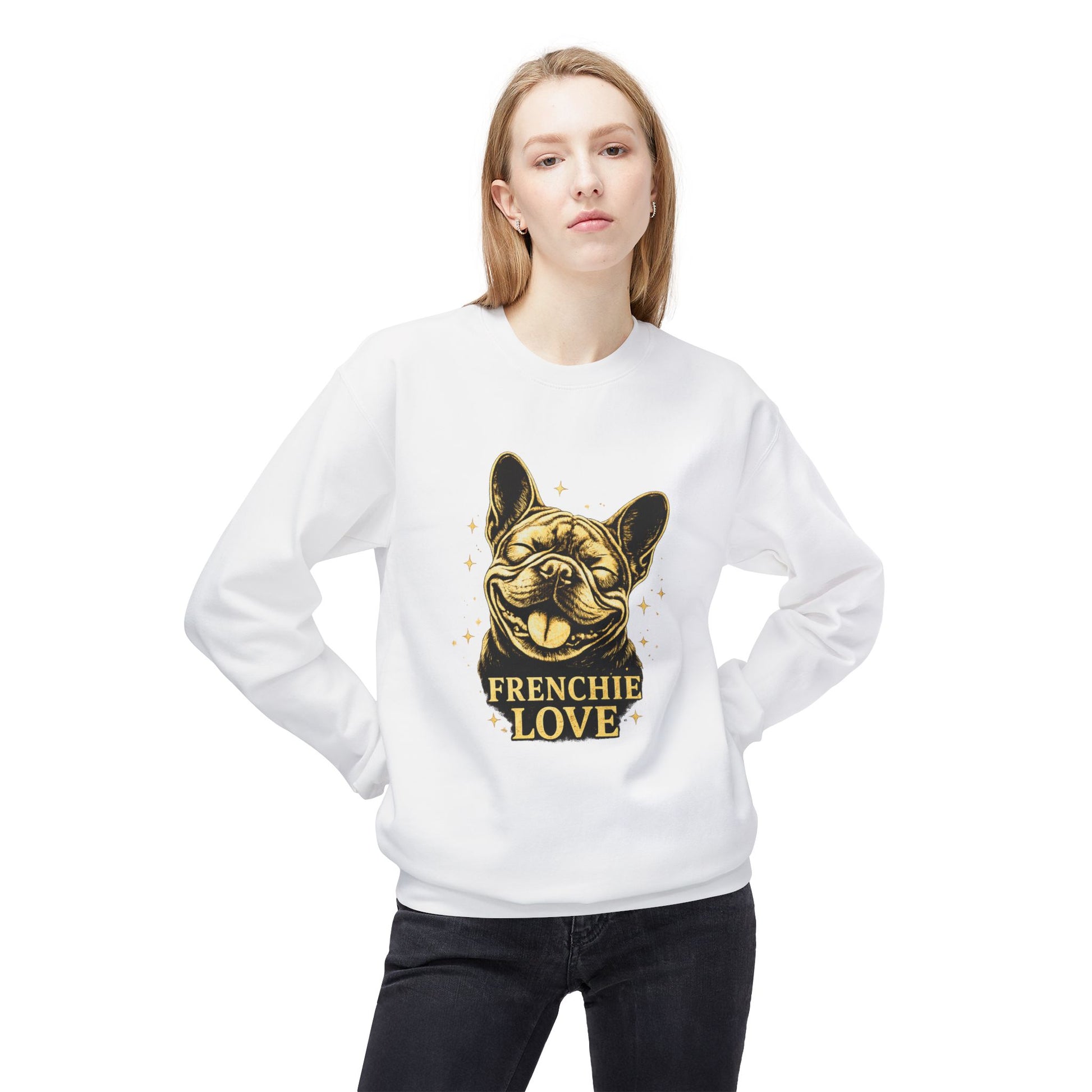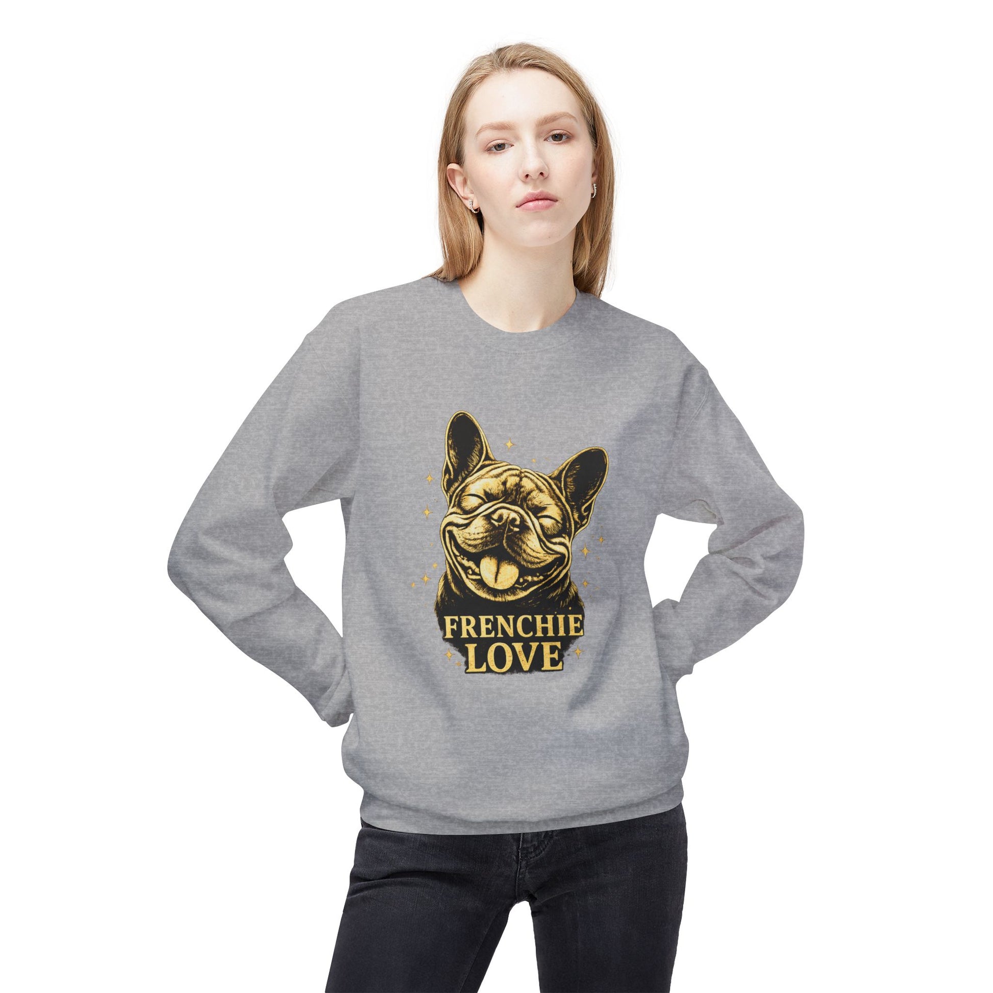 This sweater showcases the same joyful “Frenchie Love” artwork, printed cleanly on the front with no alterations.
