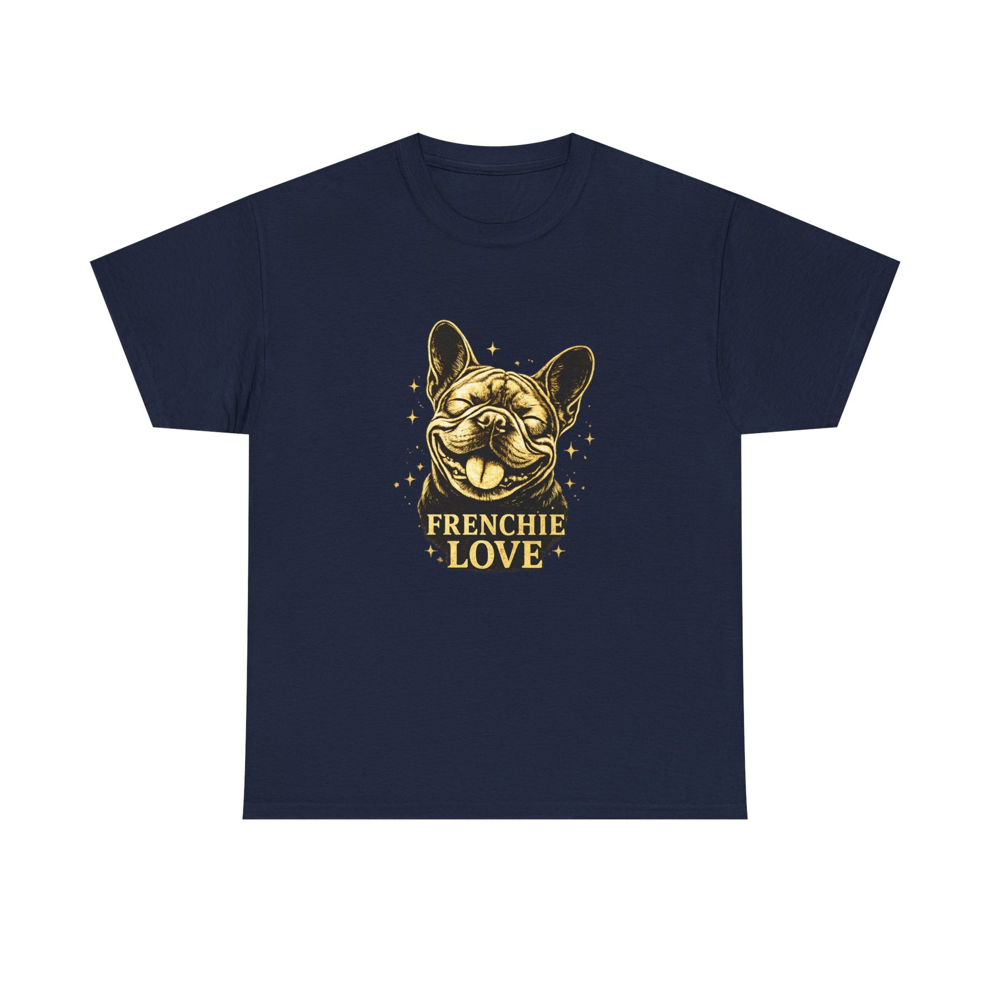 This T-shirt features a bold and cheerful French Bulldog illustration with the words “Frenchie Love,” printed exactly as shown.