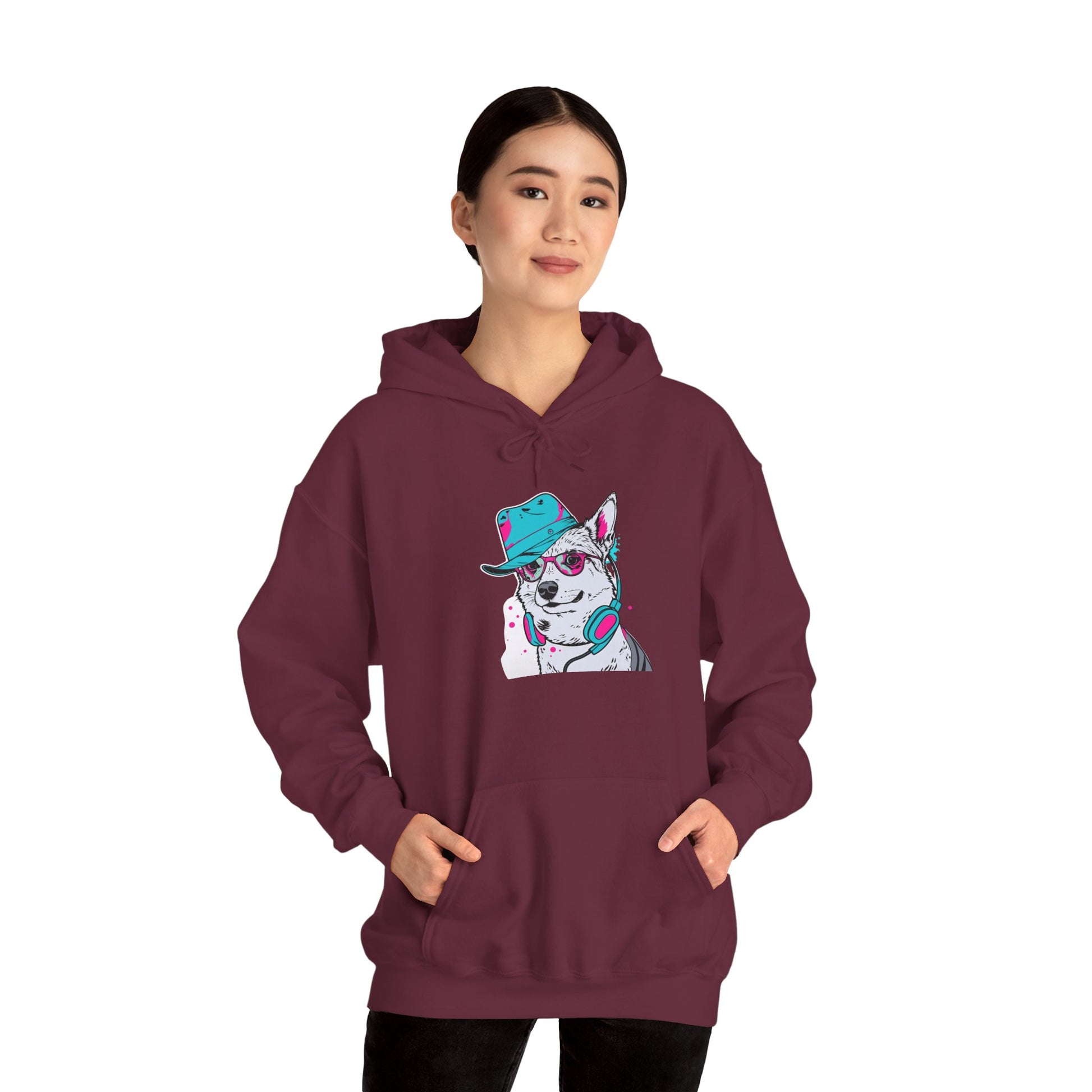 This hoodie features a vibrant pop-art dog illustration with a modern streetwear vibe.