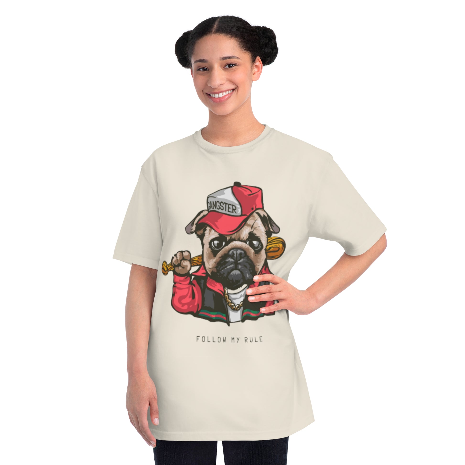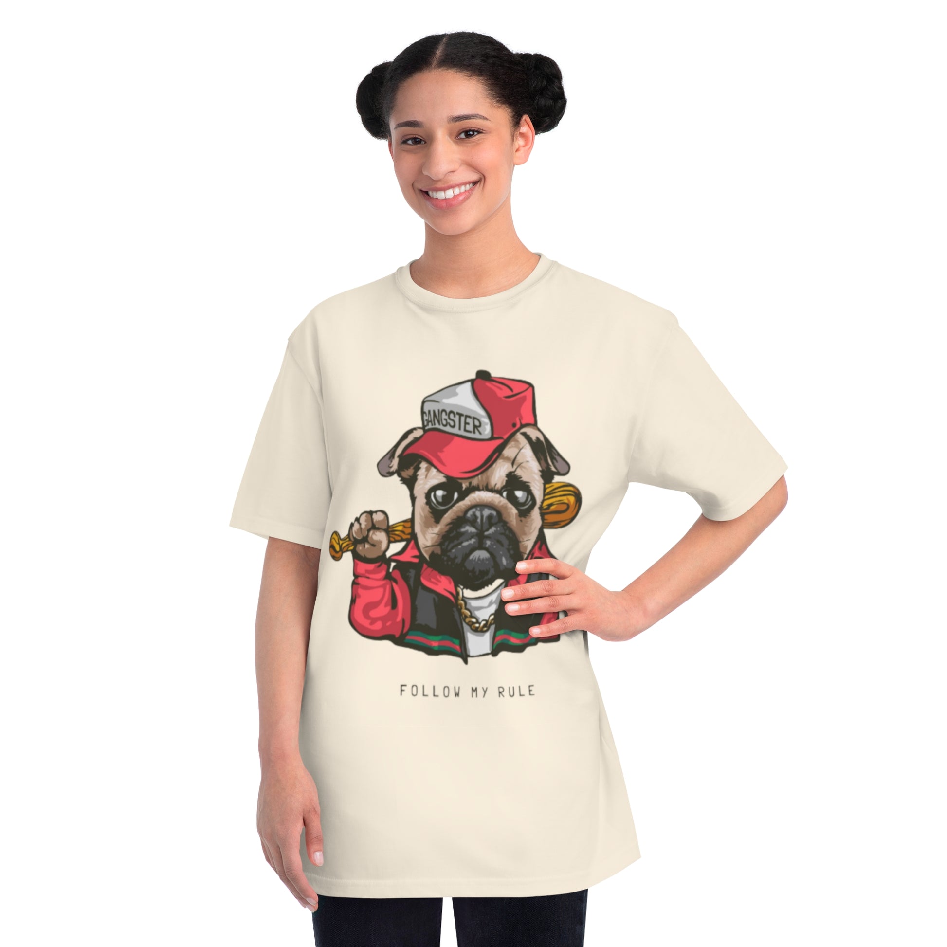 This organic T-shirt features a powerful front graphic of a gangster-style pug, blending playful character with confident street energy.