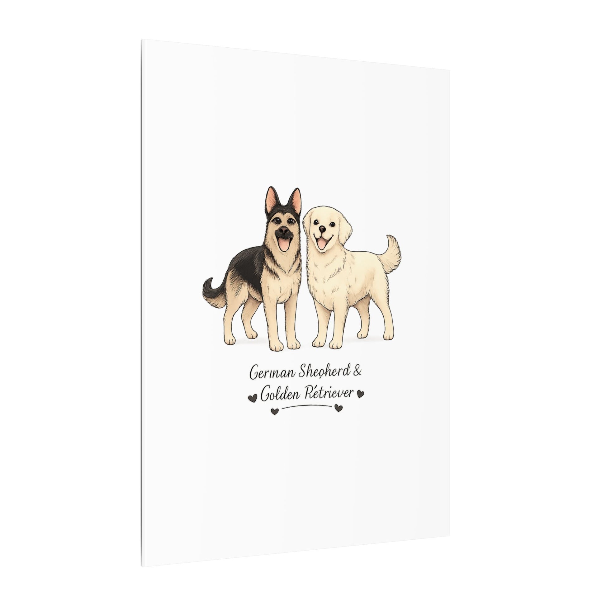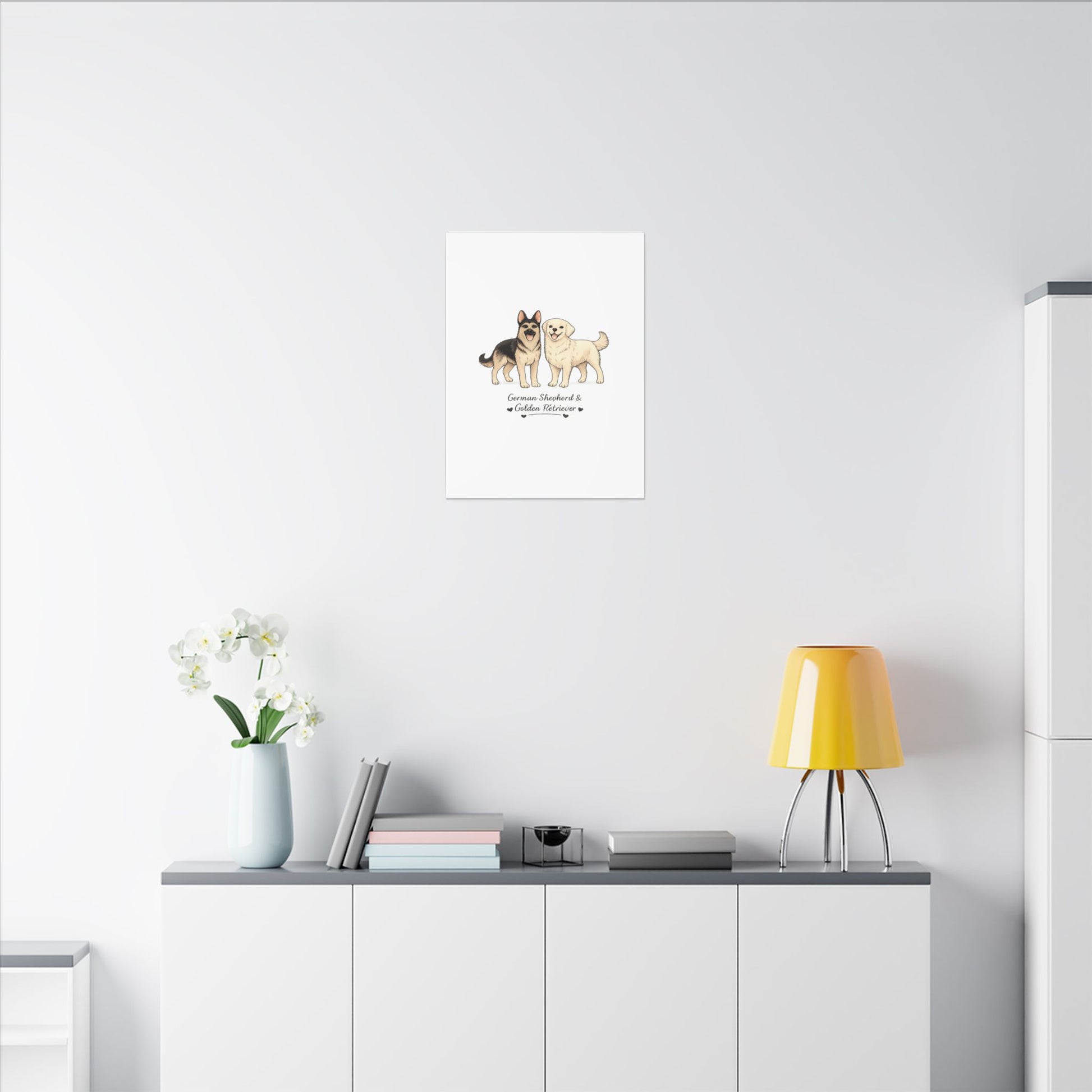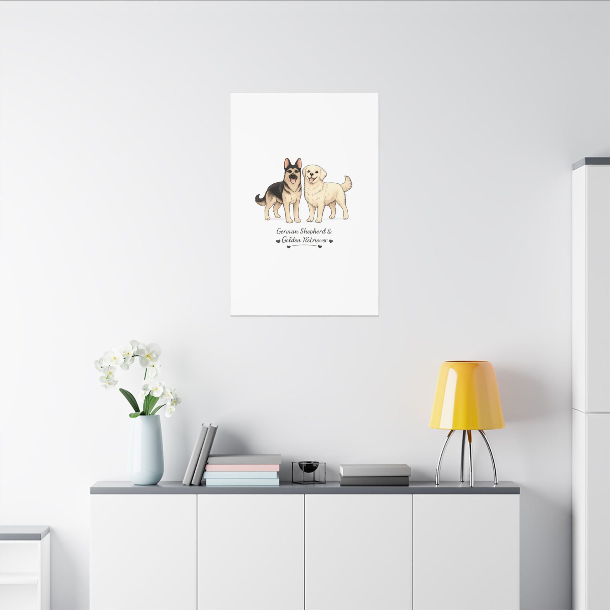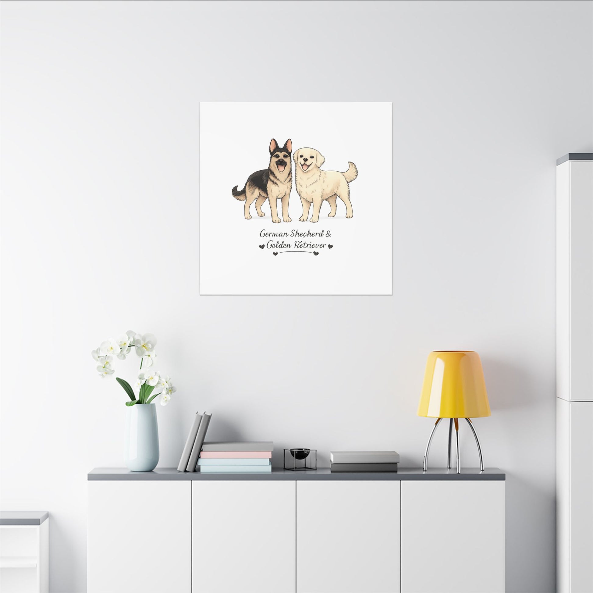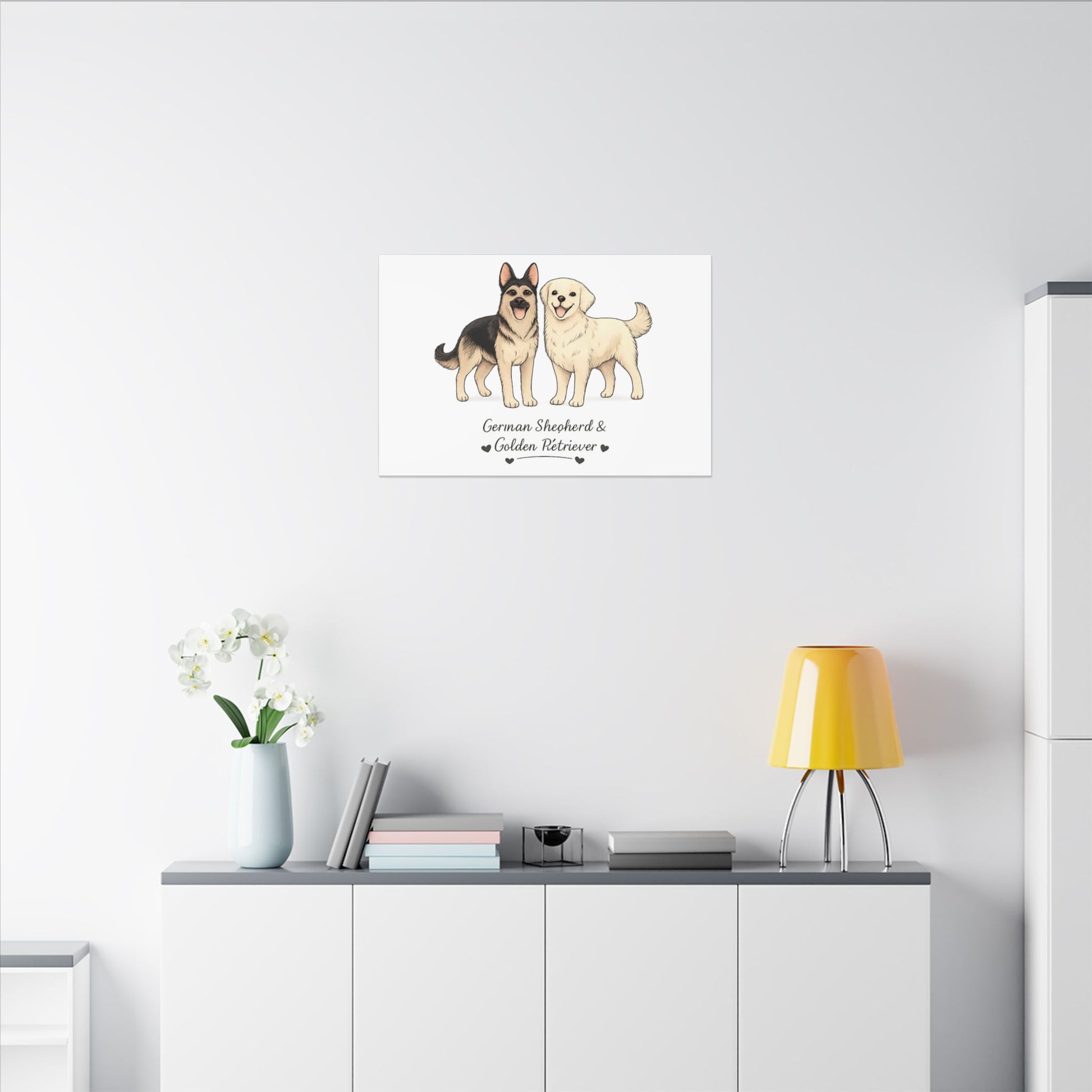 This matte stretched canvas captures a warm, personal moment between two beloved breeds — a German Shepherd and a Golden Retriever — rendered in soft, hand-drawn style on a clean white field. The subtle illustration and delicate script beneath create a quiet, heartwarming focal point that brings a cozy, affectionate energy to any room. Lightweight yet sturdy, the 0.75" stretched edge keeps the image flush and gallery-ready without heavy framing. It hangs securely and stays centered thanks to soft rubber supports on the back, and the archival-quality inks and coated cotton-poly canvas preserve the illustration’s gentle tones for years.