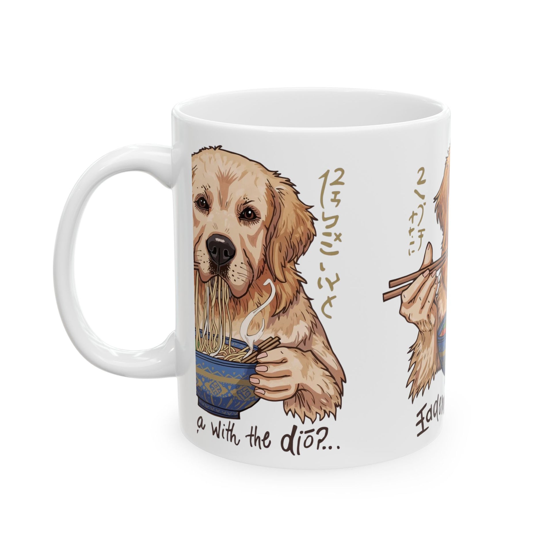 This playful mug features an irresistibly cute dog enjoying a bowl of noodles with chopsticks in paw.