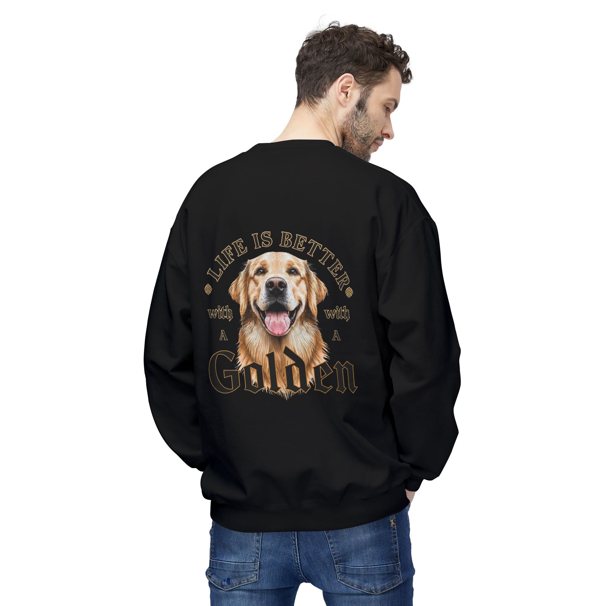 This sweatshirt is designed with a minimal front chest Golden Retriever detail and a bold emotional back artwork that immediately connects with Golden owners