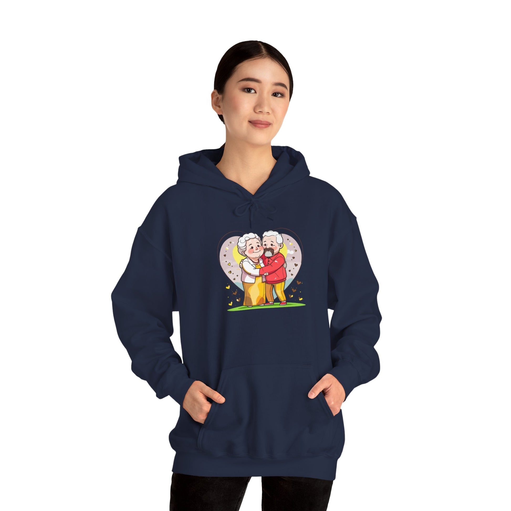 A cozy graphic hoodie featuring a cute grandparents-style couple illustration with a heartwarming vibe.