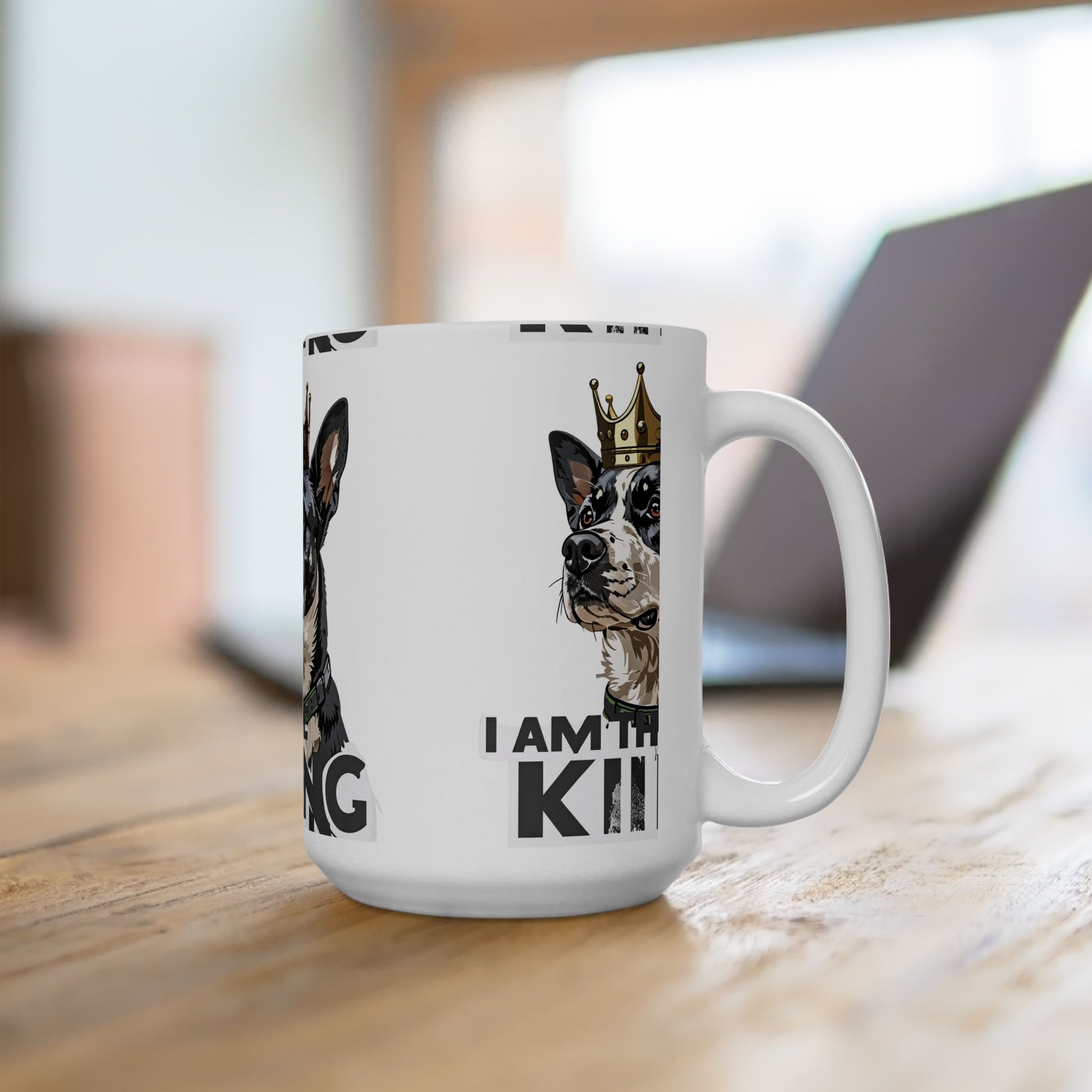 A glossy ceramic mug featuring a crowned dog “I Am the King” design.