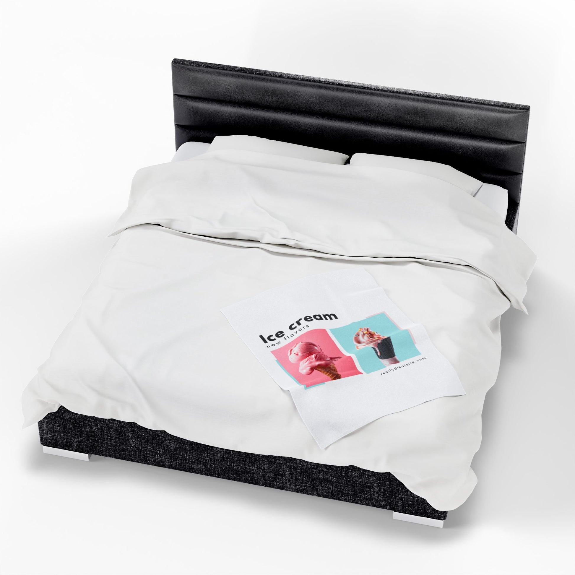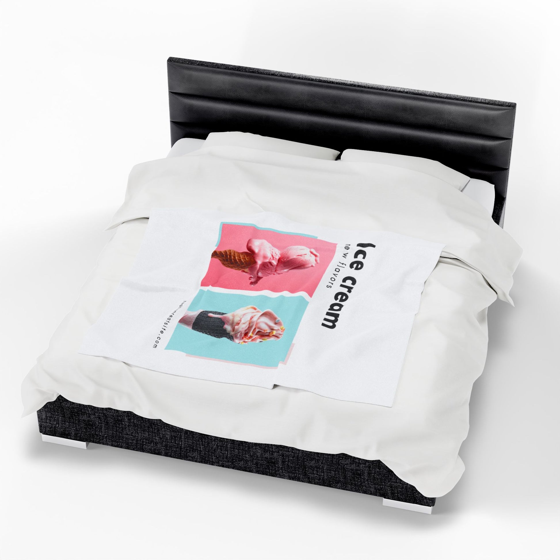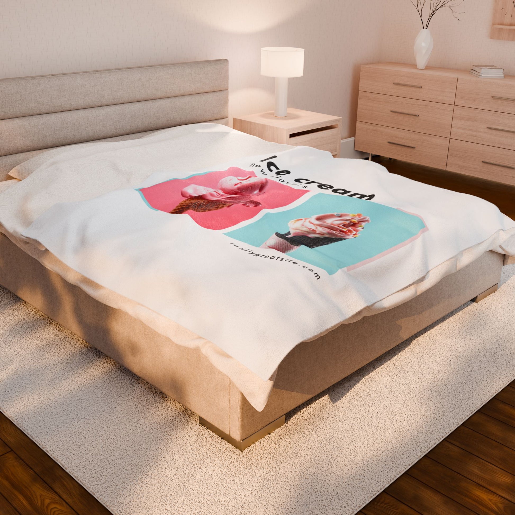 Wrap yourself in a playful, retro-summer mood with this plush velveteen blanket. Soft, slightly weighted fabric carries a crisp, high-detail print of two pastel ice cream cones framed against soft pink and aqua blocks — like a sunlit poster from a neighborhood shop. It feels warm and cushioned on the couch while keeping the colors bright and lively; use it to curl up with a book, brighten a studio apartment, or drape over a chair for an instant pop of joyful color. The design reads fresh and nostalgic, inviting slow afternoons, late-night movie binges, or chilled porch hangs with friends.