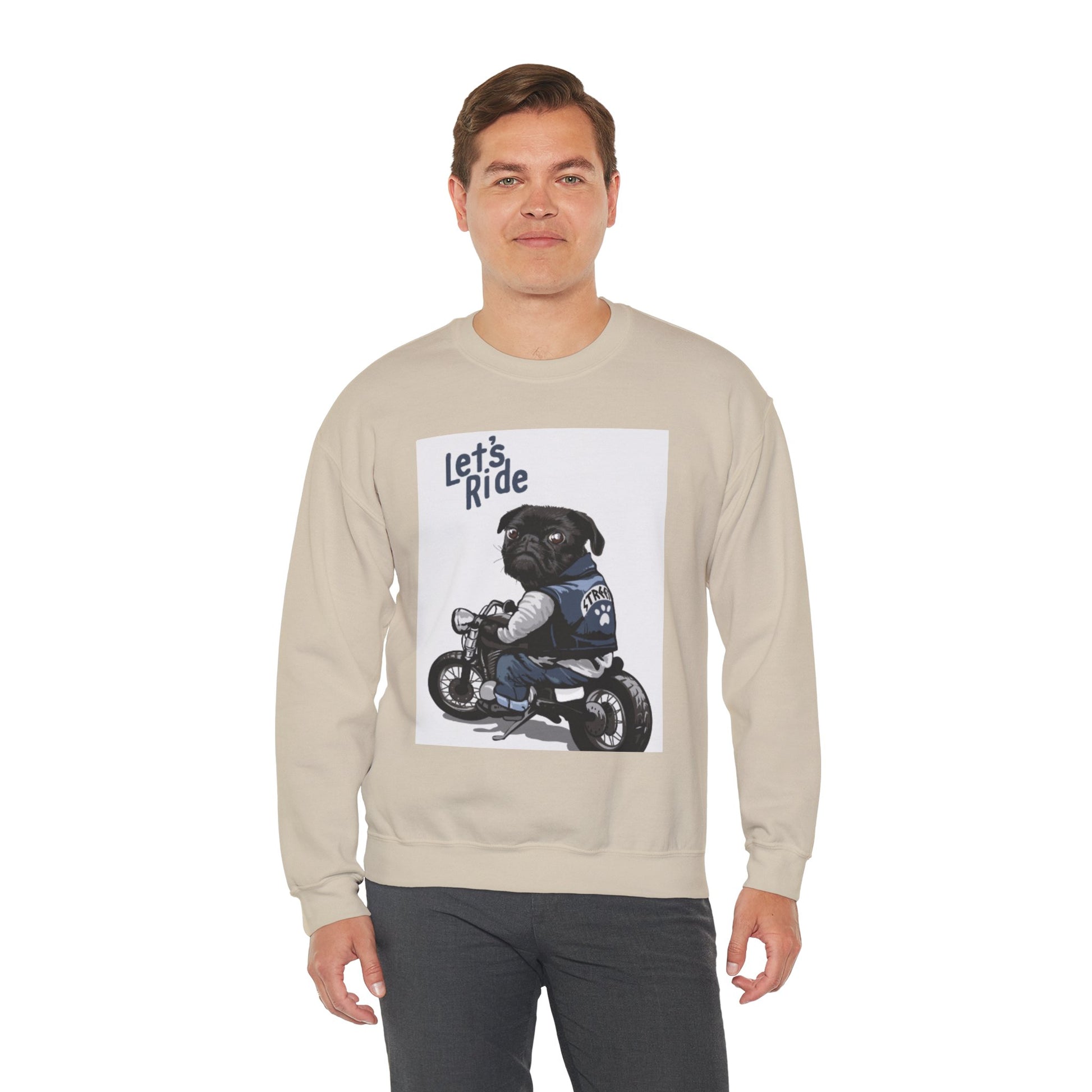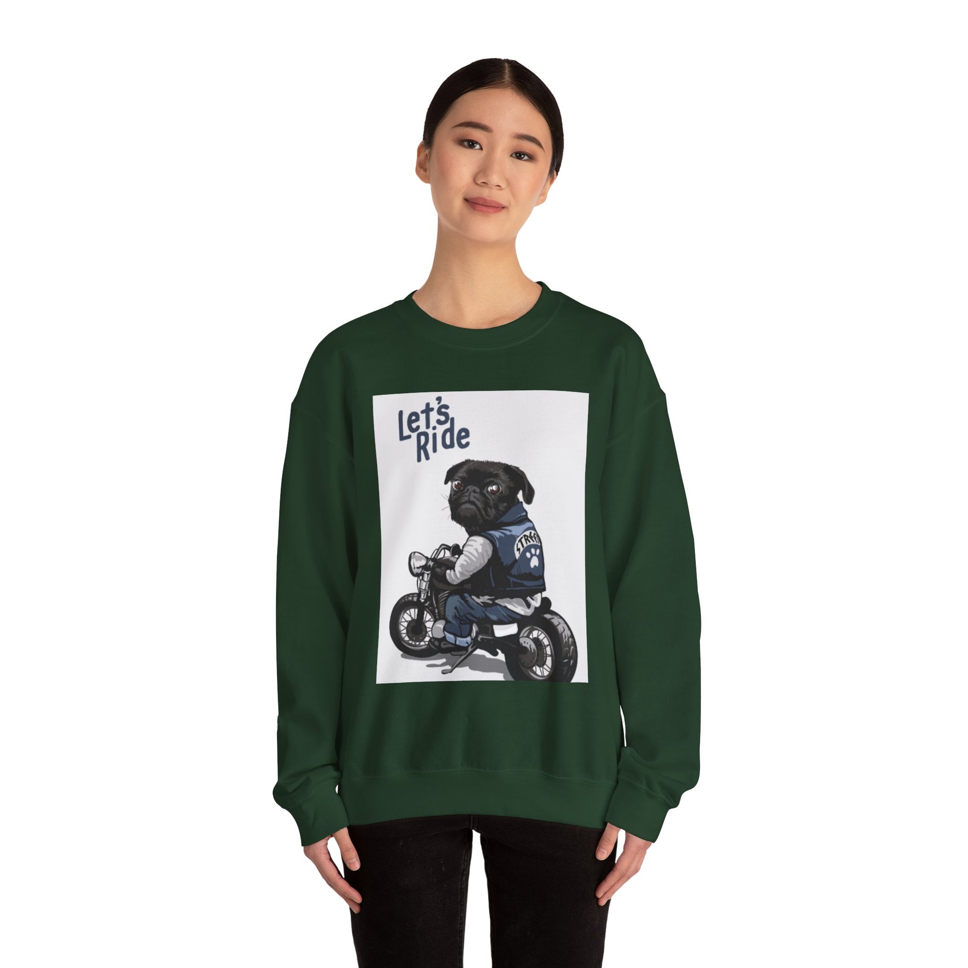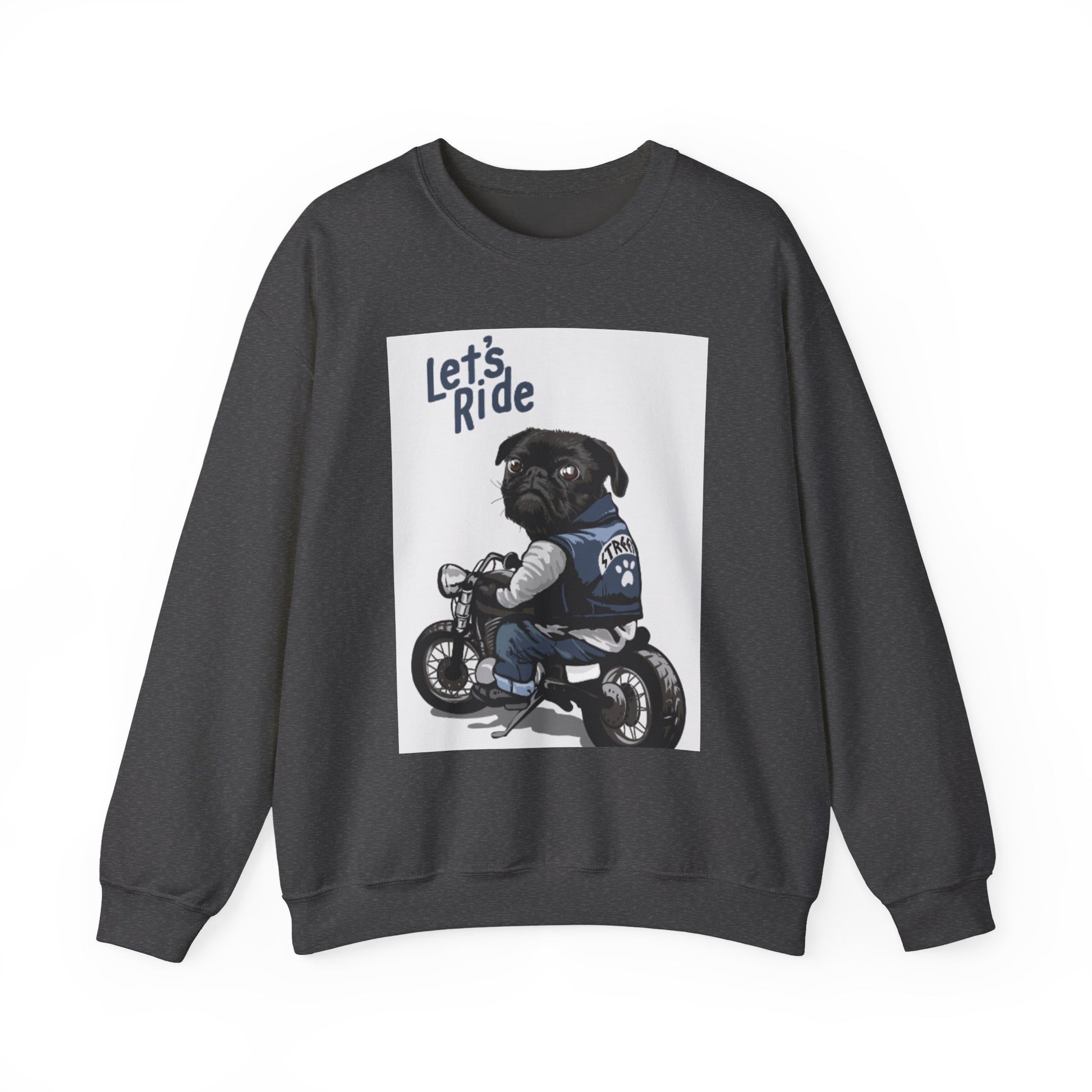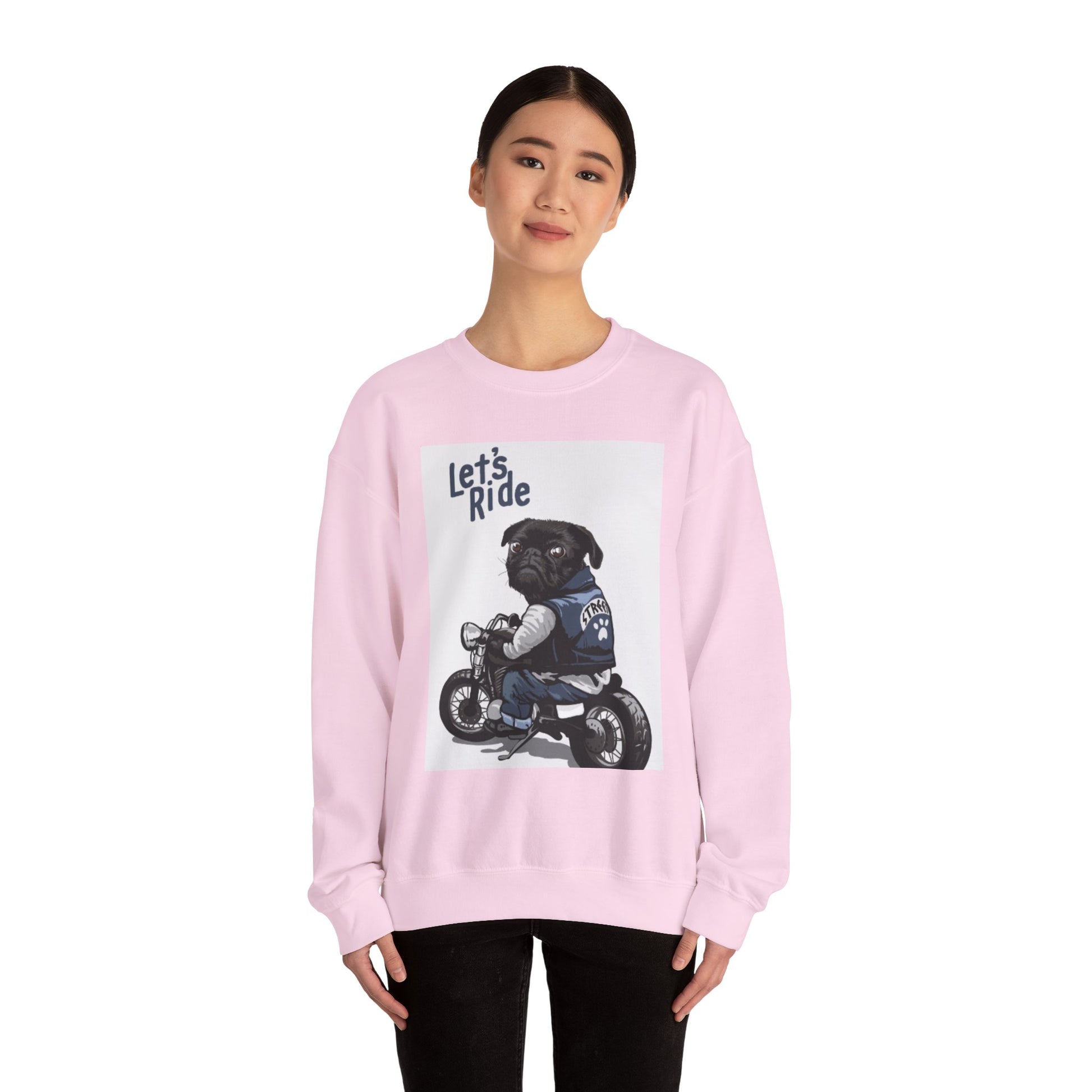 This sweatshirt features a bold illustration of a pug riding a motorcycle, paired with the phrase “Let’s Ride”—capturing freedom, confidence, and a sense of fun in one clean design.