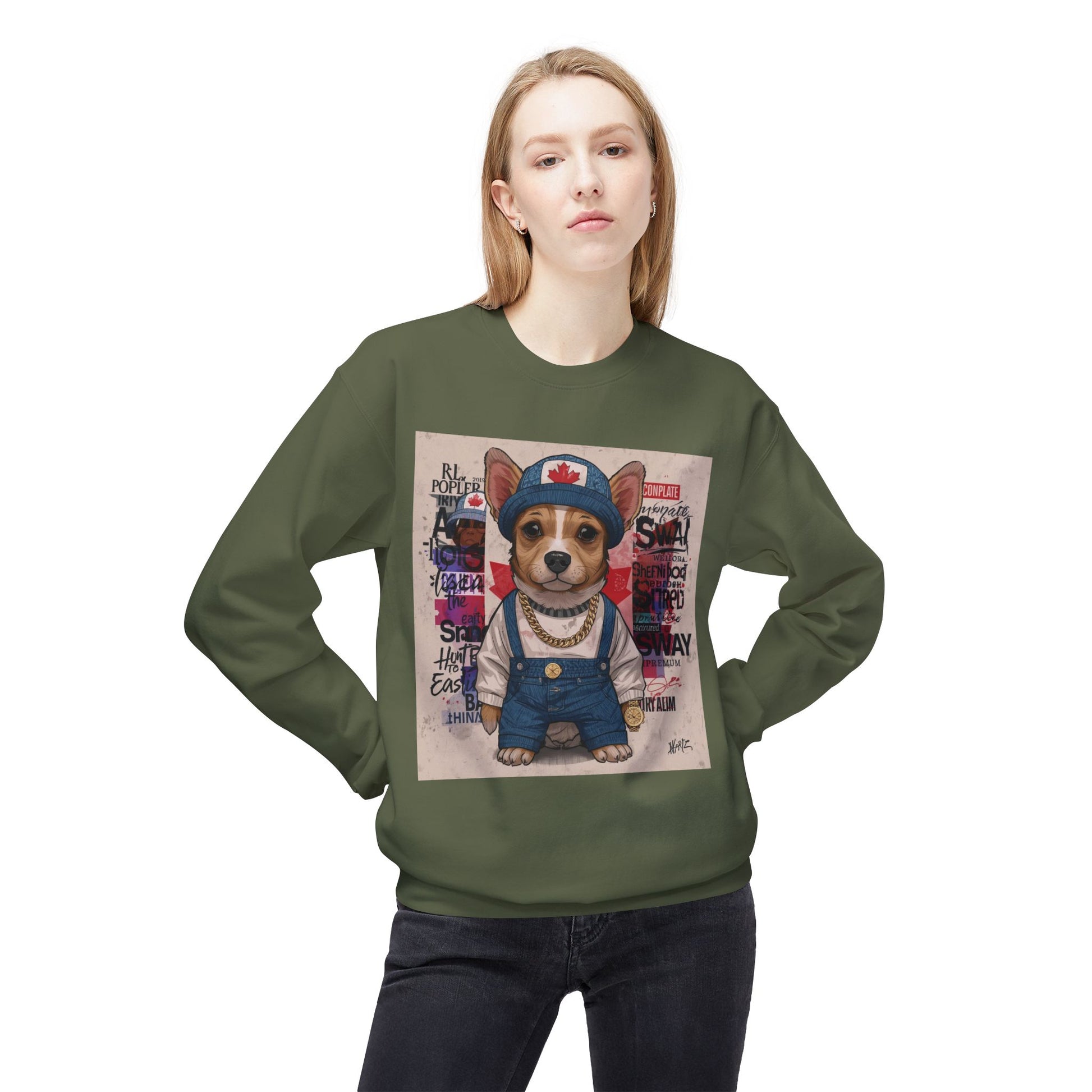 This sweater features a bold, character-style dog illustration inspired by street art and playful confidence.