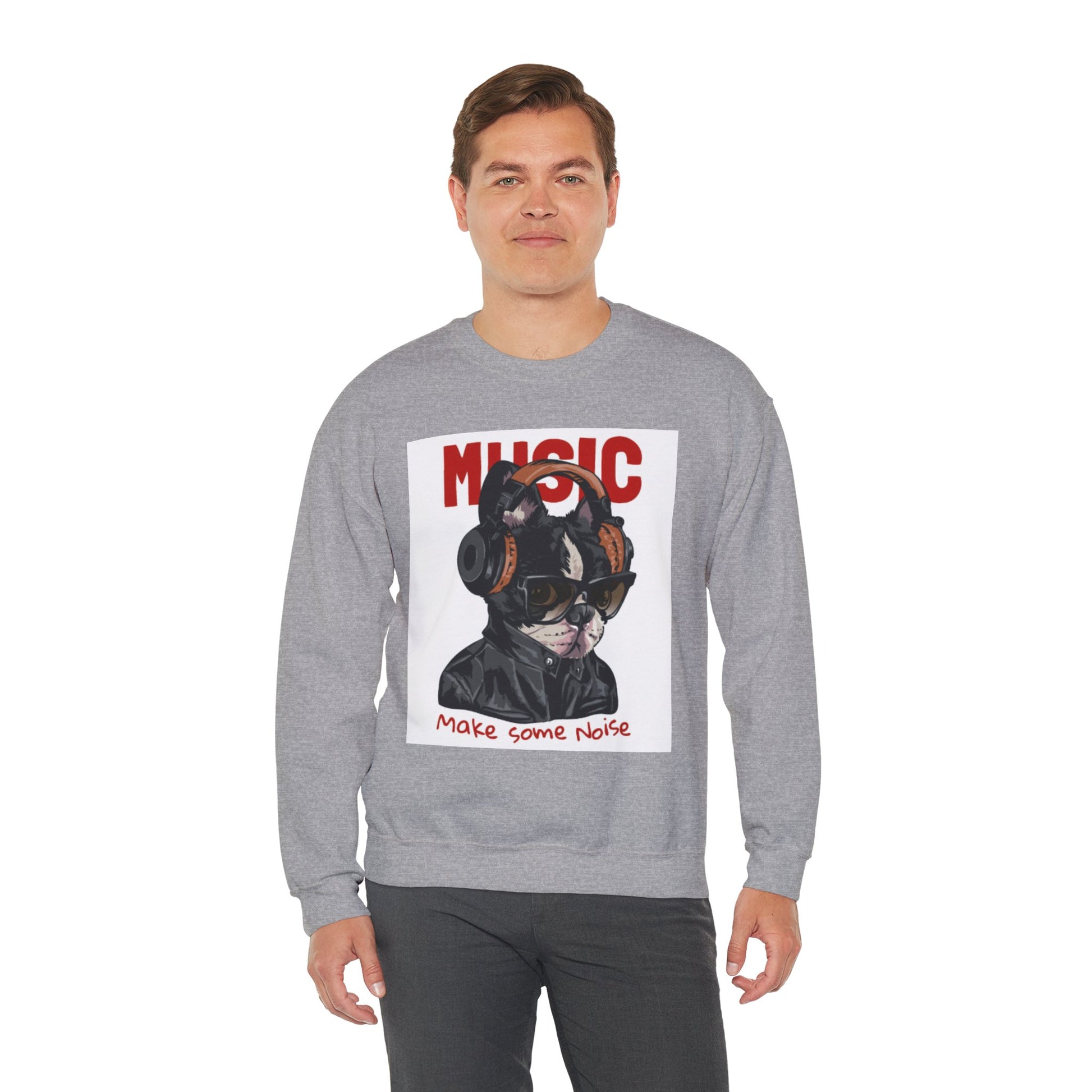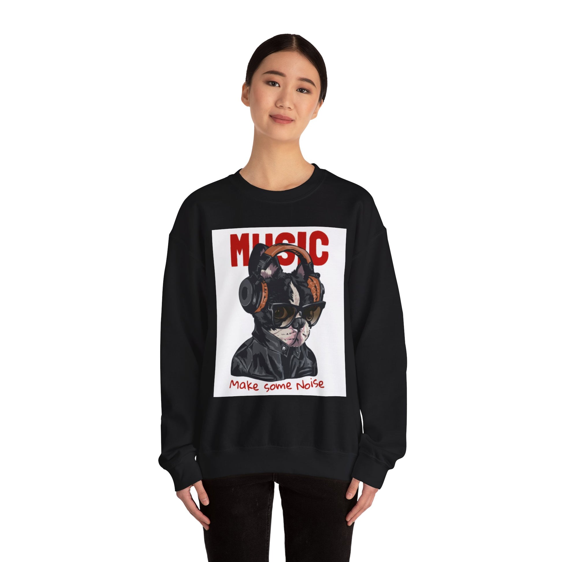 This sweatshirt features a striking dog portrait rocking headphones and shades, paired with the statement “MUSIC — Make Some Noise.”