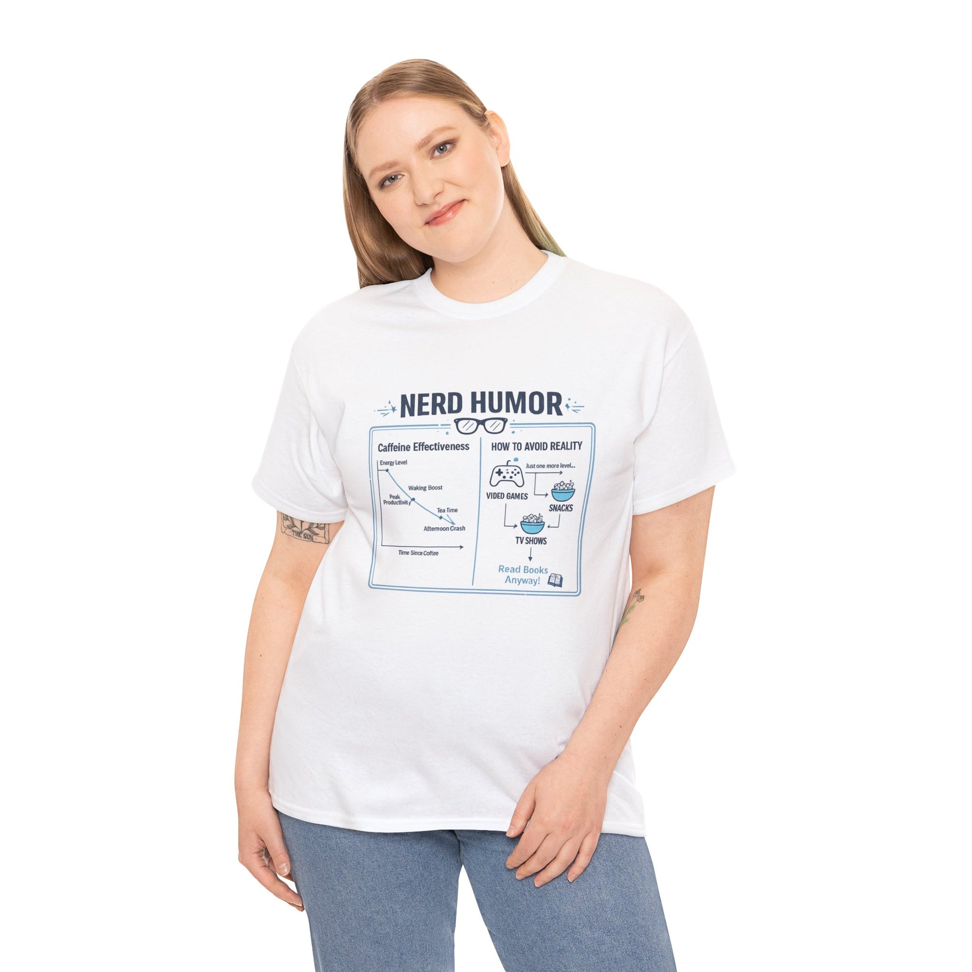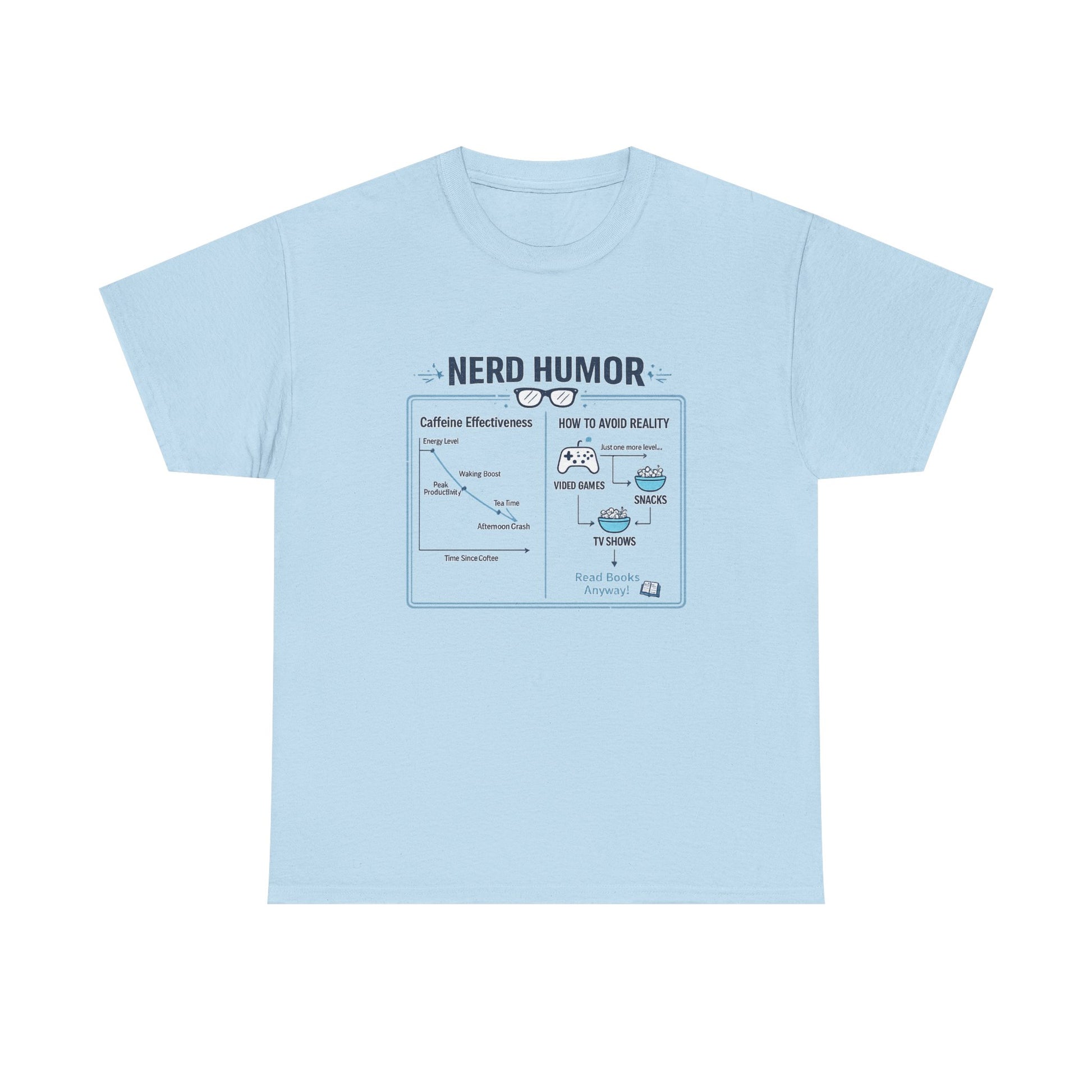 This T-shirt showcases the same front-only “Nerd Humor” caffeine chart graphic, delivering dry humor and everyday truth in a clean, easy-to-read layout.