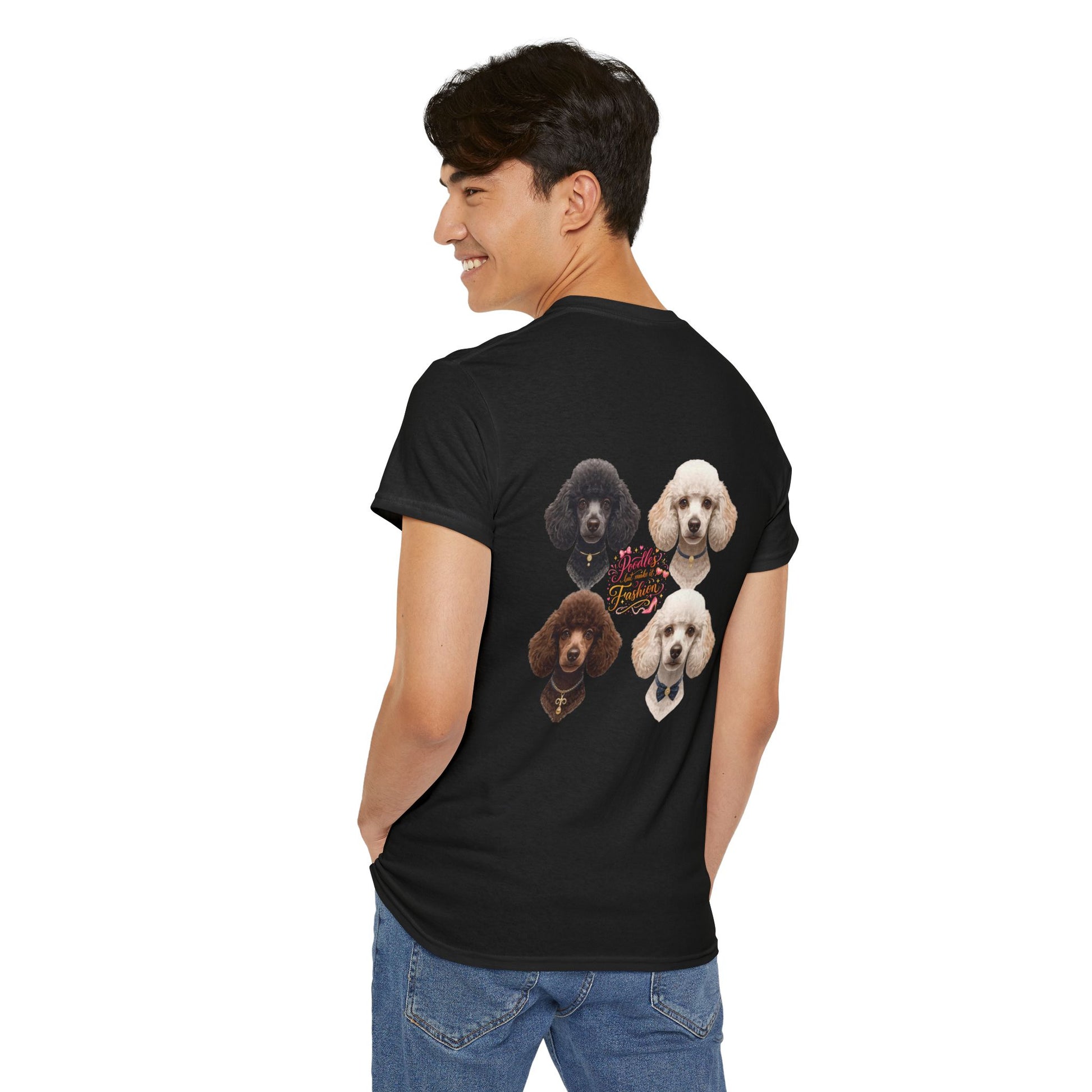 Minimal front poodle emblem with a bold four-poodle fashion portrait on the back made for true poodle lovers