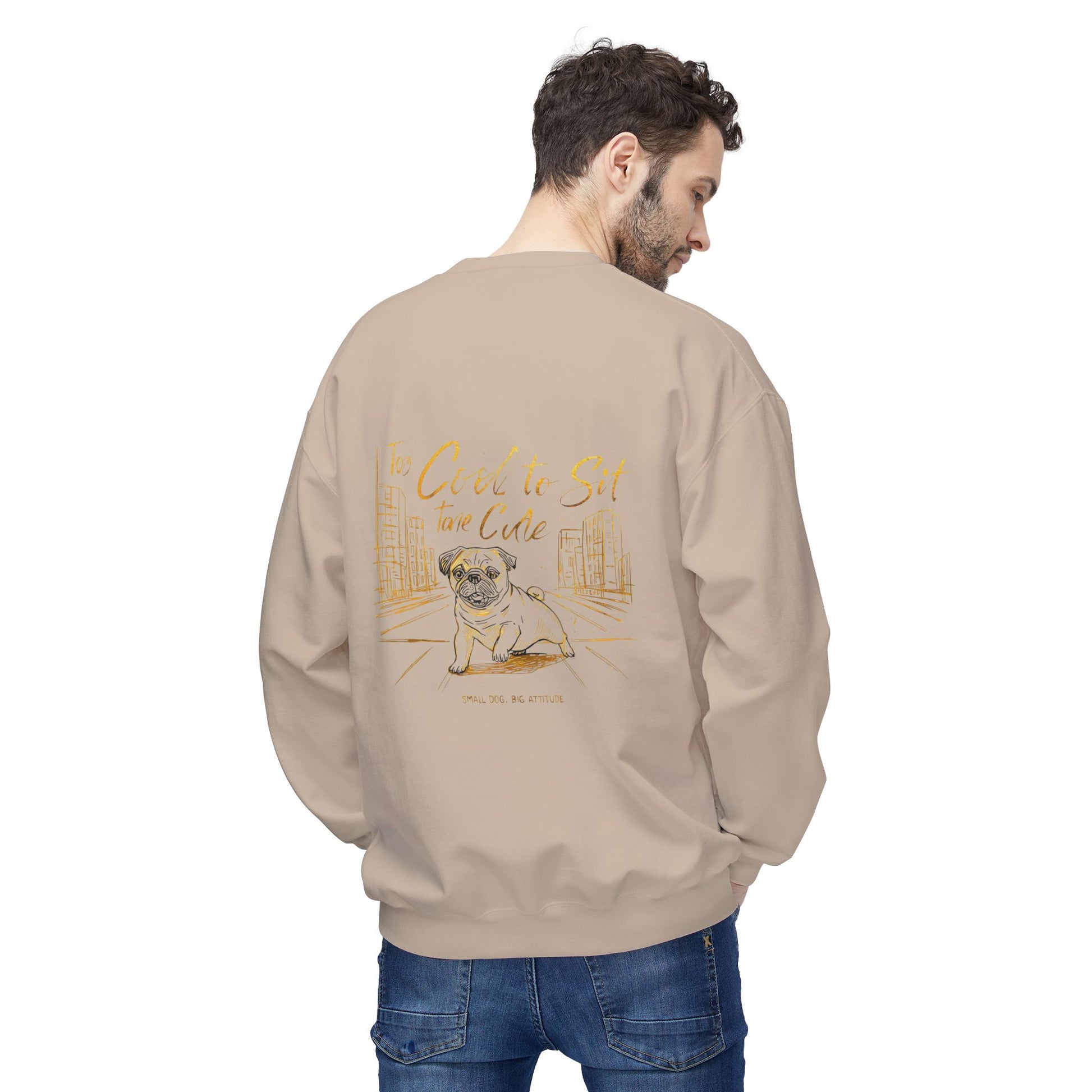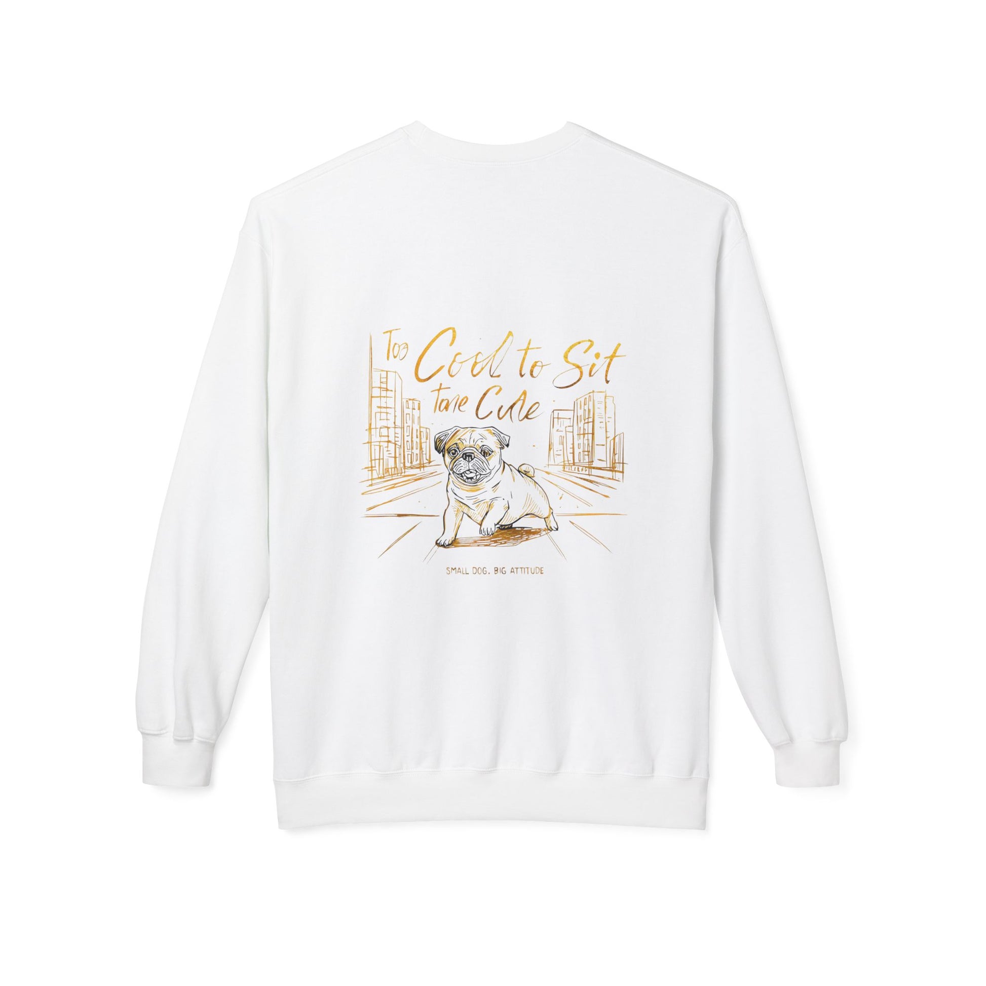 The back showcases a large hand-drawn style pug illustration with the phrase “Too Cool To Sit Take a Cue” and the tagline “Small Dog Big Attitude”